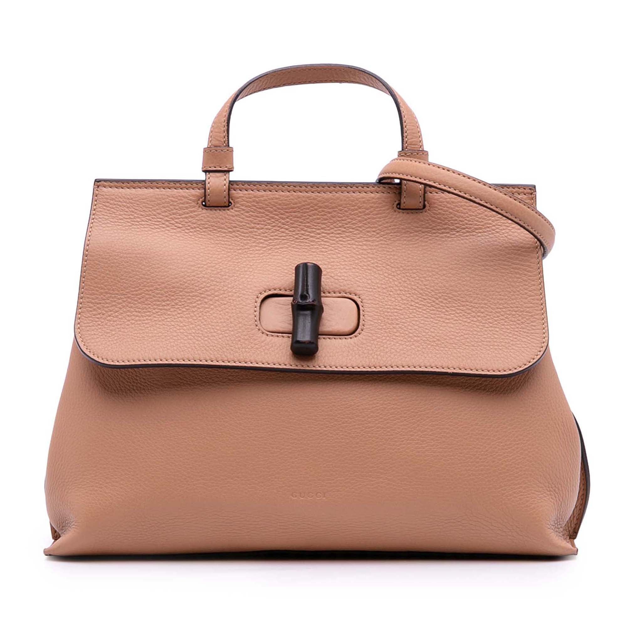 Product Details: Brown Gucci Medium Leather Bamboo Daily Satchel. The Daily satchel features a leather body, a flat leather top handle, a detachable flat leather strap, a front flap with a bamboo bullet twist lock closure, and interior zip and slip pockets. 4.3" L x 13" W x 4.5" D, 3.5" drop. Serial number 392013 525040.