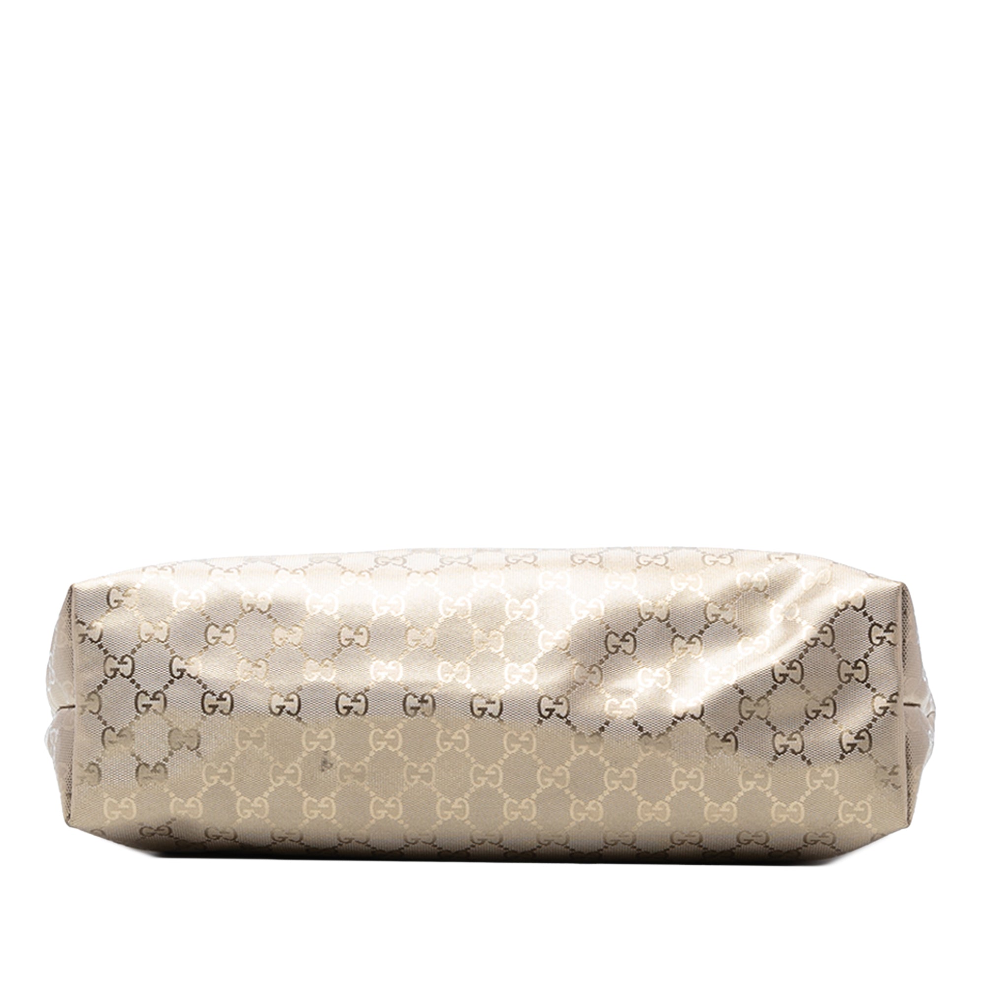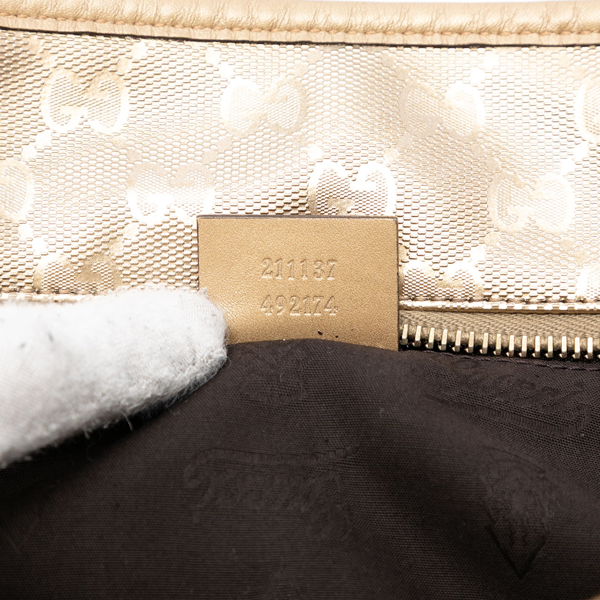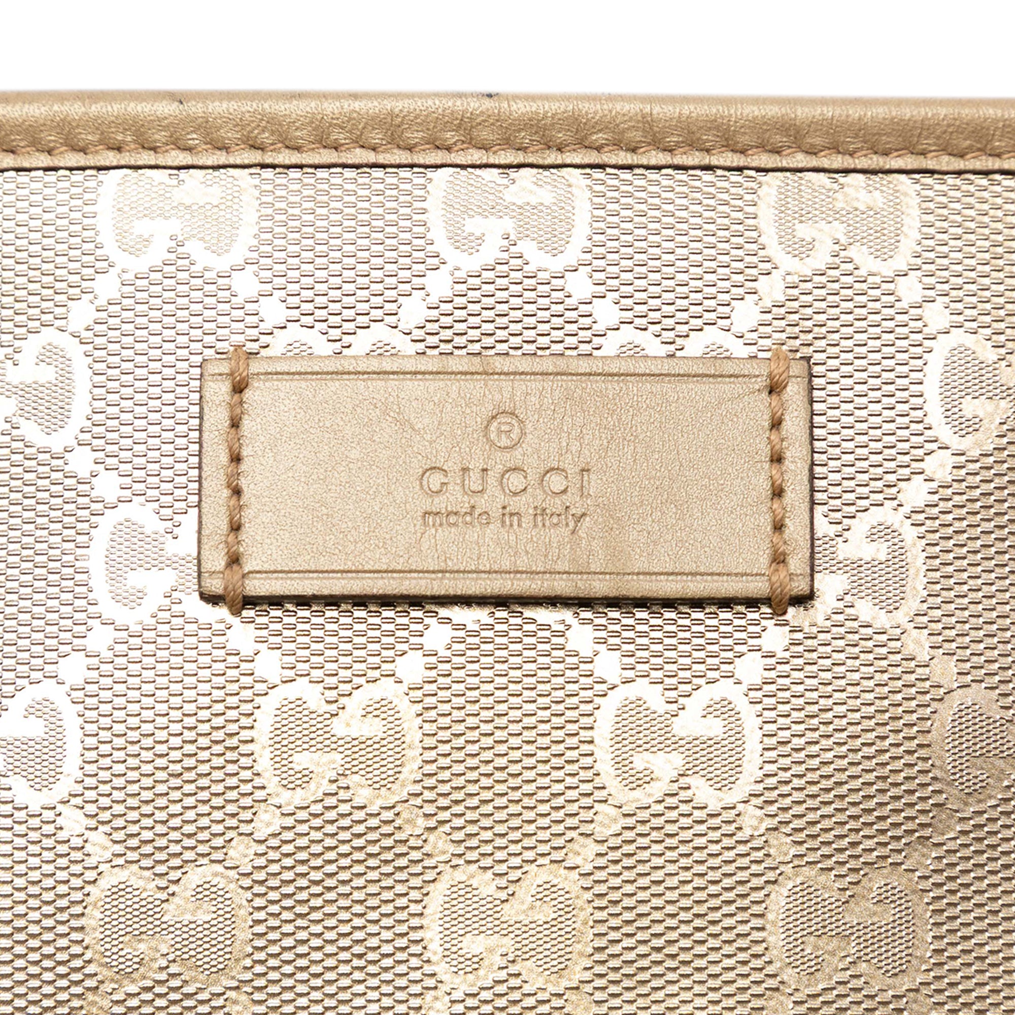 Product Details: Gold Gucci Medium GG Imprime Tote. This tote bag features a coated canvas body, flat leather straps, a top zip closure, and interior slip and zip pockets. 11" L x 15" W x 4.3" D, 7.5" drop. Serial number 211137 492174.