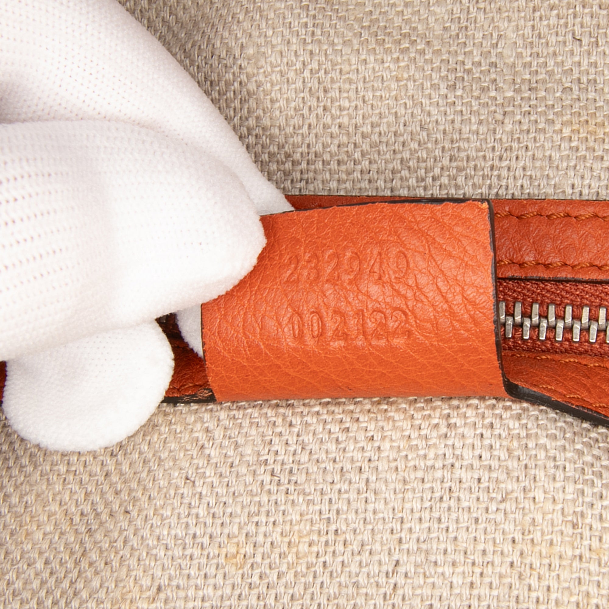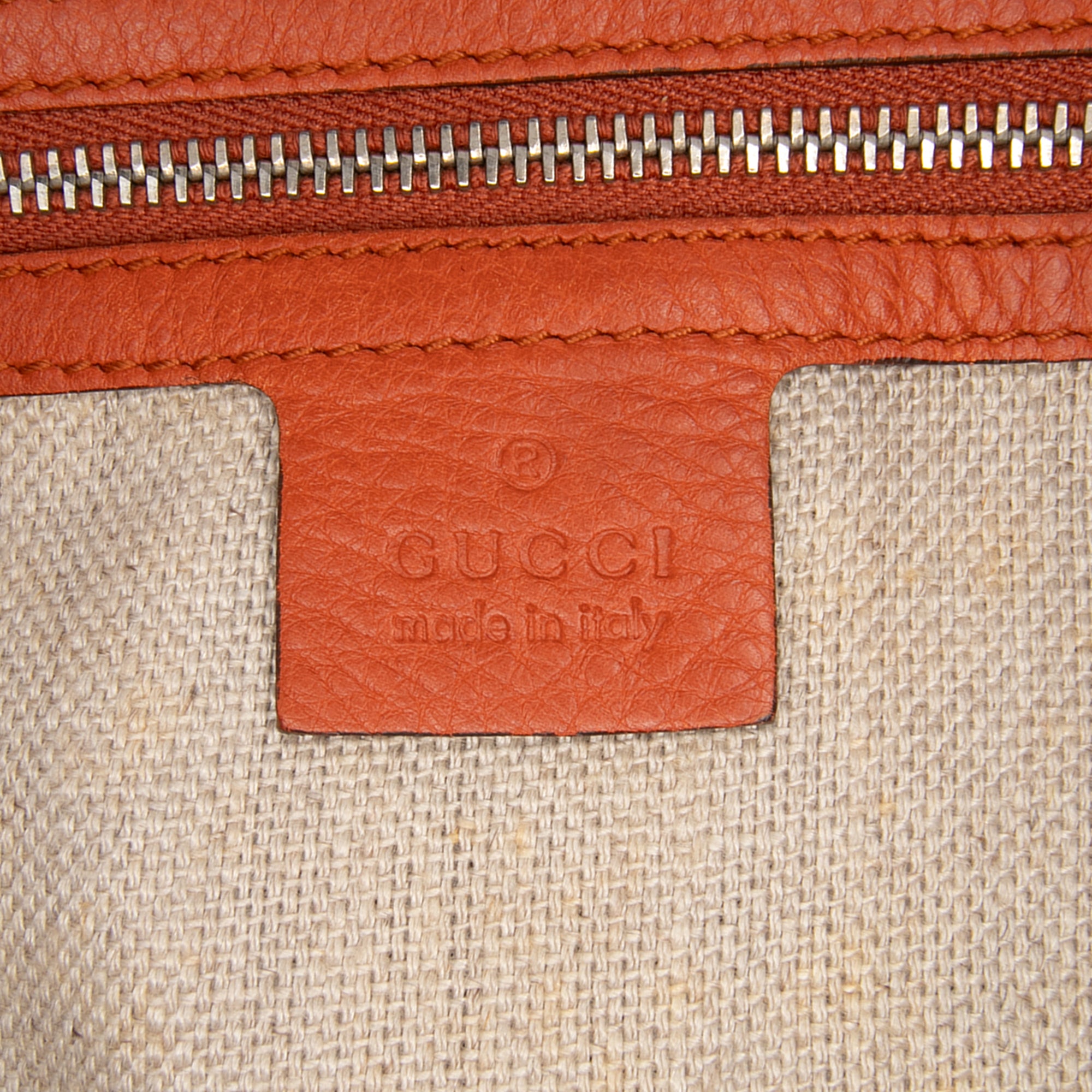 Product Details: Orange Gucci Large Pebbled Calfskin Icon Bit Satchel. This satchel features a leather body, flat leather handles, a detachable flat leather strap, a top zip closure, and interior zip and slip pockets. 13" L x 15" W x 4.7" D, 7.5" drop. Serial number 232949 02122.