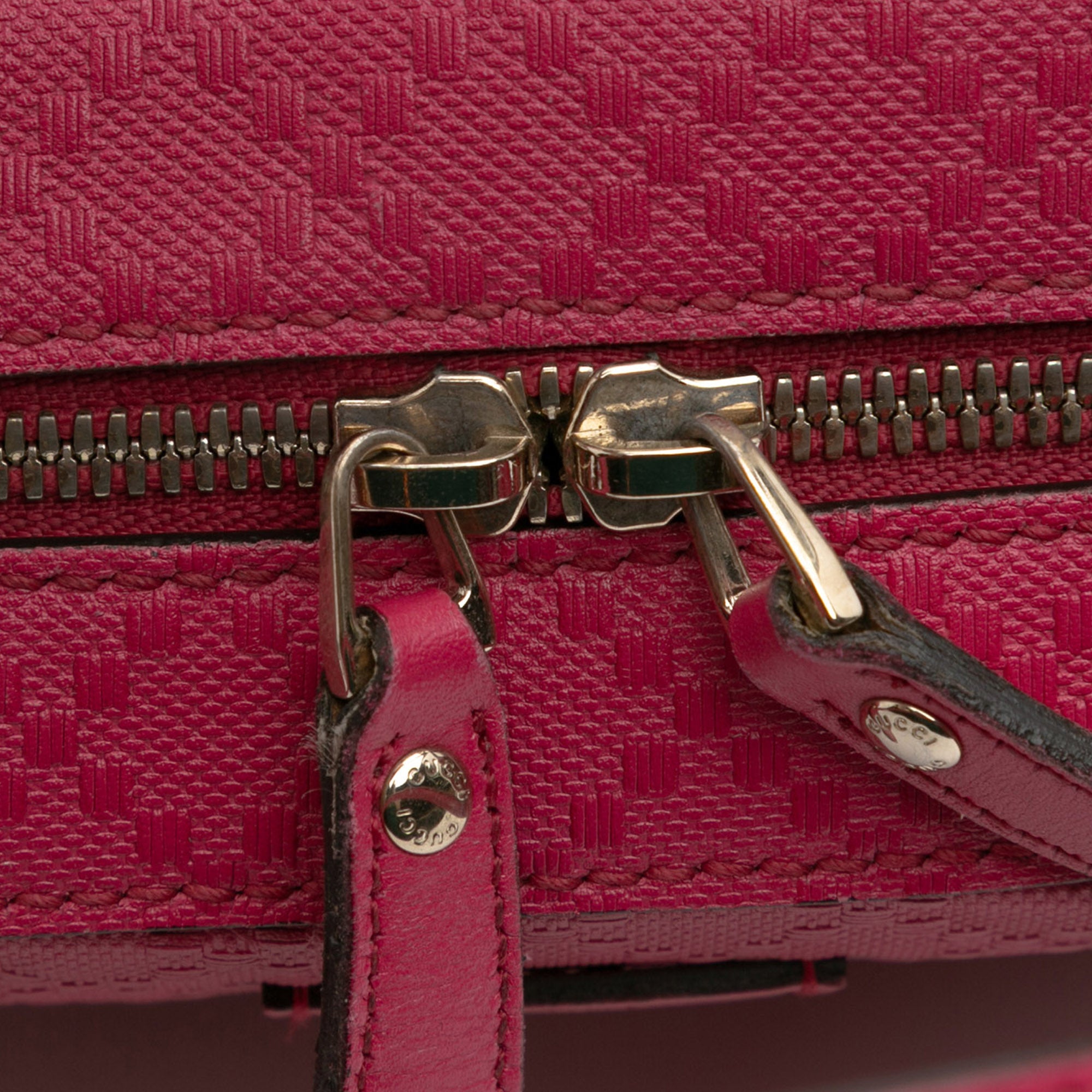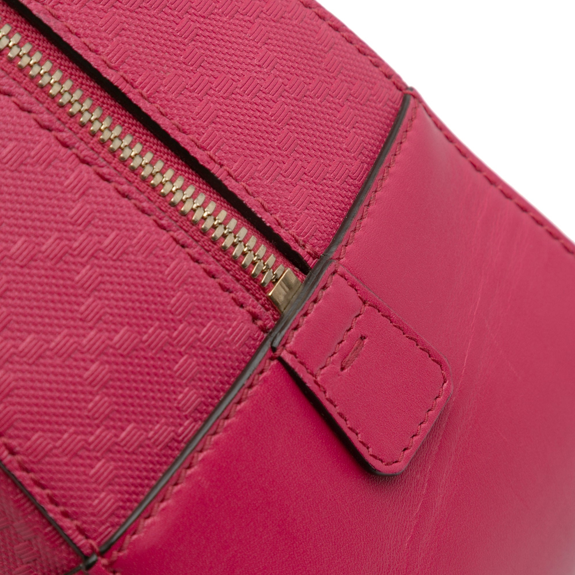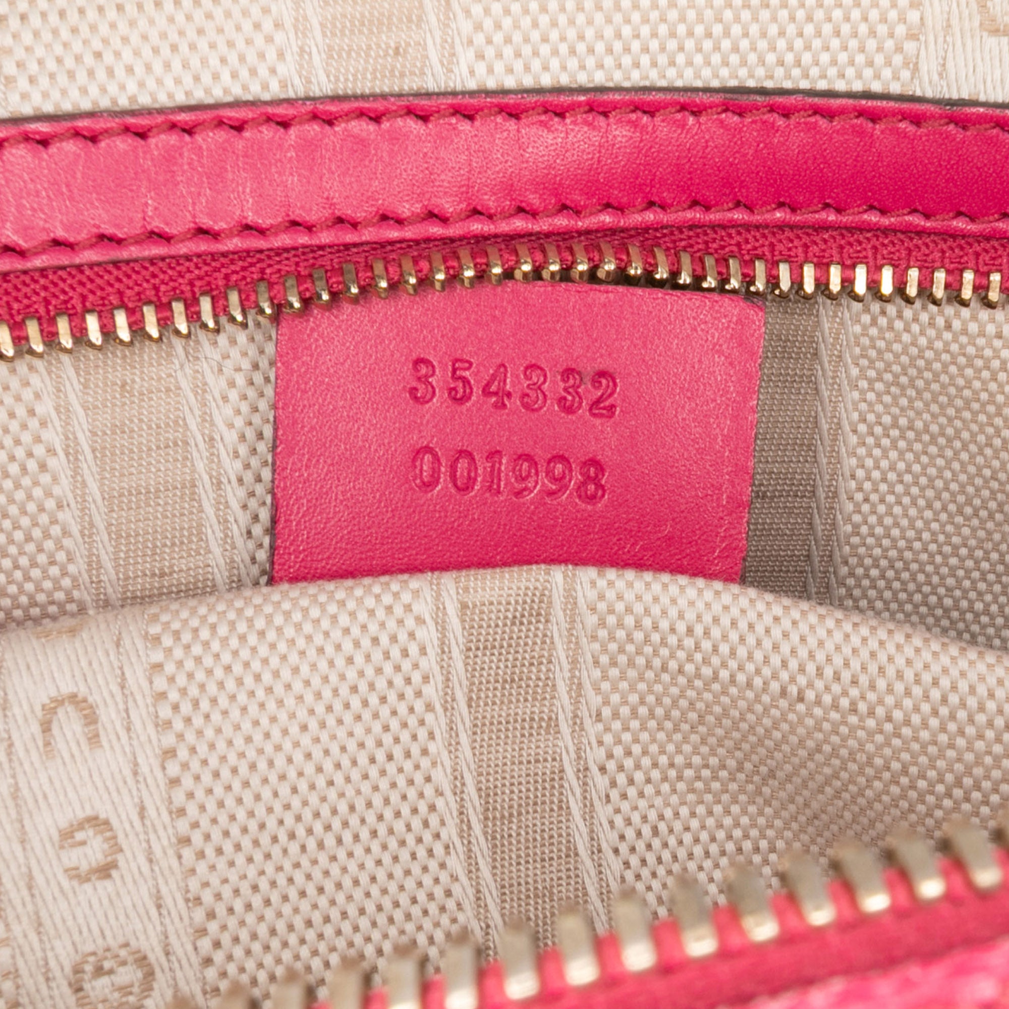 Product Details: Pink Gucci Diamante Bright Leather Satchel. The Bright satchel features an embossed leather body, rolled leather handles, a detachable flat shoulder strap, a top zip closure, and interior zip and slip pockets. 9.4" L x 13.6" W x 4.9" D, 4.3" drop. Serial number 354332 001998.
