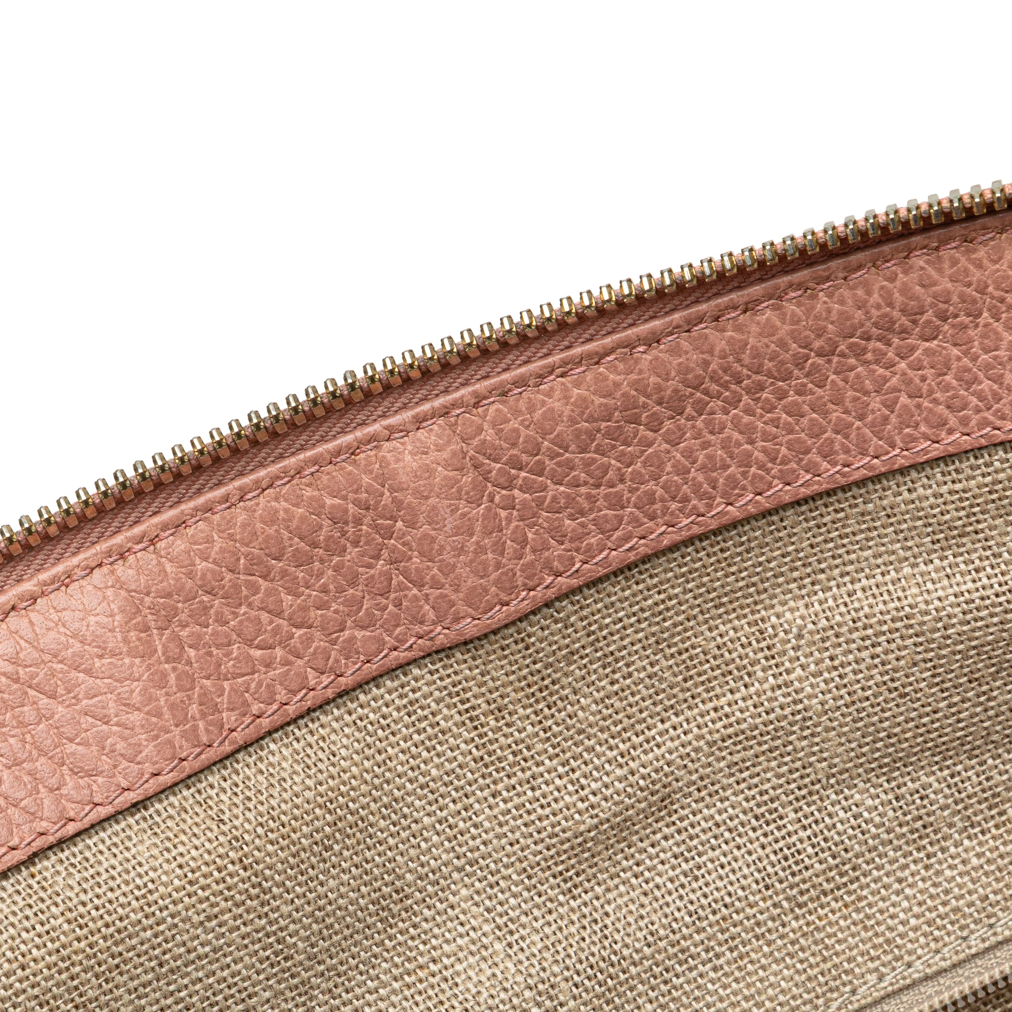 Product Details: Pink Gucci Medium Leather GG Charm Dome Satchel. This satchel features a leather body with interlocking G charm, rolled handles, a detachable flat strap, a top zip closure, and interior zip and slip pockets. 9.4" L x 12.2" W x 59.8" D, 5.5" drop. Serial number 449651 493075.