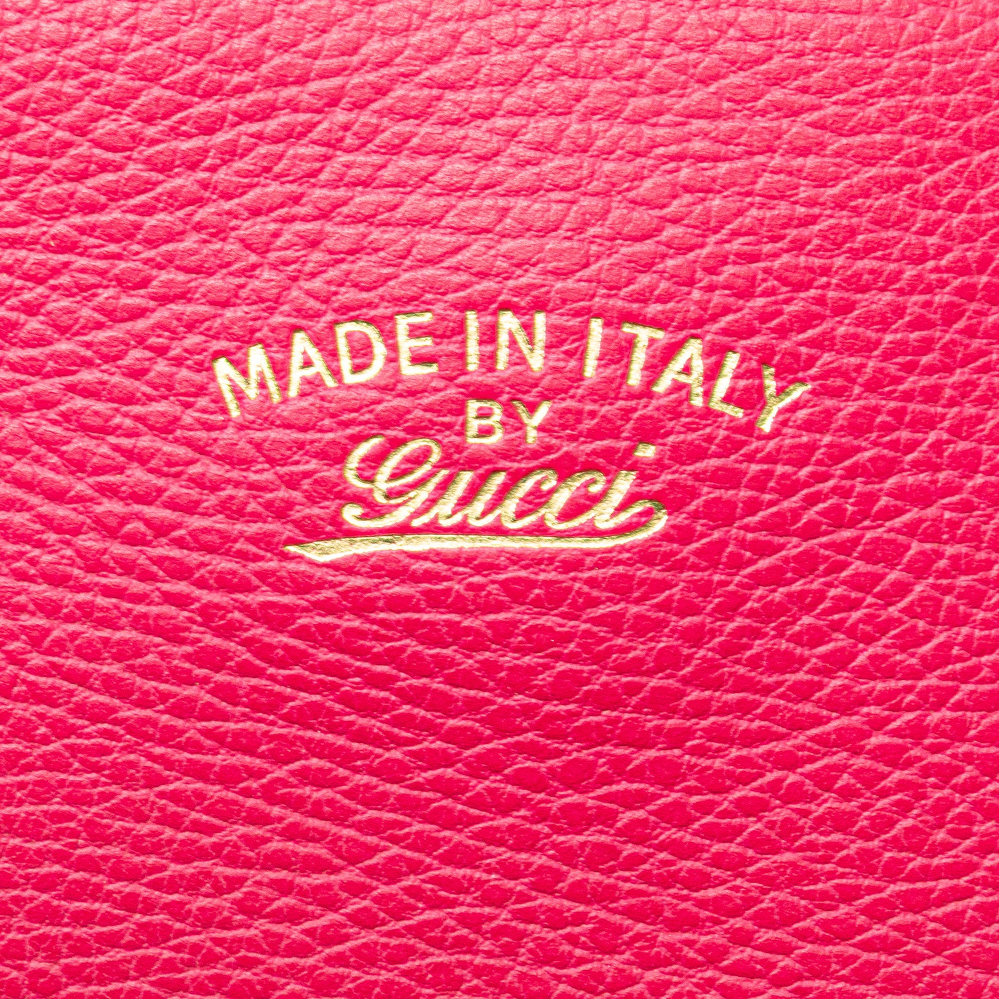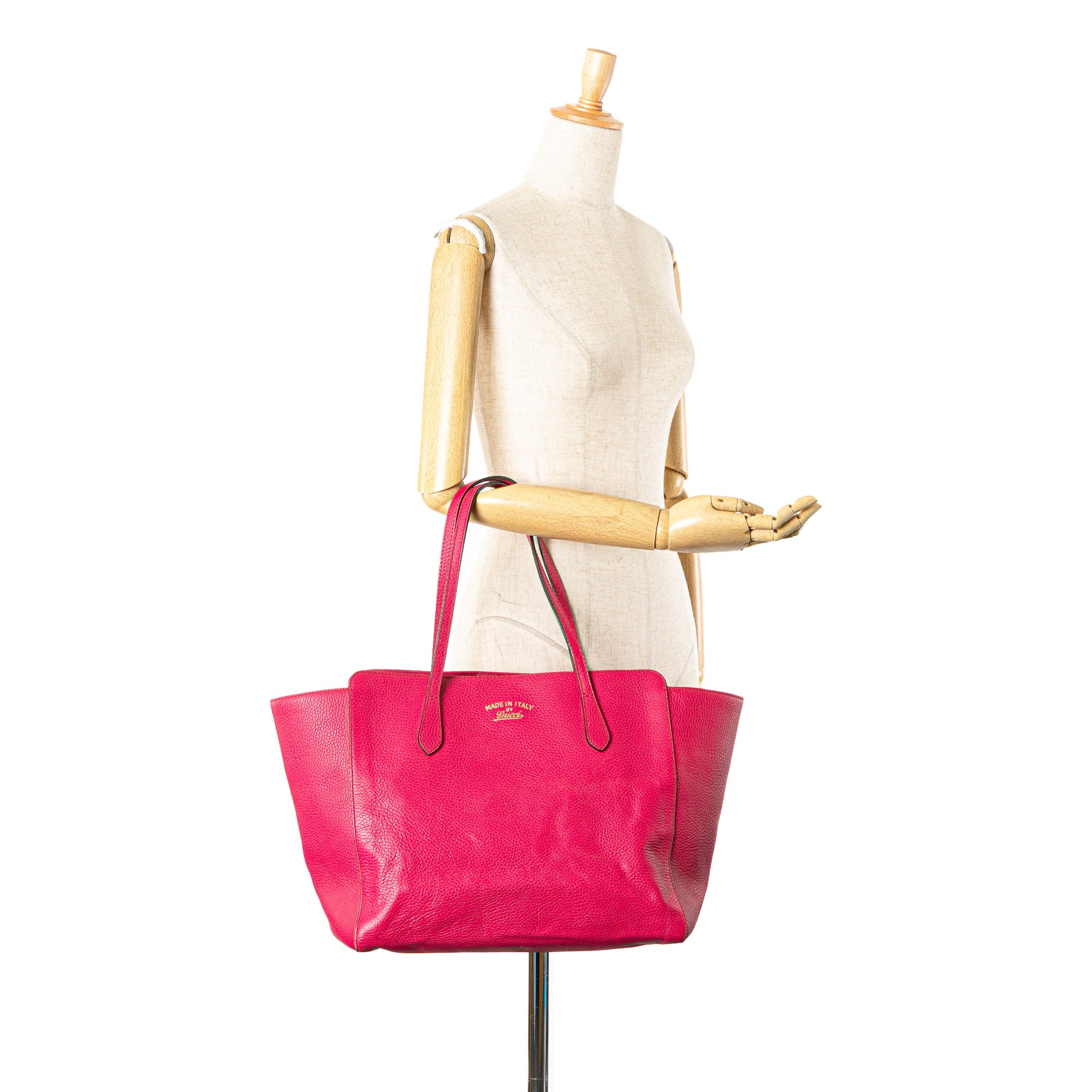 Product Details: Pink Gucci Medium Leather Swing Tote. The Swing tote bag features a leather body, flat leather shoulder straps, an open top with magnetic closure, and interior zip and slip pockets. 11" L x 13.2" W x 6.3" D. Serial number 354397 498879.