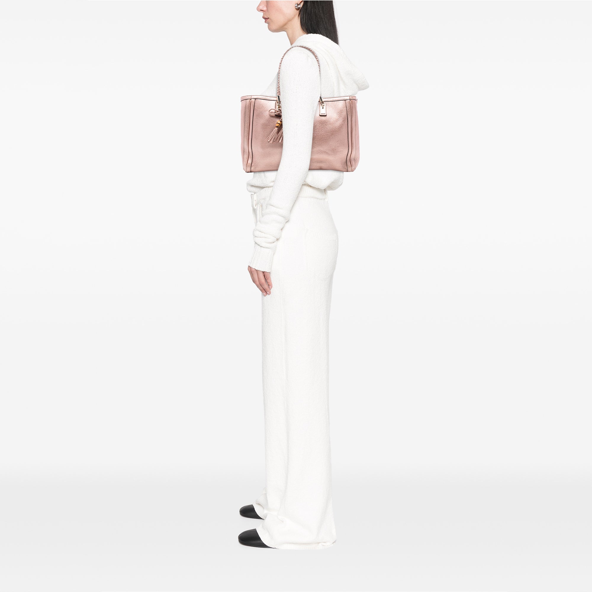 Product Details: Pink Gucci Medium Metallic Leather Bella Tote. The Bella tote bag features a metallic leather body, braided straps, an open top with lobster clasp closure, an interior zip compartment, and interior zip and slip pockets. 9.8" L x 14.6" W x 6.1" D, 7.9" drop. Serial number 269945 520981.