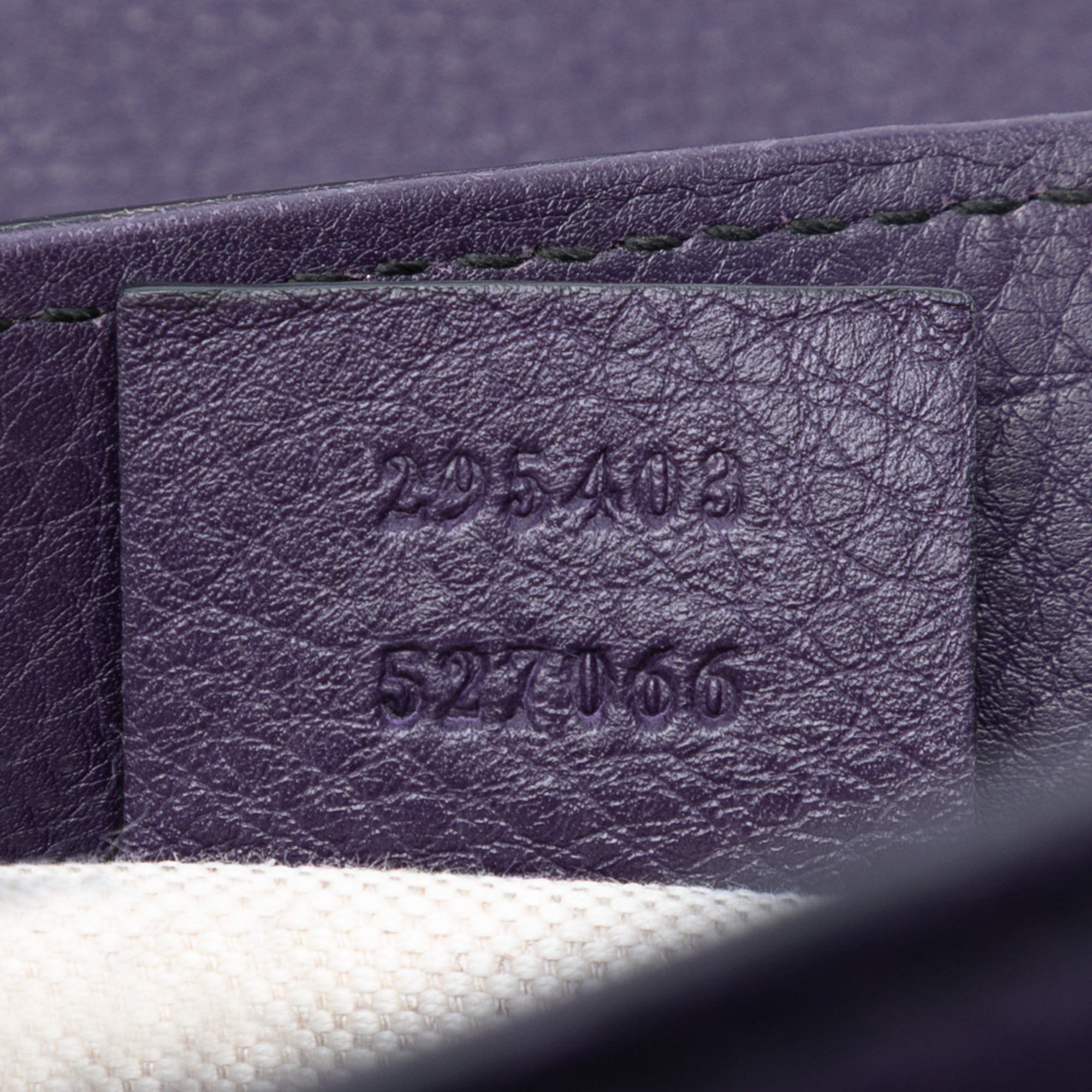 Product Details: Purple Gucci Large Leather Emily Shoulder Bag. The Emily shoulder bag features a leather body, chain straps with flat leather shoulder guards, a front flap with slip through closure, and interior zip and open pockets. 9.3" L x 14.2" W x 3.7" D. Serial number 295403 527066.