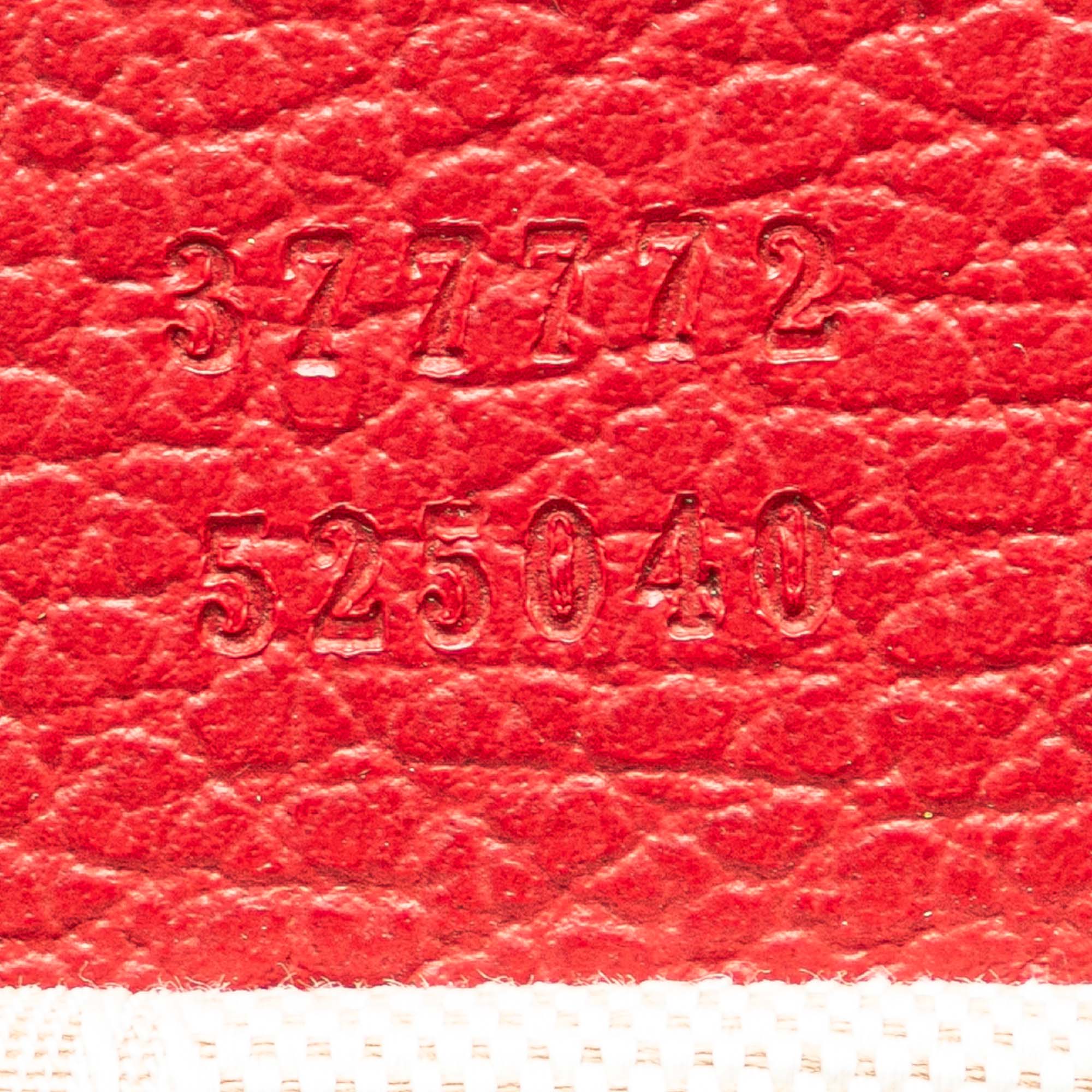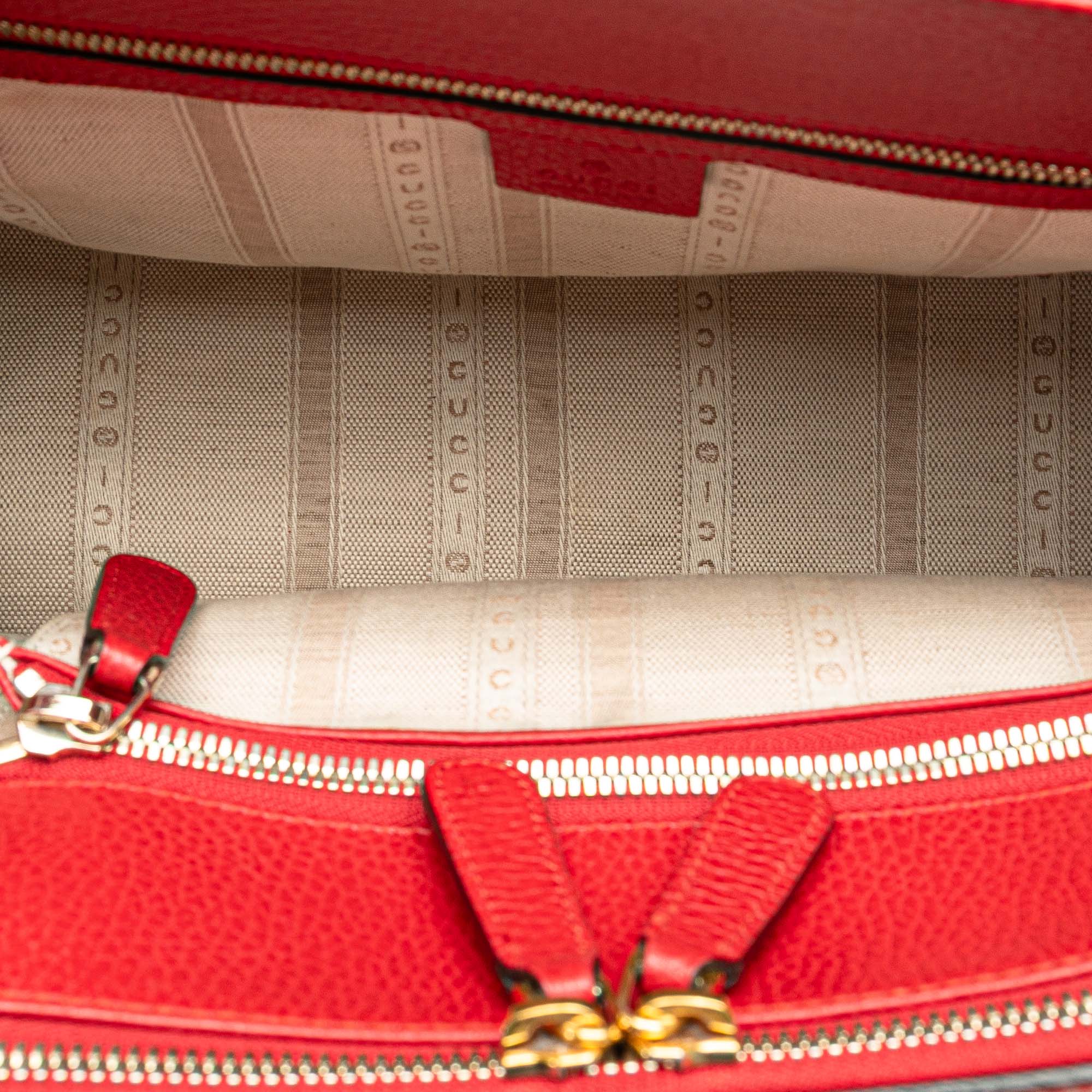 Product Details: Red Gucci Calfskin Swing Top Handle Satchel. The Swing features a leather body, flat leather top handles, a detachable flat leather strap, an open top, an interior side zip compartment, and interior zip pockets. 8.3" L x 12.6" W x 5.5" D, 4.3" drop. Serial number 377772 525040.