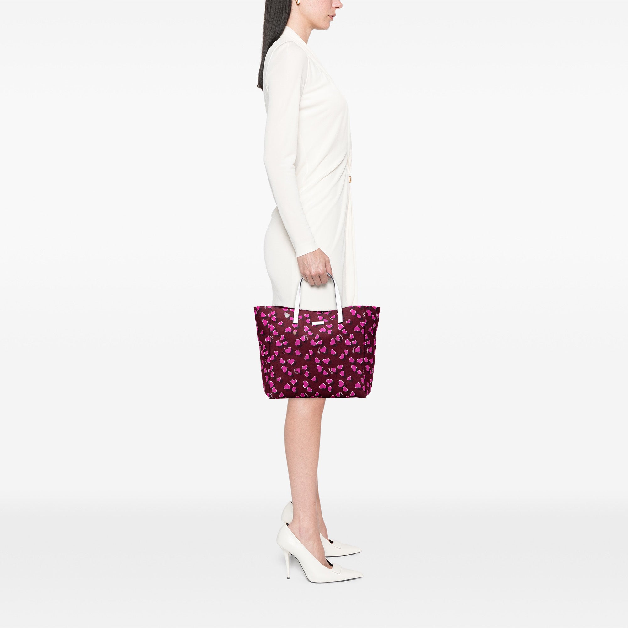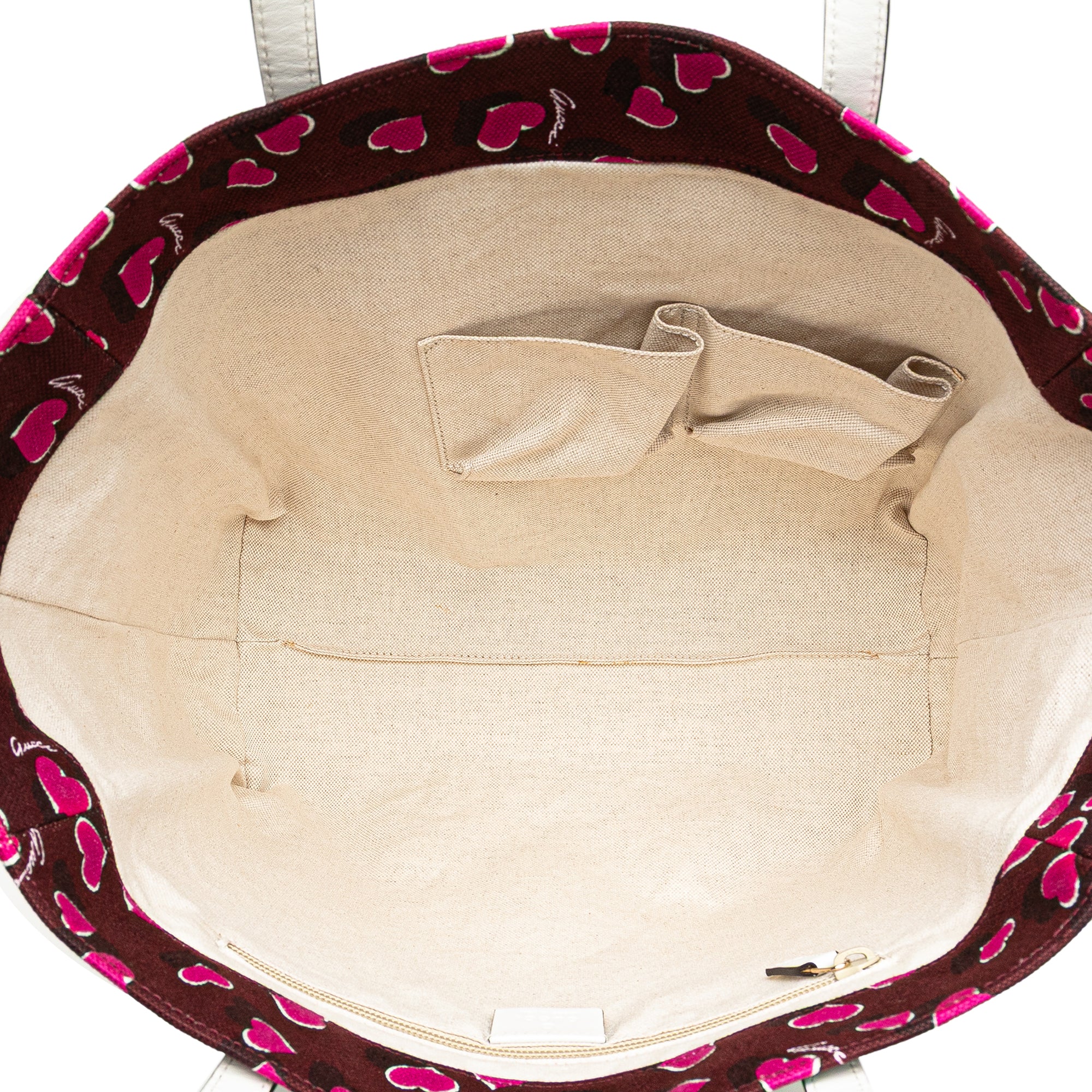 Product Details: Red Gucci Canvas Heartbeat Tote. This tote bag features a printed canvas body, flat leather straps, an open top, and interior zip and slip pockets. 11.4" L x 11.8" W x 5.9" D, 5.1" drop. Serial number 282439 502752.