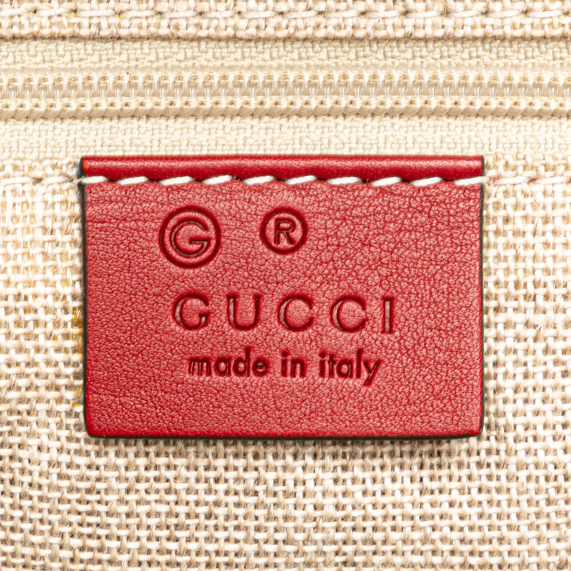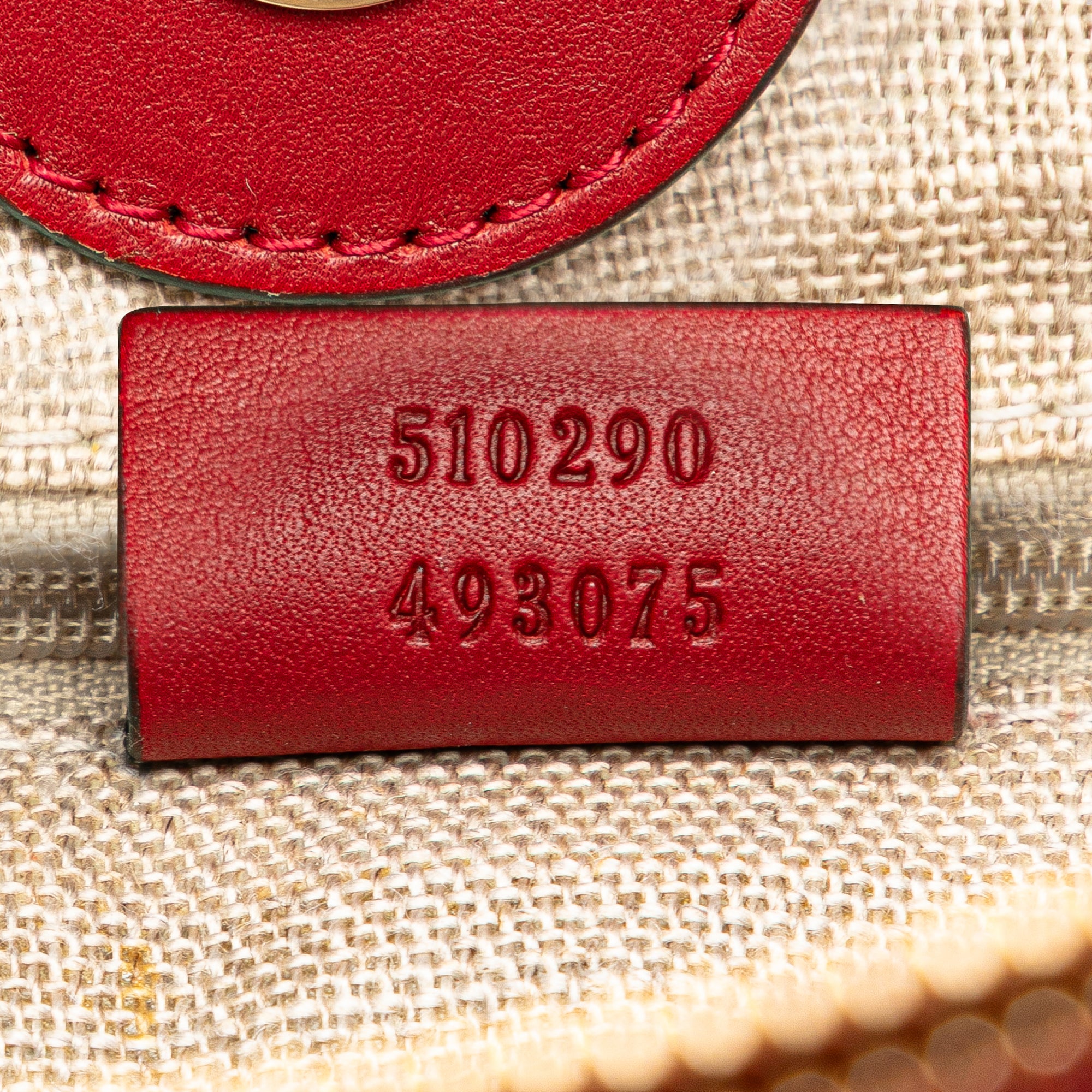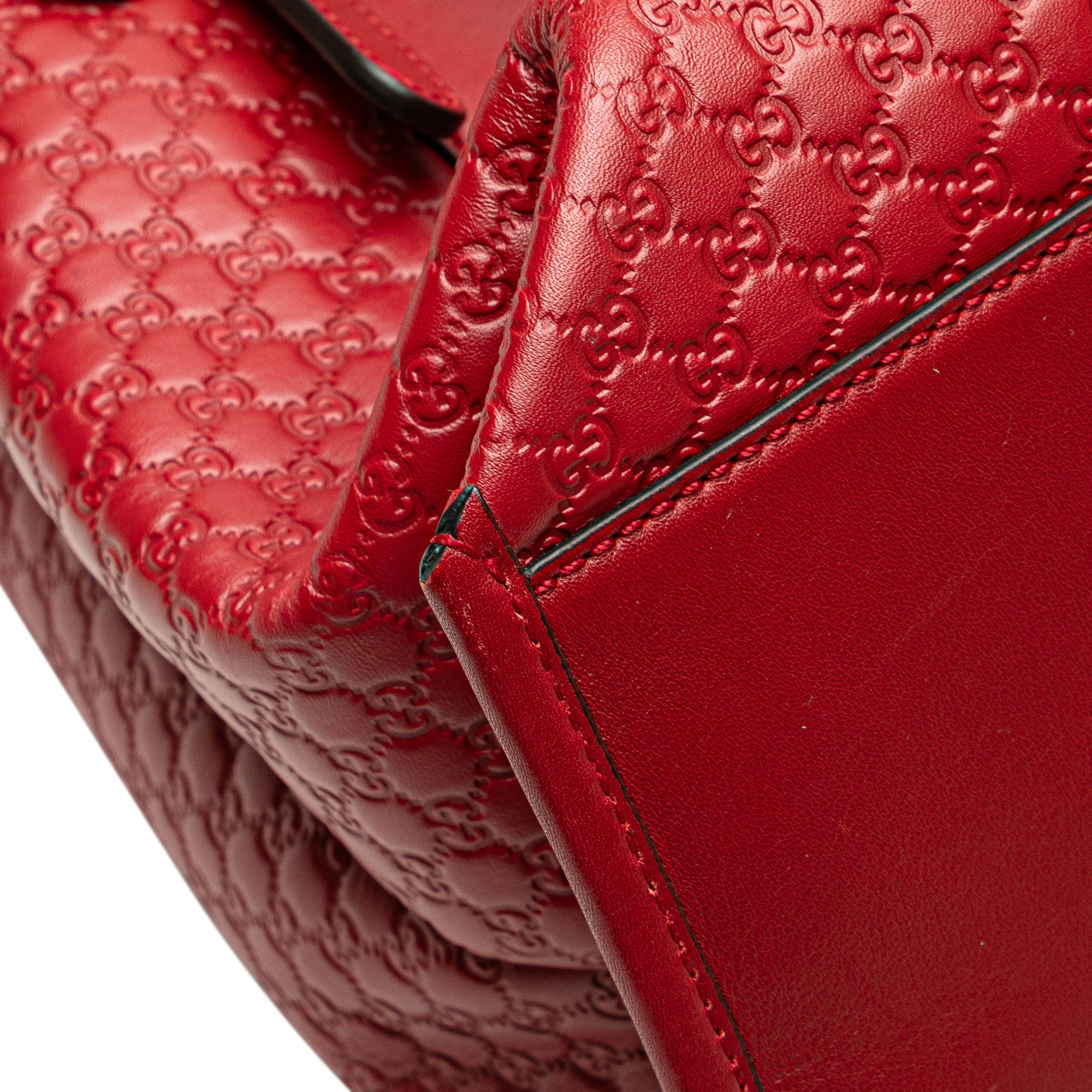 Product Details: Red Gucci Large Microguccissima Satchel. This satchel features an embossed leather body, rolled leather handles, a detachable flat leather strap, a top strap with a magnetic snap button closure, an exterior front zip pocket, an interior zip compartment, and interior zip and slip pockets. 9.1" L x 16.1" W x 6.7" D, 7.1" drop. Serial number 510290 493075.
