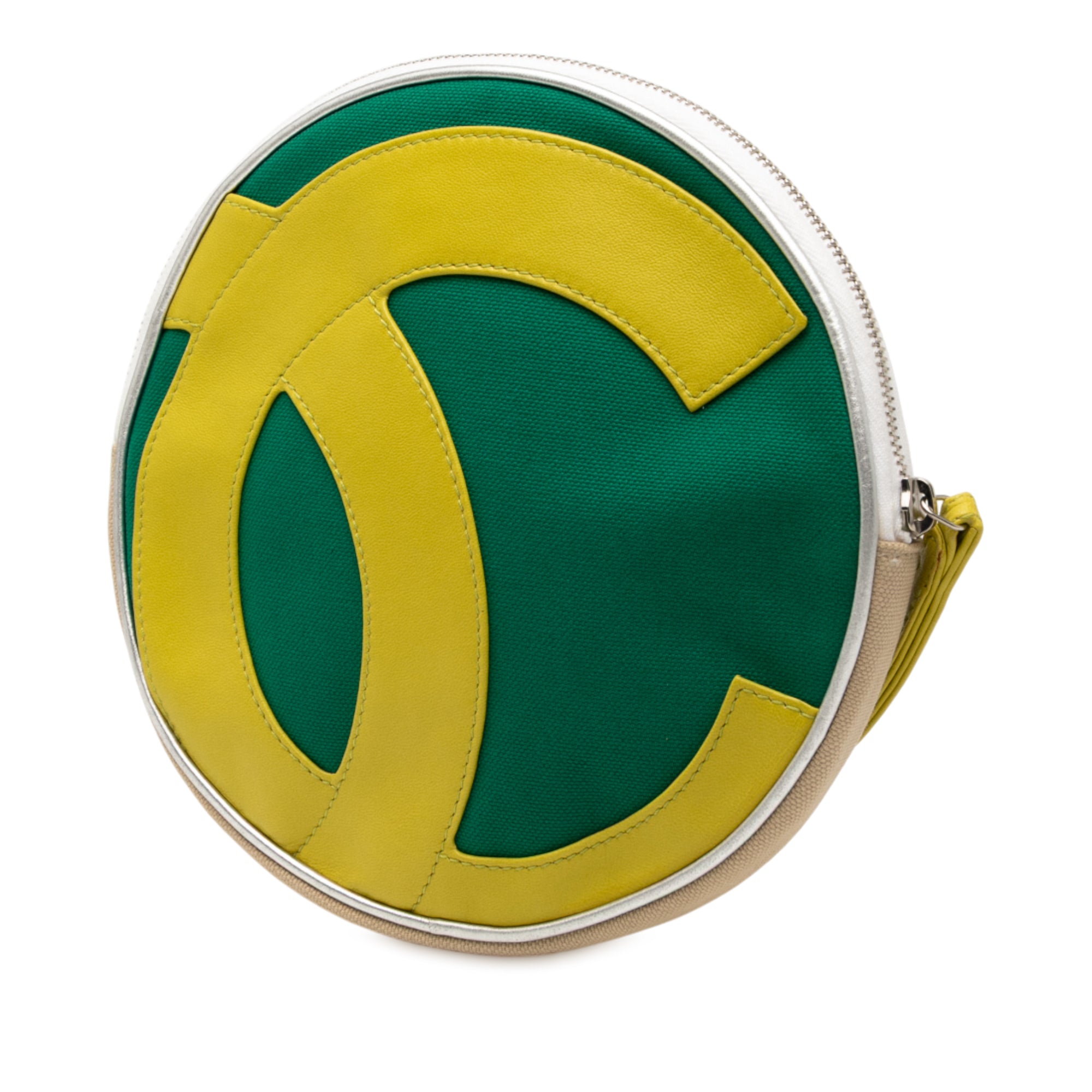 Product Details: Beige Multicolor Chanel CC Canvas and Metallic Calfskin No. 5 Wristlet Pouch Clutch Bag. The No.5 pouch bag features a canvas body with leather trim, a flat leather wrist strap, and a top zip around closure. 7.9" L x 7.9" W x 0.8" D, 5.1" drop. Serial number 8888103.