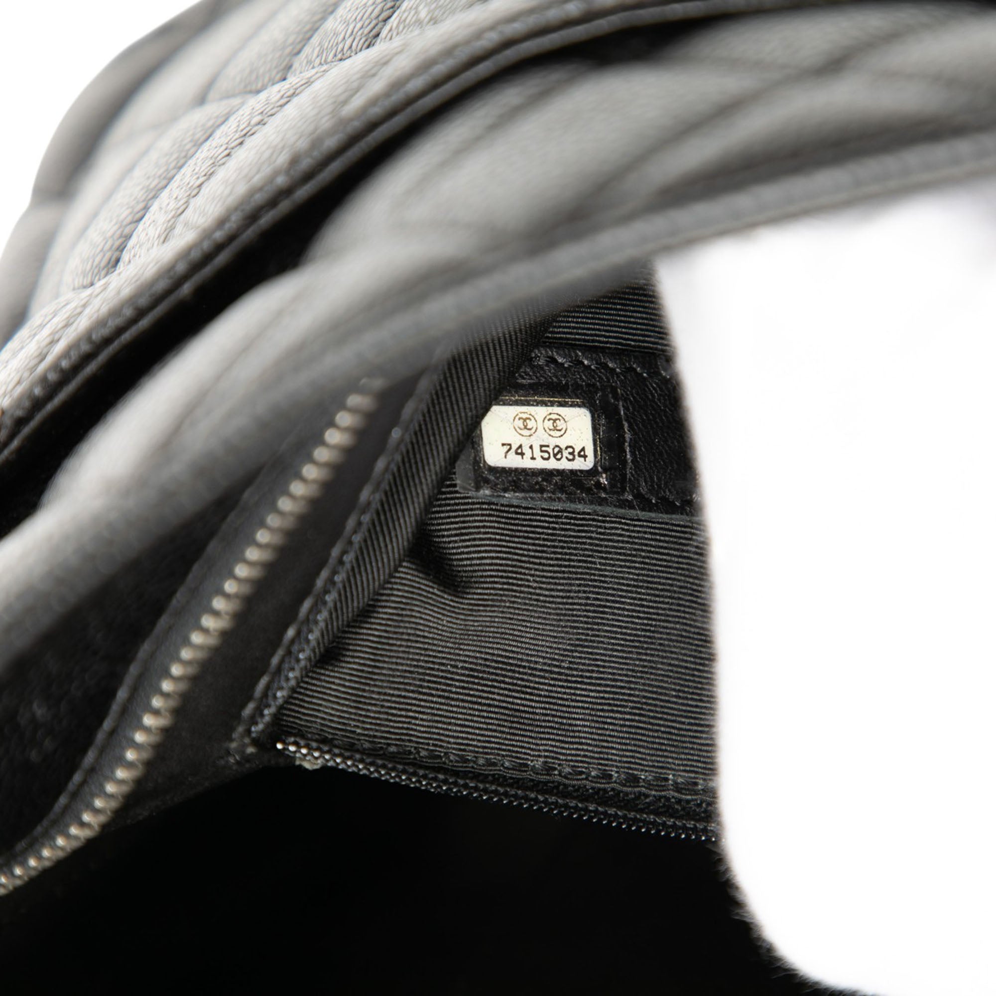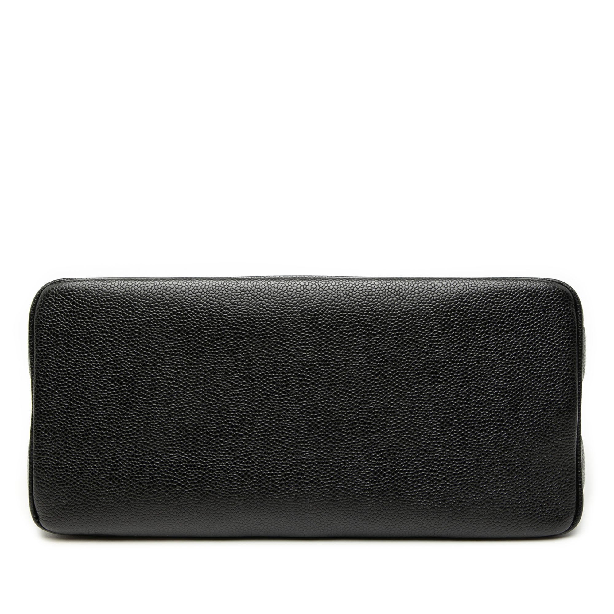 Product Details: Black Chanel Caviar Medallion Tote. The Medallion tote bag features a quilted caviar leather body, rolled leather handles, a top zip closure, an exterior back slip pocket, and interior zip and slip pockets. 9.8" L x 11.4" W x 5.5" D, 5.9" drop. Serial number 7415034.
