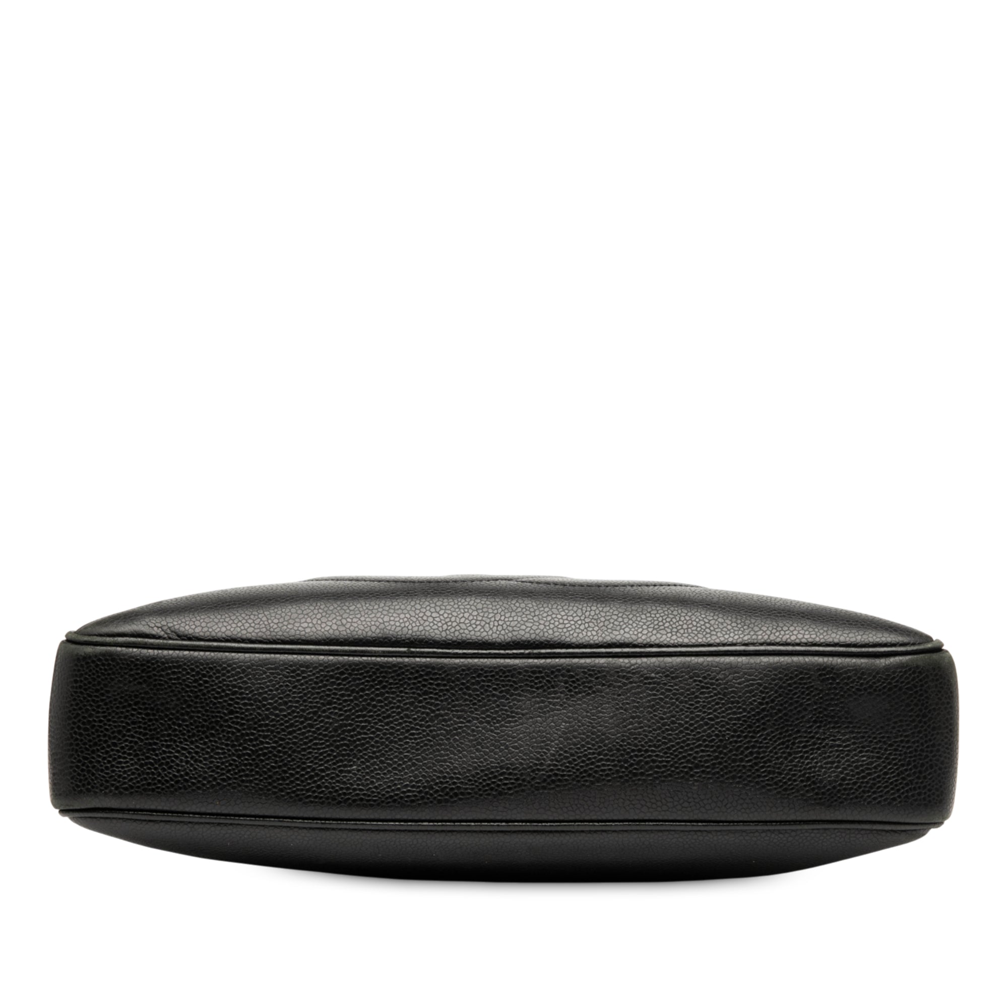 Product Details: Black Chanel CC Caviar Chain Tote. This tote bag features a caviar leather body, leather woven chain link straps with leather guard, an open top with magnetic snap closures, exterior slip pockets, and interior zip pockets. 9.8" L x 12.2" W x 2.4" D. Serial number 2447033.