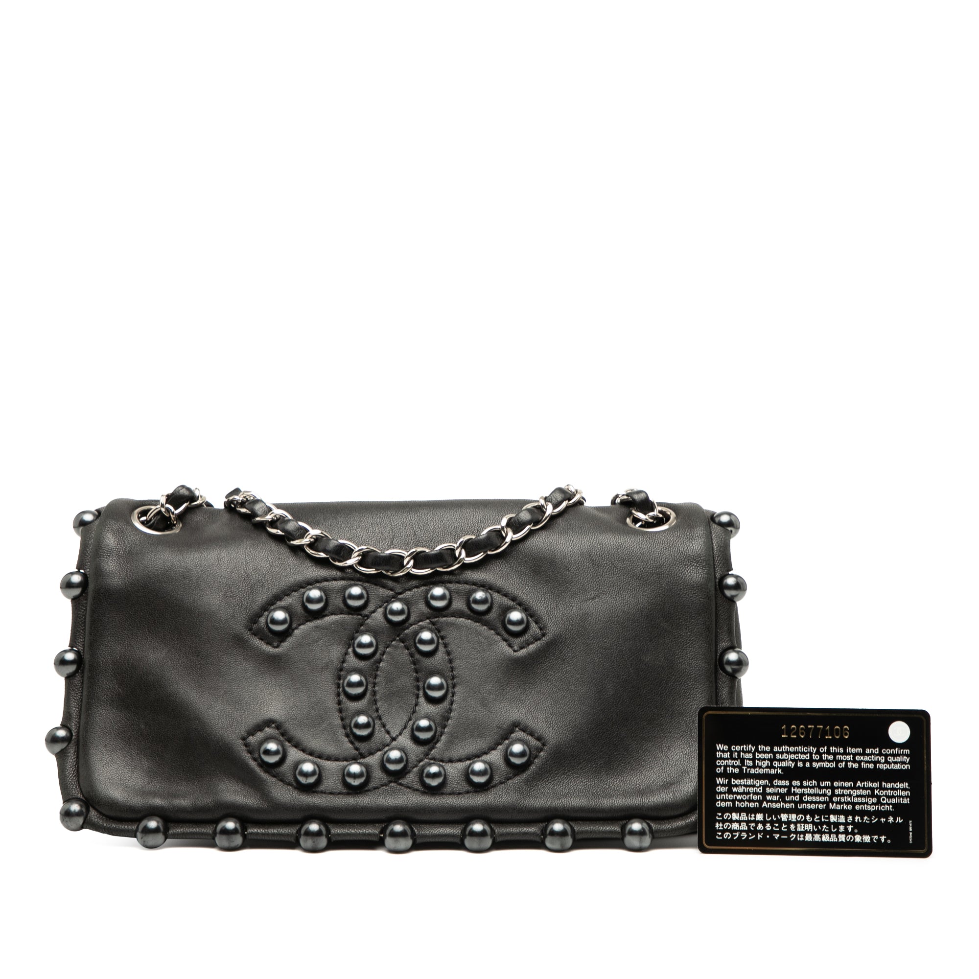 Product Details: Black Chanel Lambskin Pearl Obsession Flap Shoulder Bag. The Pearl Obsession Flap features a lambskin leather body with faux pearl details, a leather woven chain strap, a flap with magnetic snap button closure, and an interior zip pocket. 5.5" L x 9.4" W x 1.2" D, 9.1" drop. Serial number 12677106.