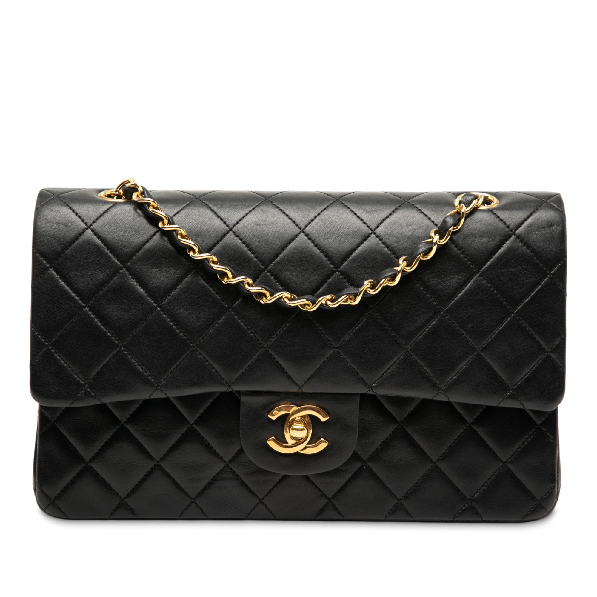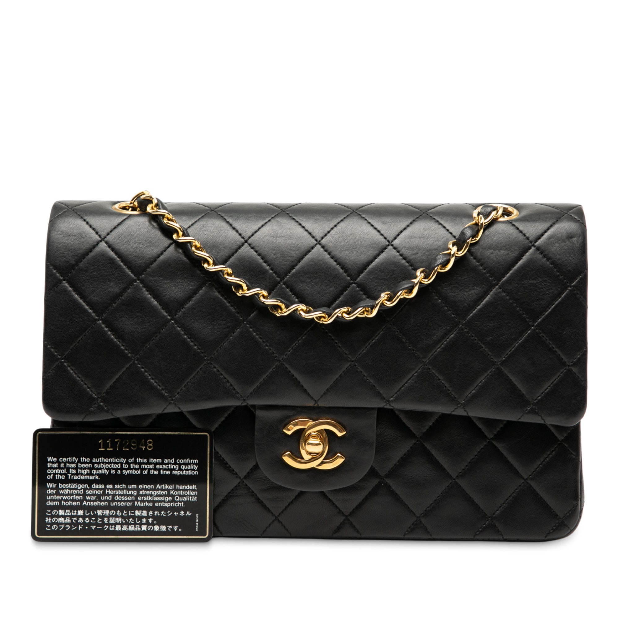 Product Details: Black Chanel Medium Classic Lambskin Double Flap Shoulder Bag. This shoulder bag features a quilted lambskin body, leather woven chain straps, double front flaps with interlocking Cs and a twist lock closure, an exterior back slip pocket, and interior zip and slip pockets. 6.3" L x 9.8" W x 2.8" D. Serial number 1172948.