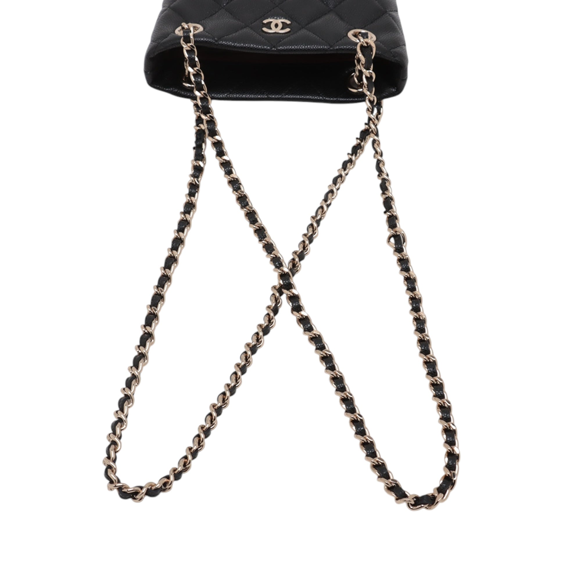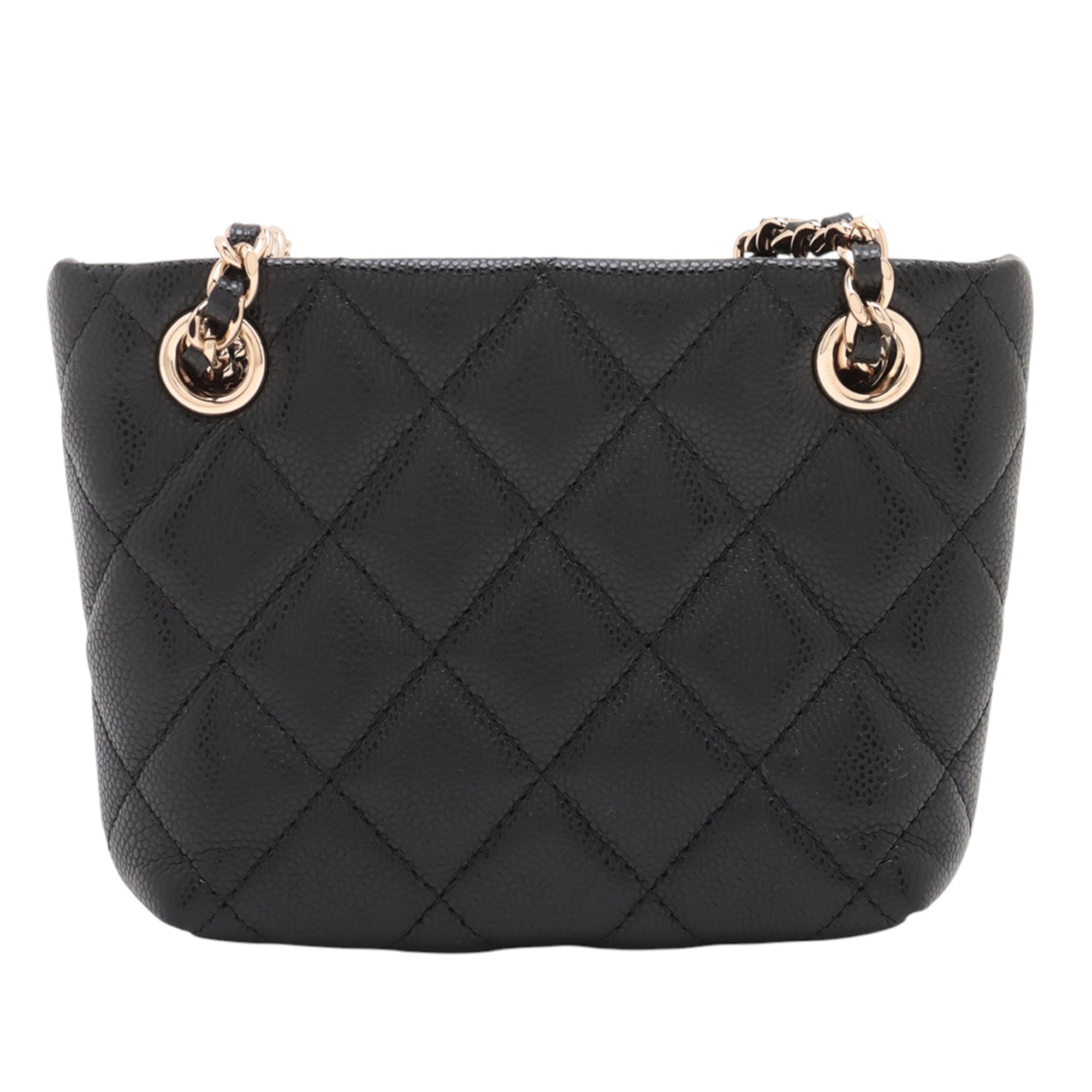 Product Details: Black Chanel Mini Quilted Caviar Shoulder Bag. This shoulder bag features a caviar leather body, leather woven chain shoulder straps, an open top, and an interior slip pocket. 3.7" L x 4.3" W x 1.6" D. Serial number P0NL2C62.