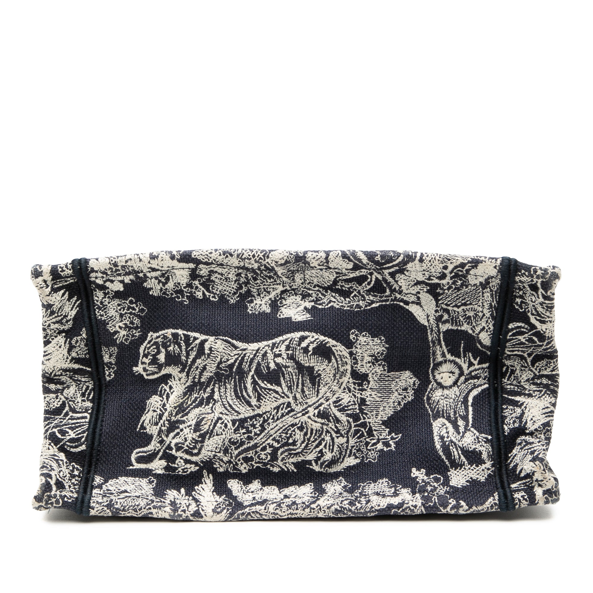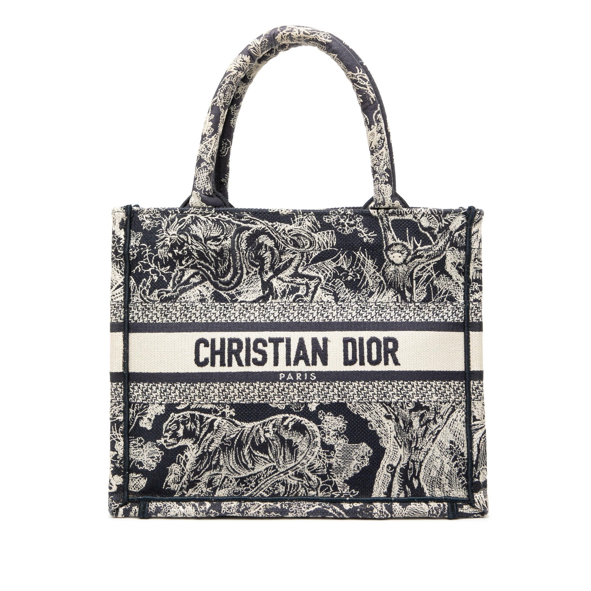 Product Details: Blue Dior Small Canvas Embroidered Reverse Dioriviera Toile De Jouy Book Tote. The Dioriviera Toile De Jouy Book Tote features an embroidered canvas body, rolled canvas handles, and an open top. 8.3" L x 10.2" W x 4.7" D, 4.7" drop. Serial number 50-MA-0222.