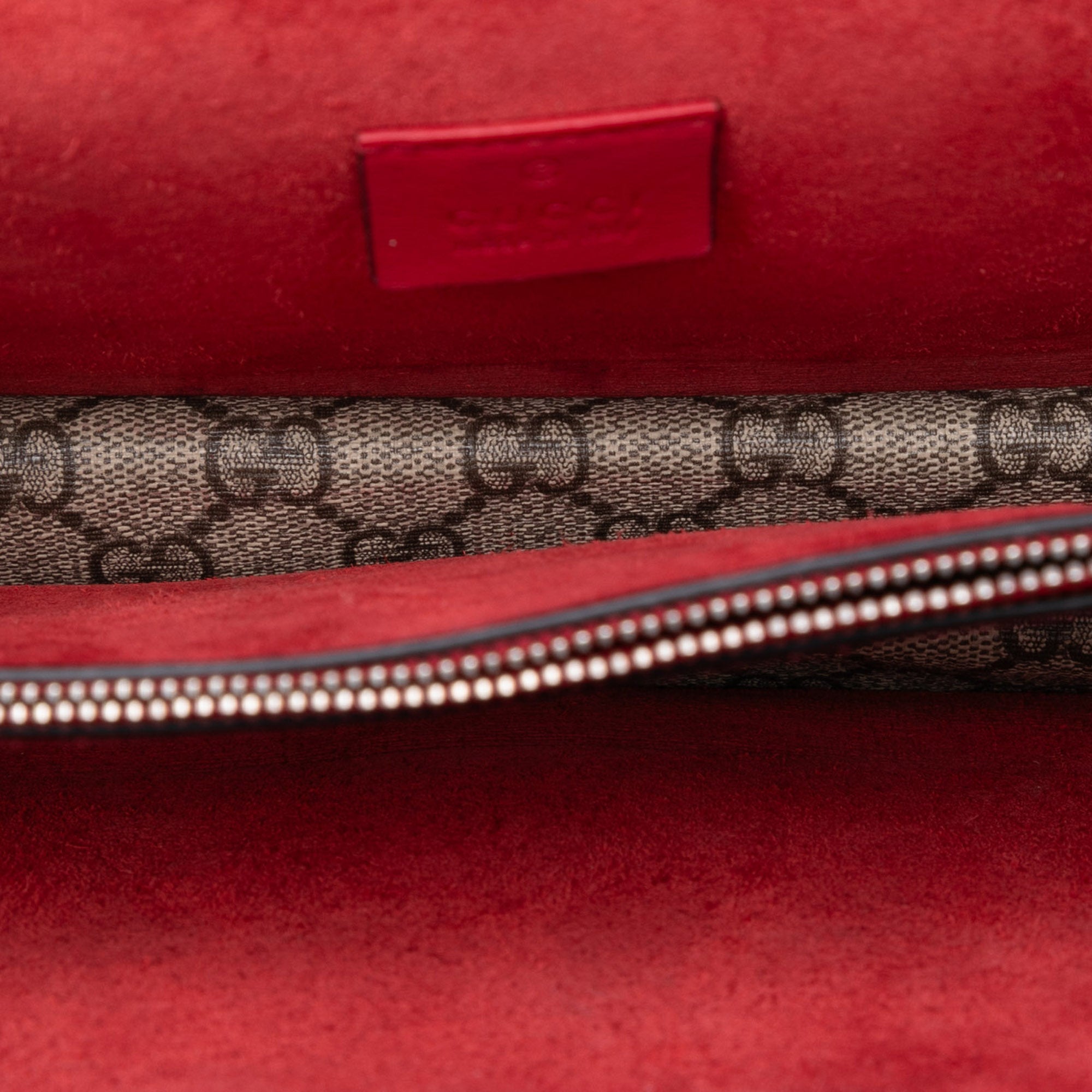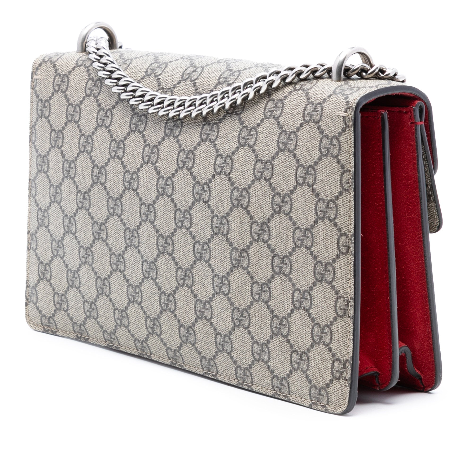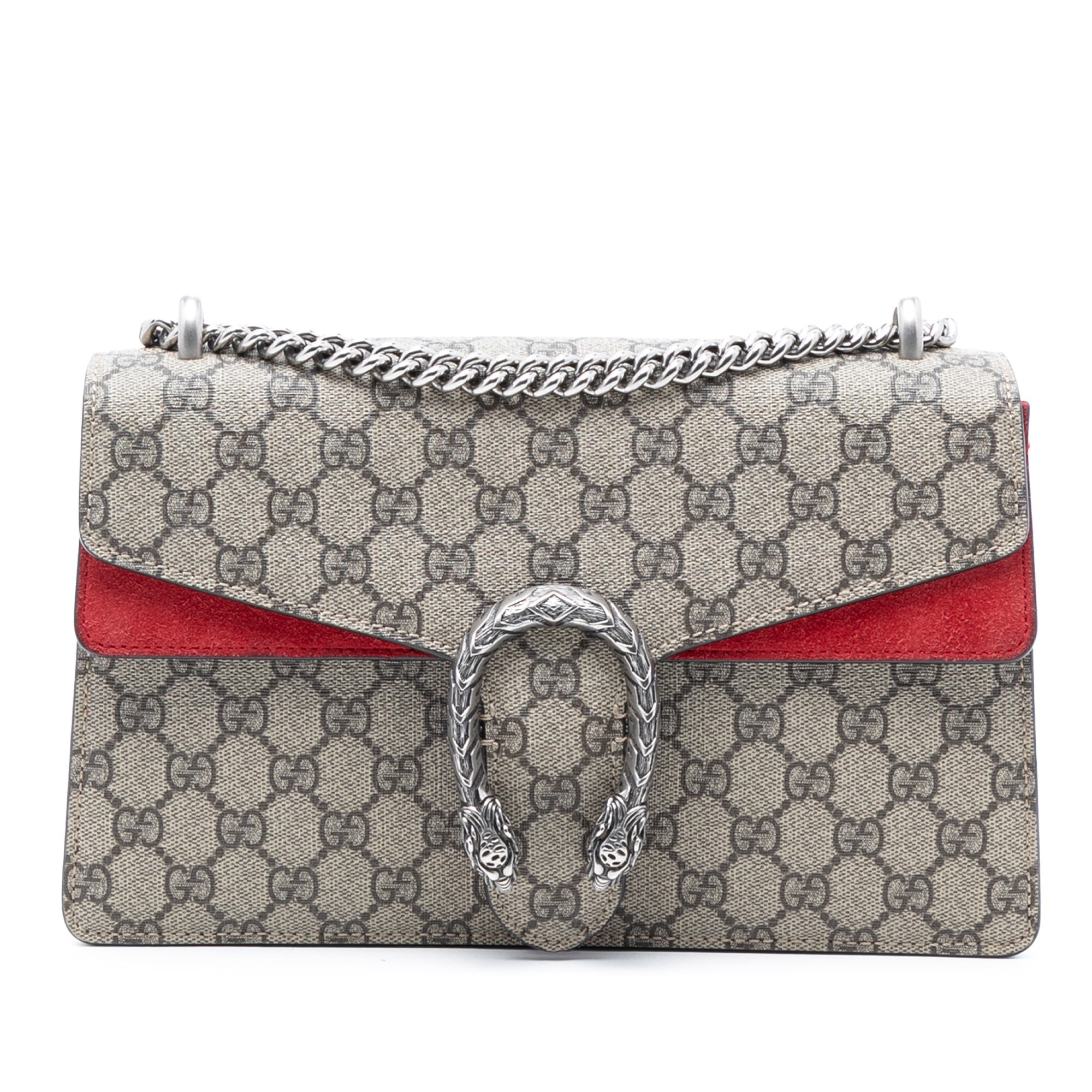Product Details: Brown Gucci Medium GG Supreme Dionysus Shoulder Bag. The Dionysus features a coated canvas body with suede leather trim, a silver-tone curb chain shoulder strap, a front flap with push lock closure, and an interior zip compartment. 6.7" L x 11" W x 4.5" D. Serial number 400249 493075.