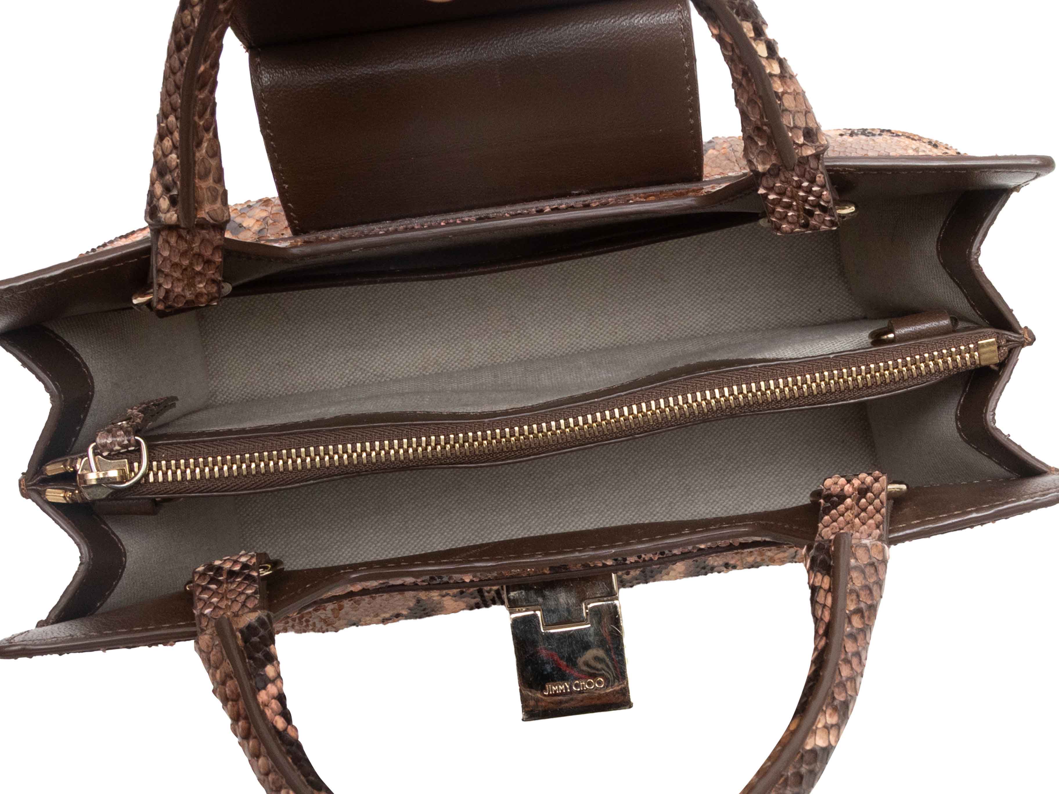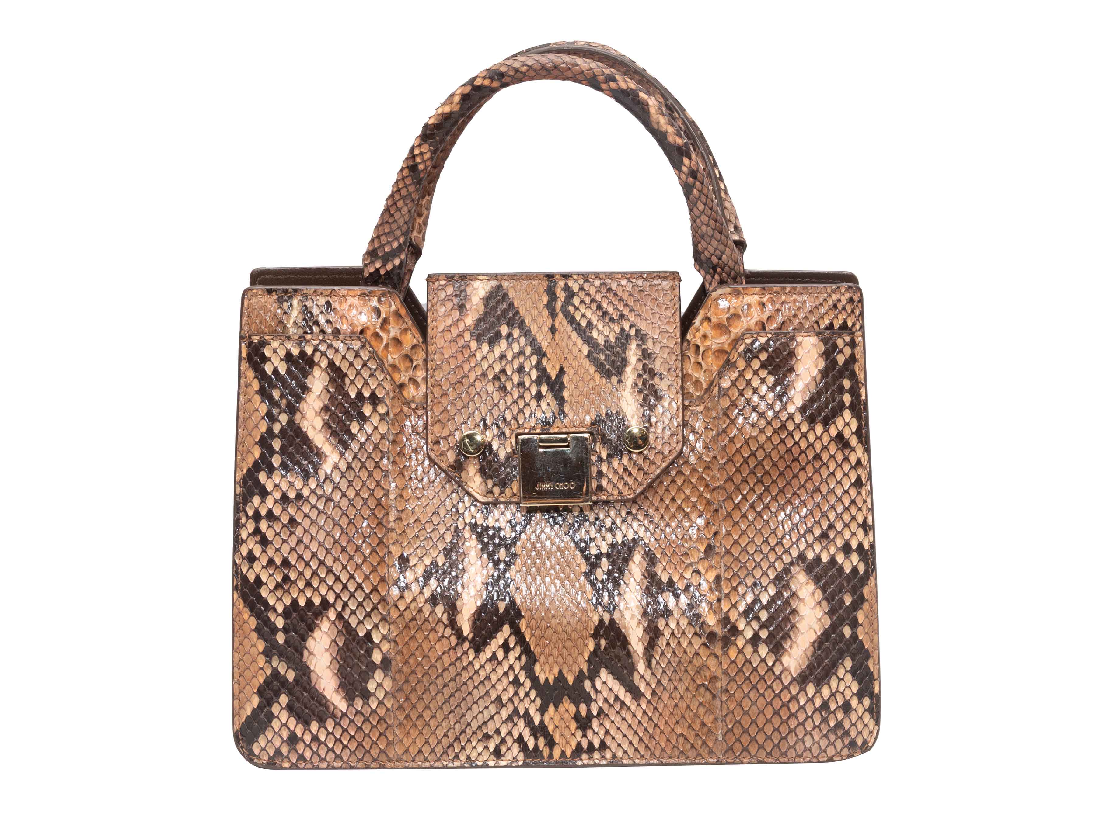 Product Details: Brown Jimmy Choo Snakeskin Top Handle Bag. This bag features a snakeskin body, gold-tone hardware, dual rolled top handles, and top zip and flap closures. 10.5" L x 8" H x 5.75" D, 3.75" handle drop.