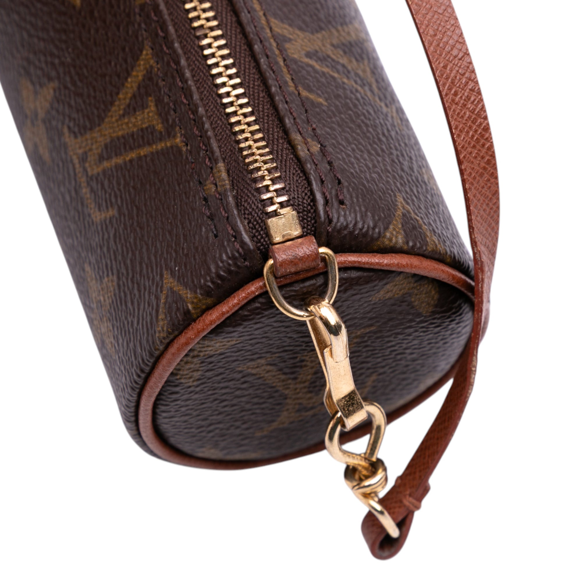 Product Details: Brown Louis Vuitton Monogram Papillon Pochette Handbag. The Papillon Pochette features a monogram canvas body, a detachable leather strap, and a top zip closure. 2.6" L x 6.1" W x 2.4" D, 5.3" drop.