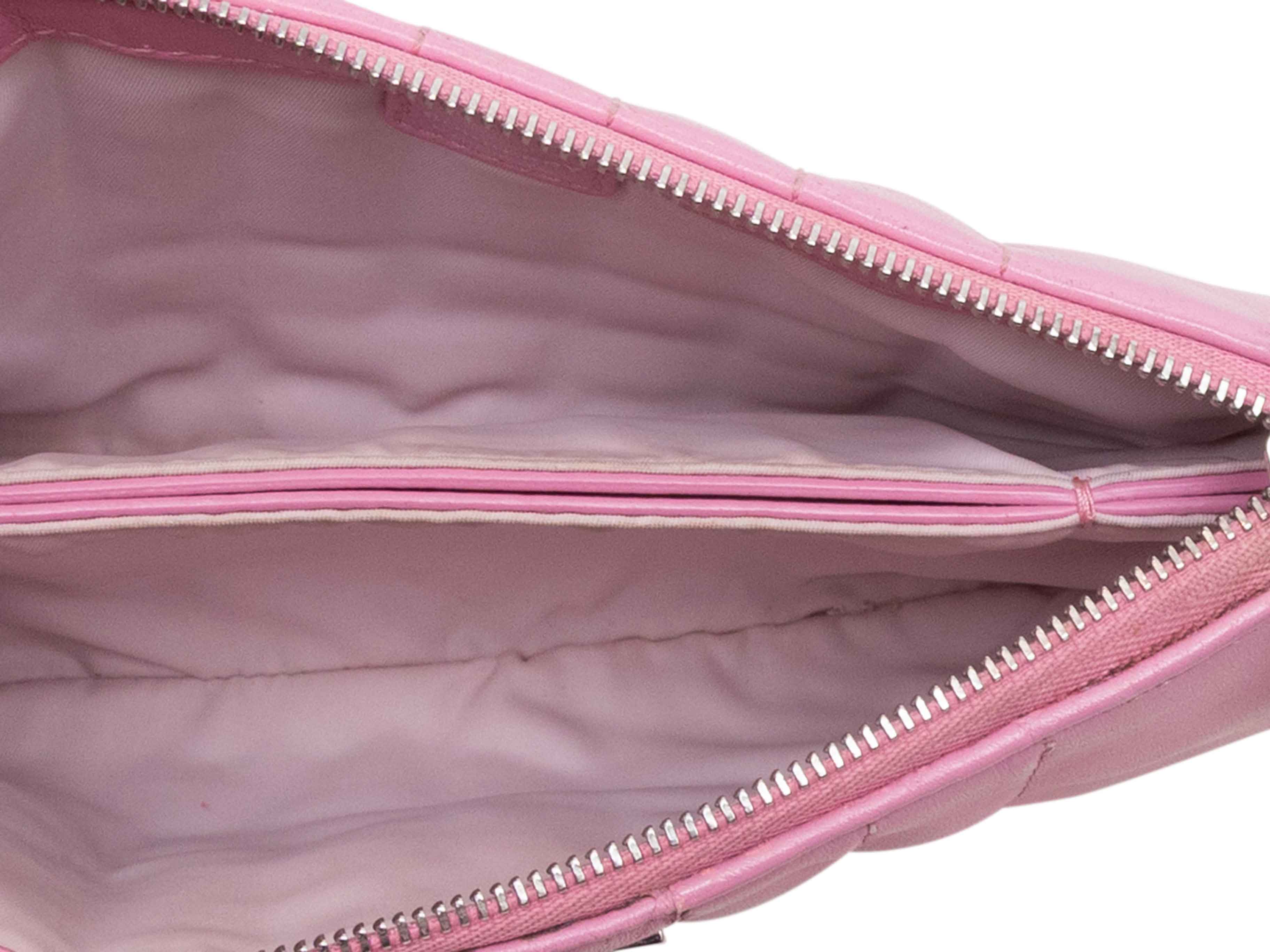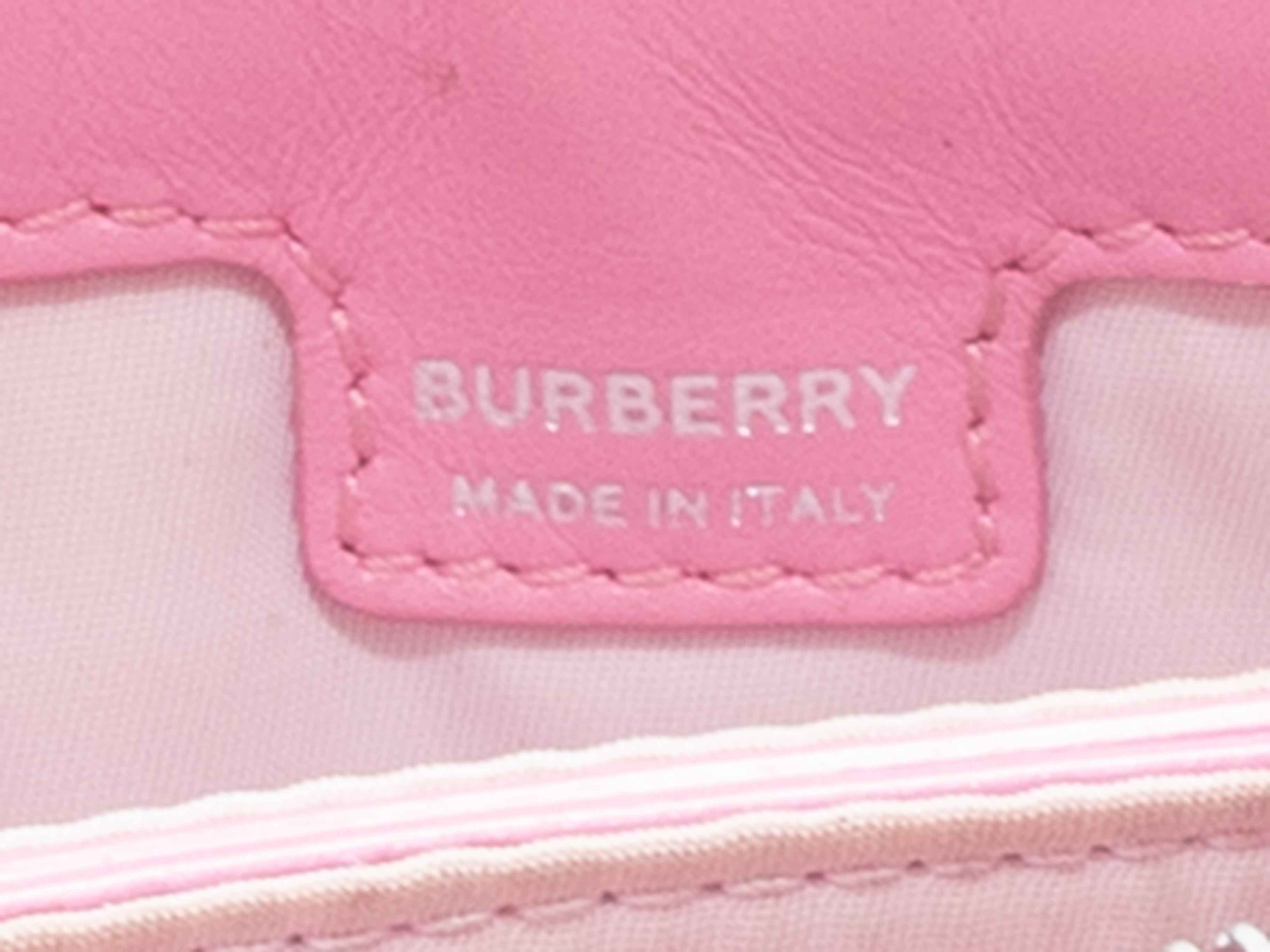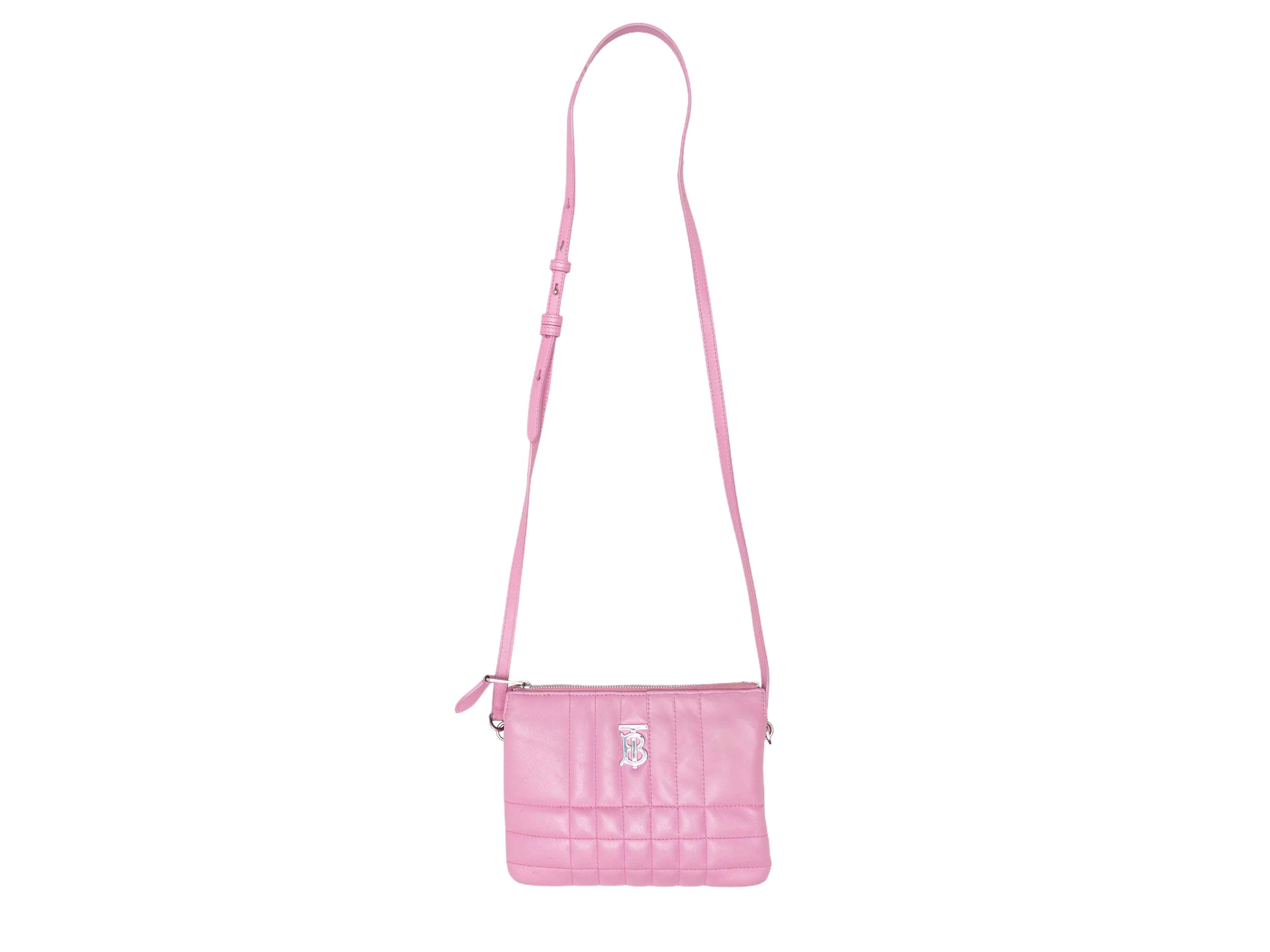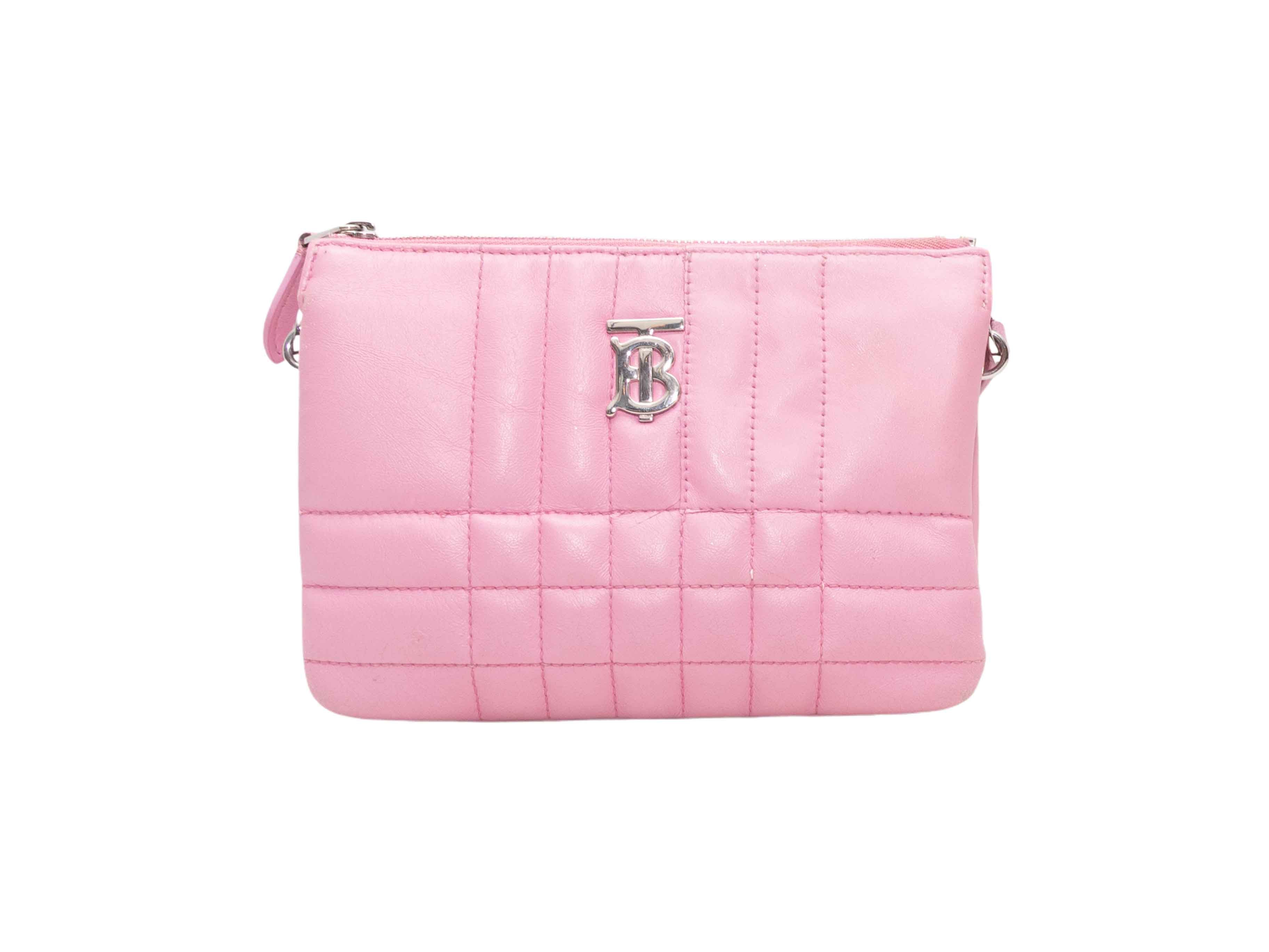 Product Details: Pink Burberry Lola Crossbody Bag. The Lola Crossbody Bag features a quilted leather body, silver-tone hardware, a single crossbody strap, and a top zip closure. 7.5" L x 5.5" H x 0.5" D, 21.5" shoulder strap drop.