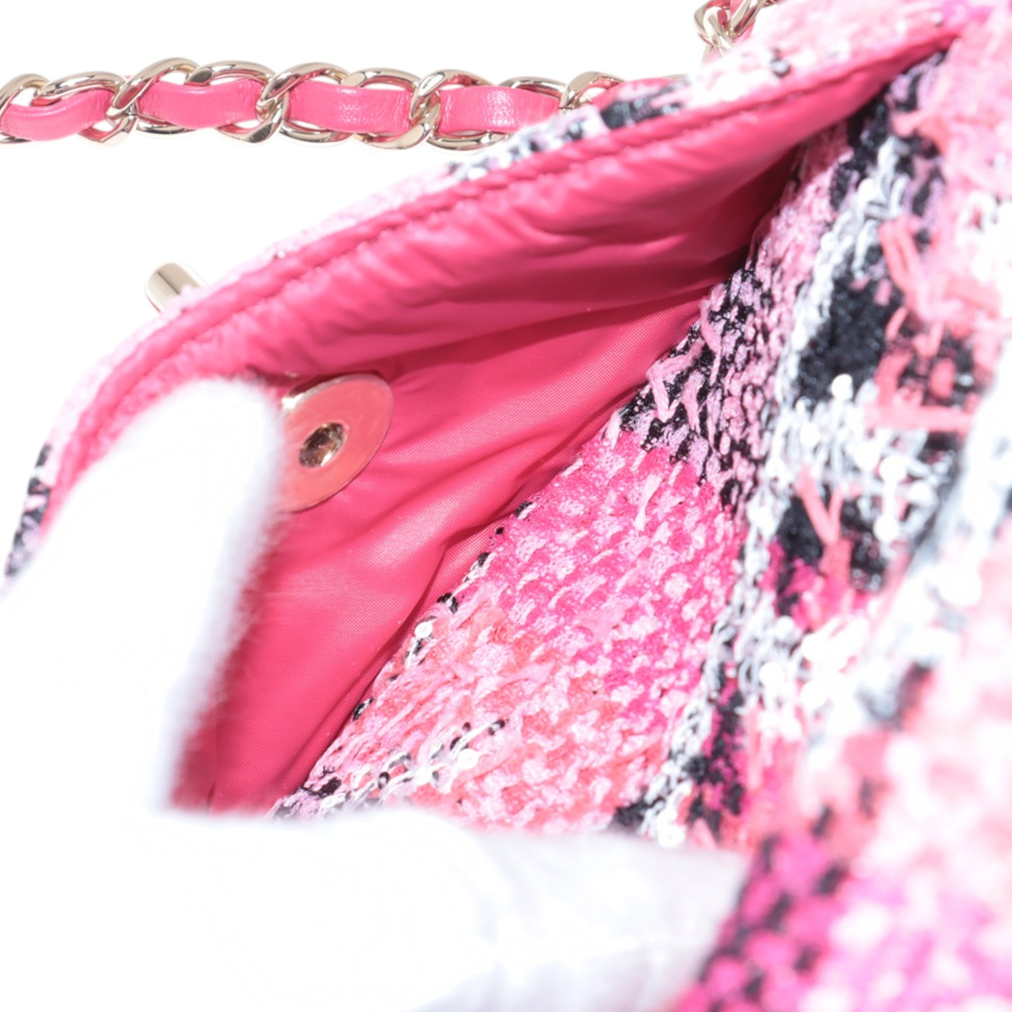 Product Details: Pink Chanel Tweed Coco Beach Convertible Bowling Bag. This crossbody bag features tweed body with sequin details, a leather woven chain link strap, and a top zip closure. 5.9" L x 9.6" W x 5.9" D. Serial number P2NJPA62.