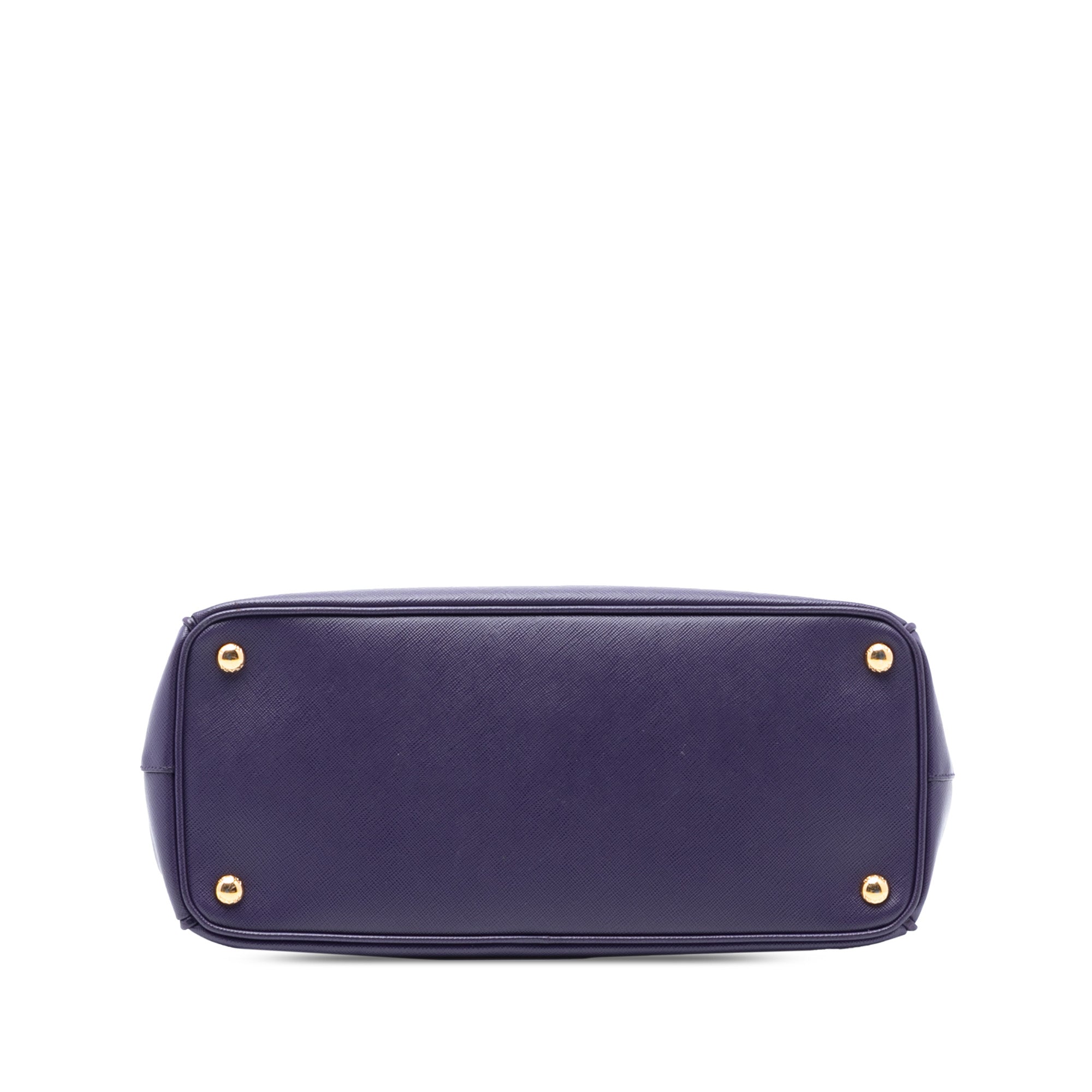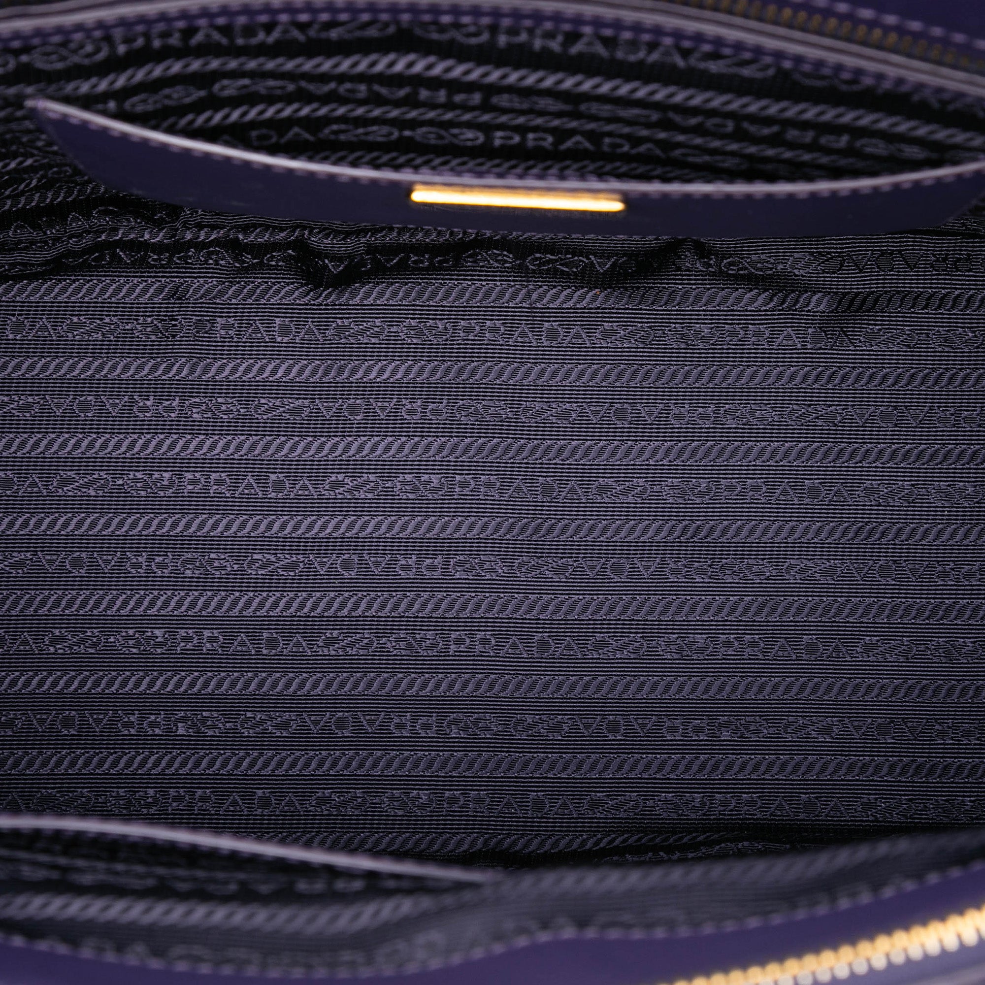 Product Details: Purple Prada Medium Saffiano Lux Galleria Double Zip Satchel. The Galleria features a saffiano leather body, rolled leather handles, a detachable flat strap, an open top, double zip compartments, and interior zip and slip pockets. The corners were repainted. 9.6" L x 13.4" W x 6.1" D, 5.1" drop.