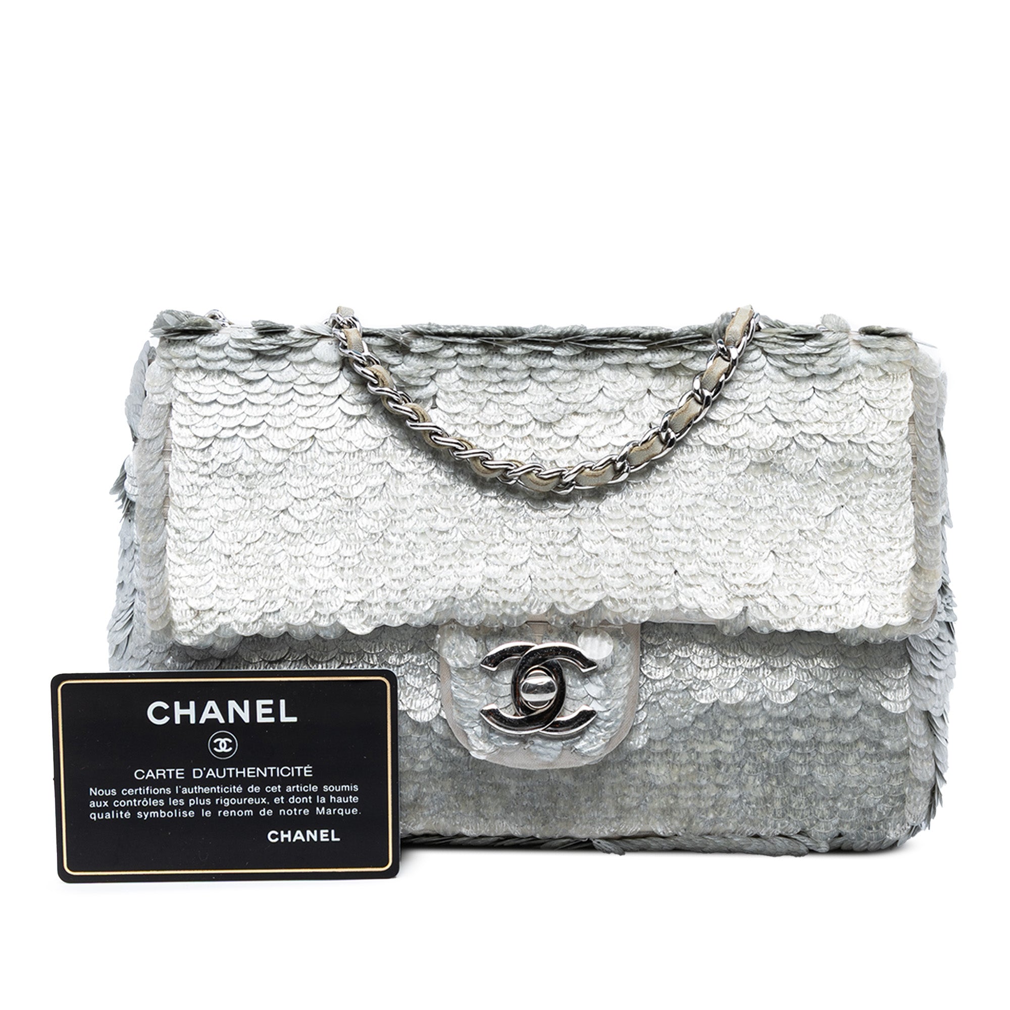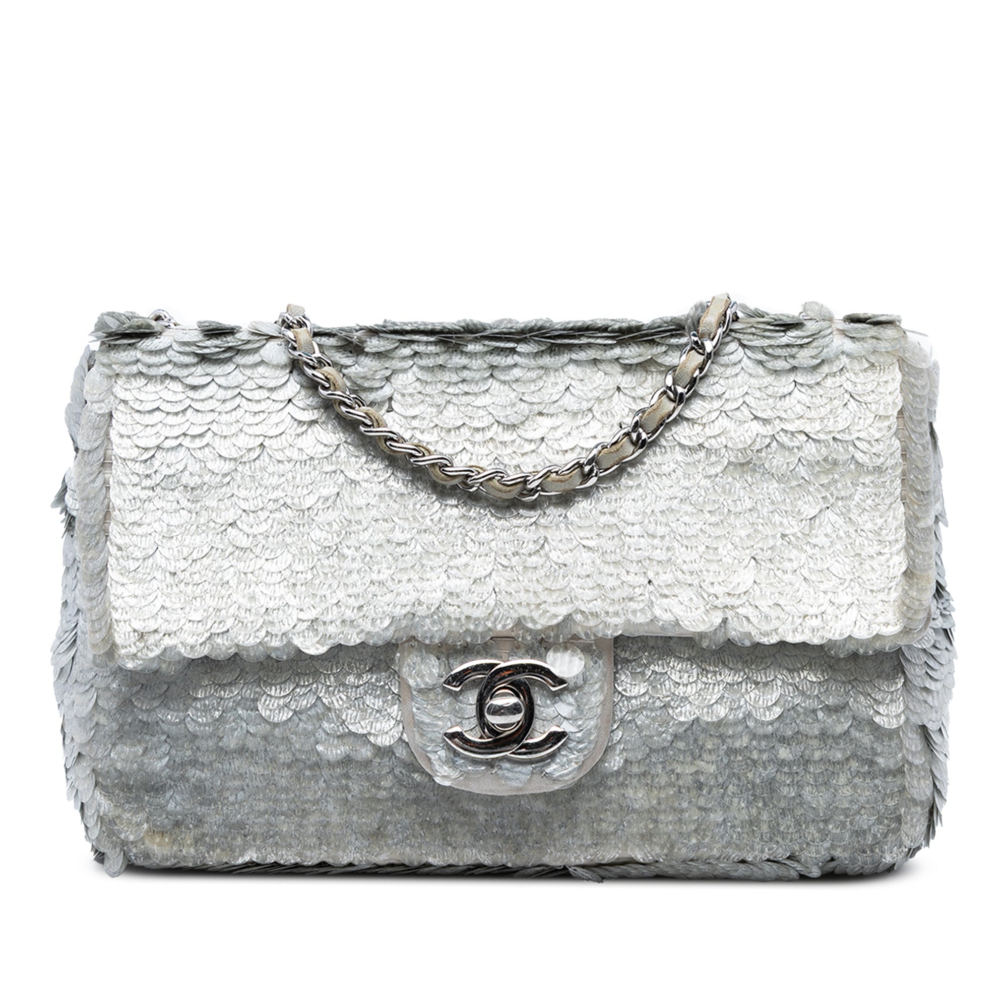 Product Details: Silver Chanel Small Paillettes Sequin Single Flap Shoulder Bag. This shoulder bag features a sequin embellished body, a leather woven chain strap, a front flap with CC turn-lock closure, and an interior zip pocket. 5.1" L x 7.7" W x 2.4" D. Serial number 16250352.