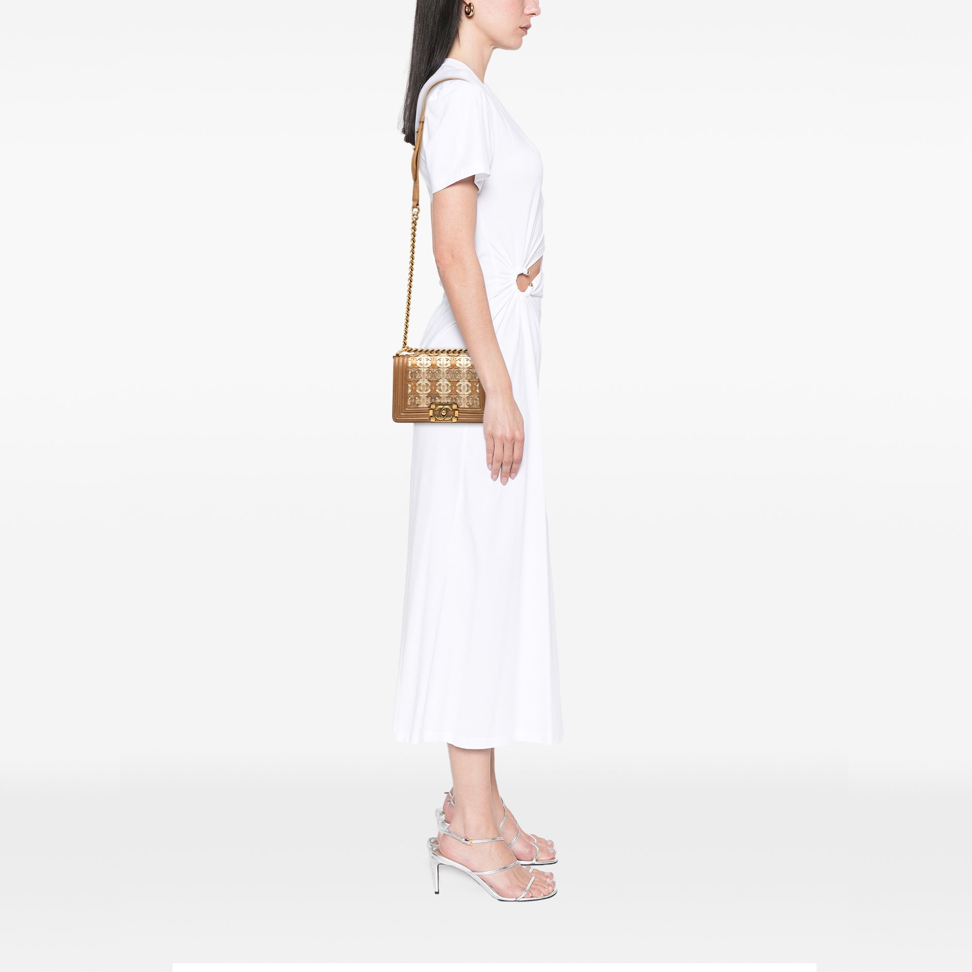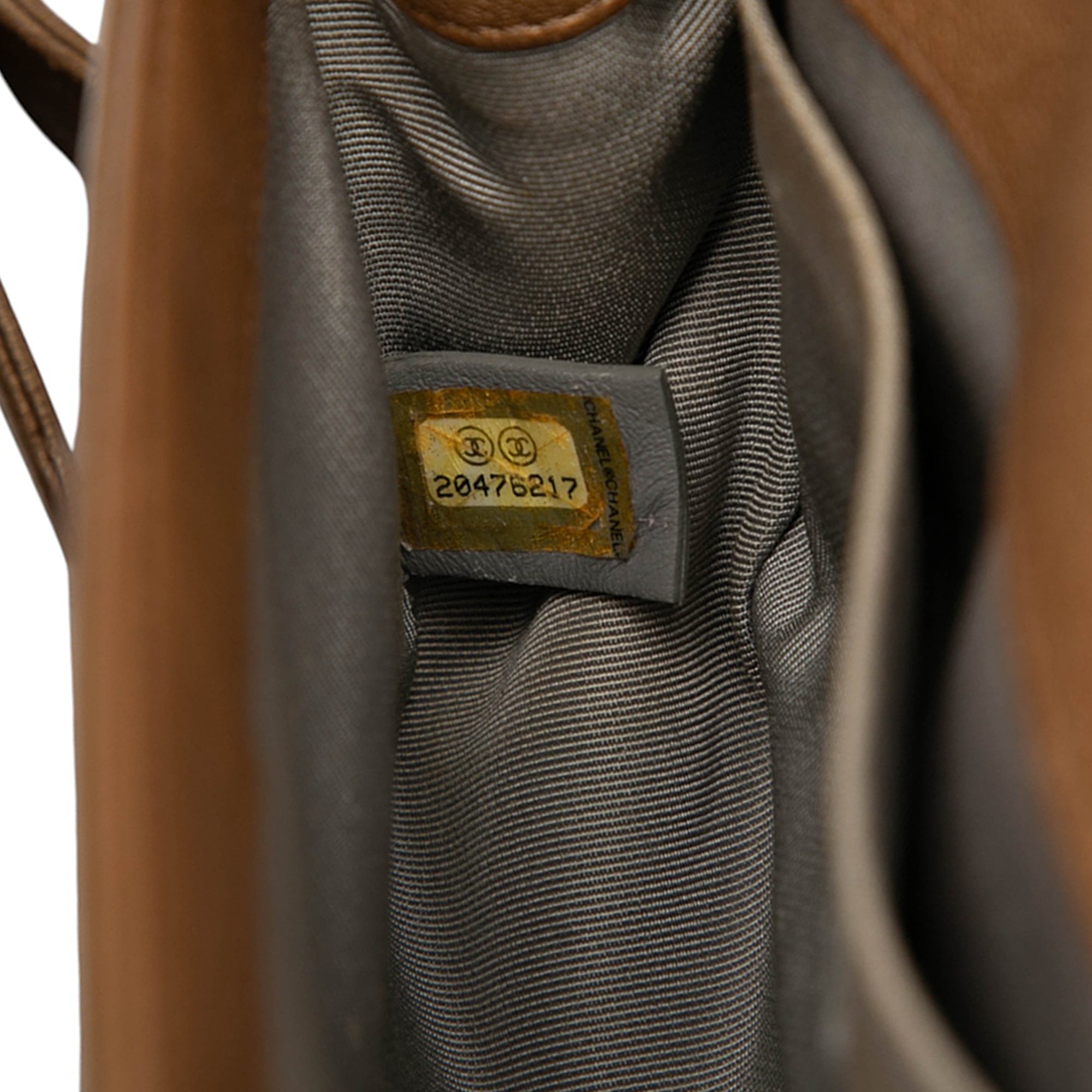 Product Details: Tan Chanel Small Quilted Metallic Lambskin Interwoven CC Boy Flap Crossbody Bag. This Boy flap features a metallic lambskin leather body, a gold-tone curb chain-link with flat leather shoulder strap, a front flap with a CC push-lock closure, and an interior slip pocket. 5.3" L x 7.9" W x 2" D, 11.8" drop. Serial number 20476217.