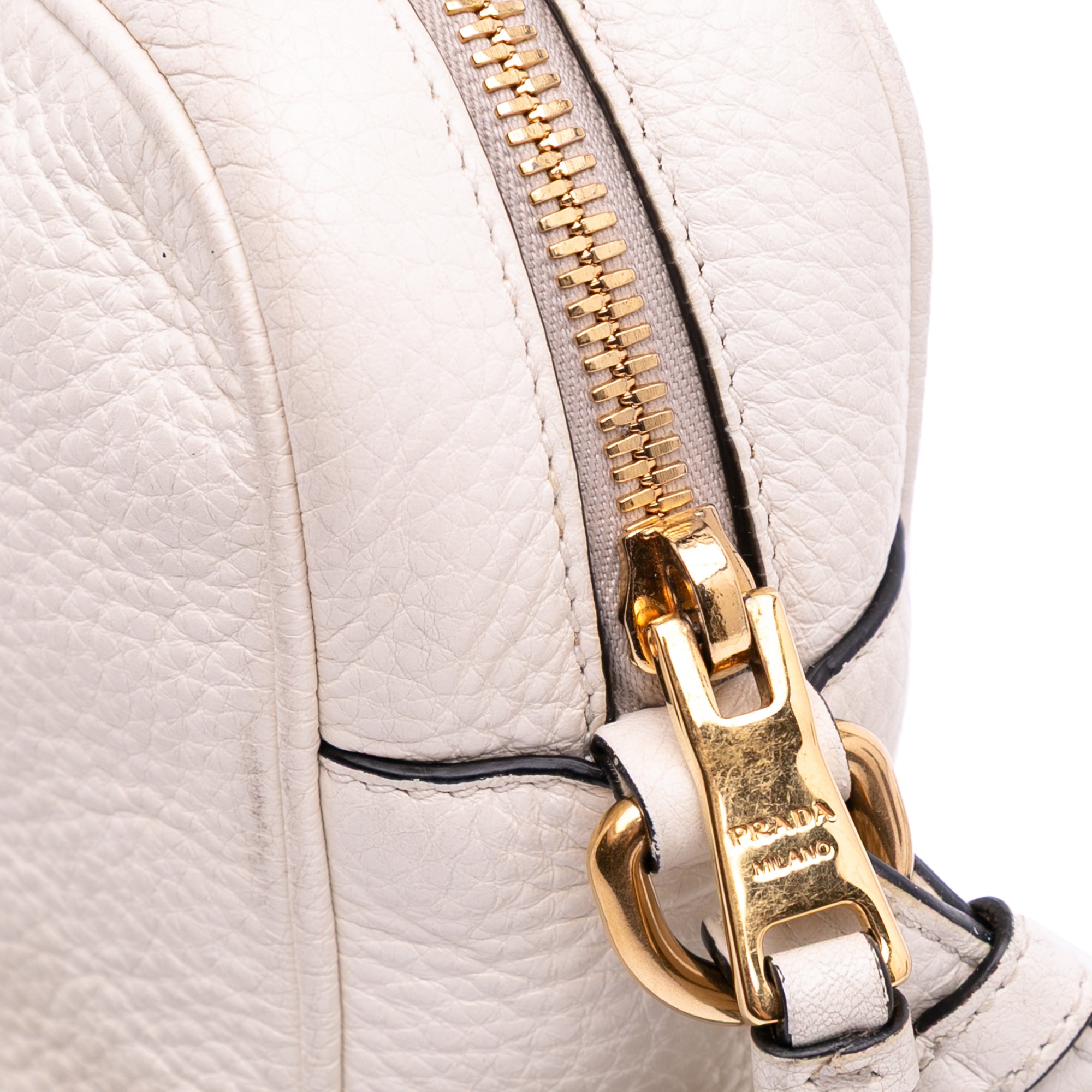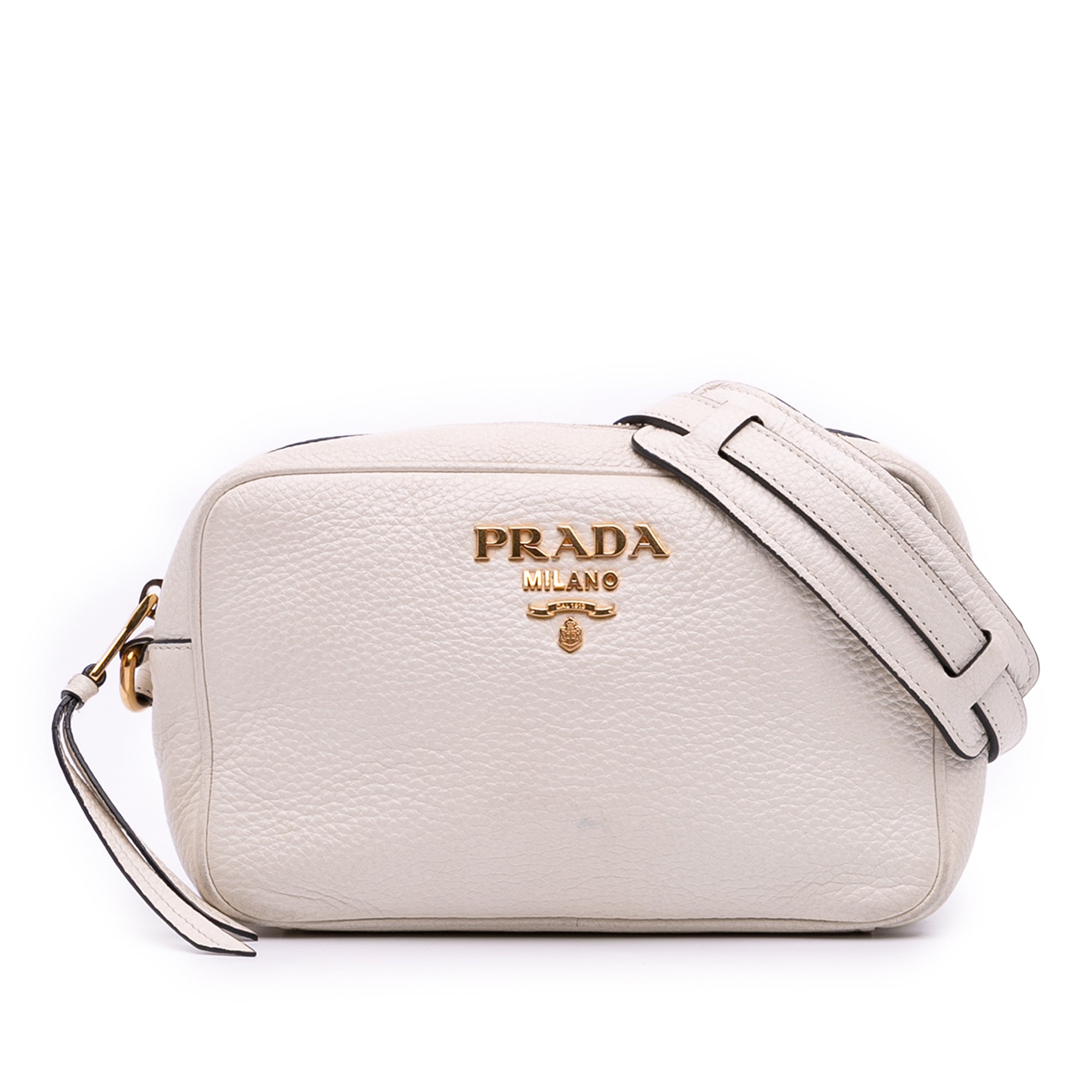 Product Details: White Prada Vitello Daino Camera Bag. This crossbody bag features a leather body, an adjustable flat strap, a top zip closure, and an interior zip pocket. 5.3" L x 8.3" W x 2.8" D.