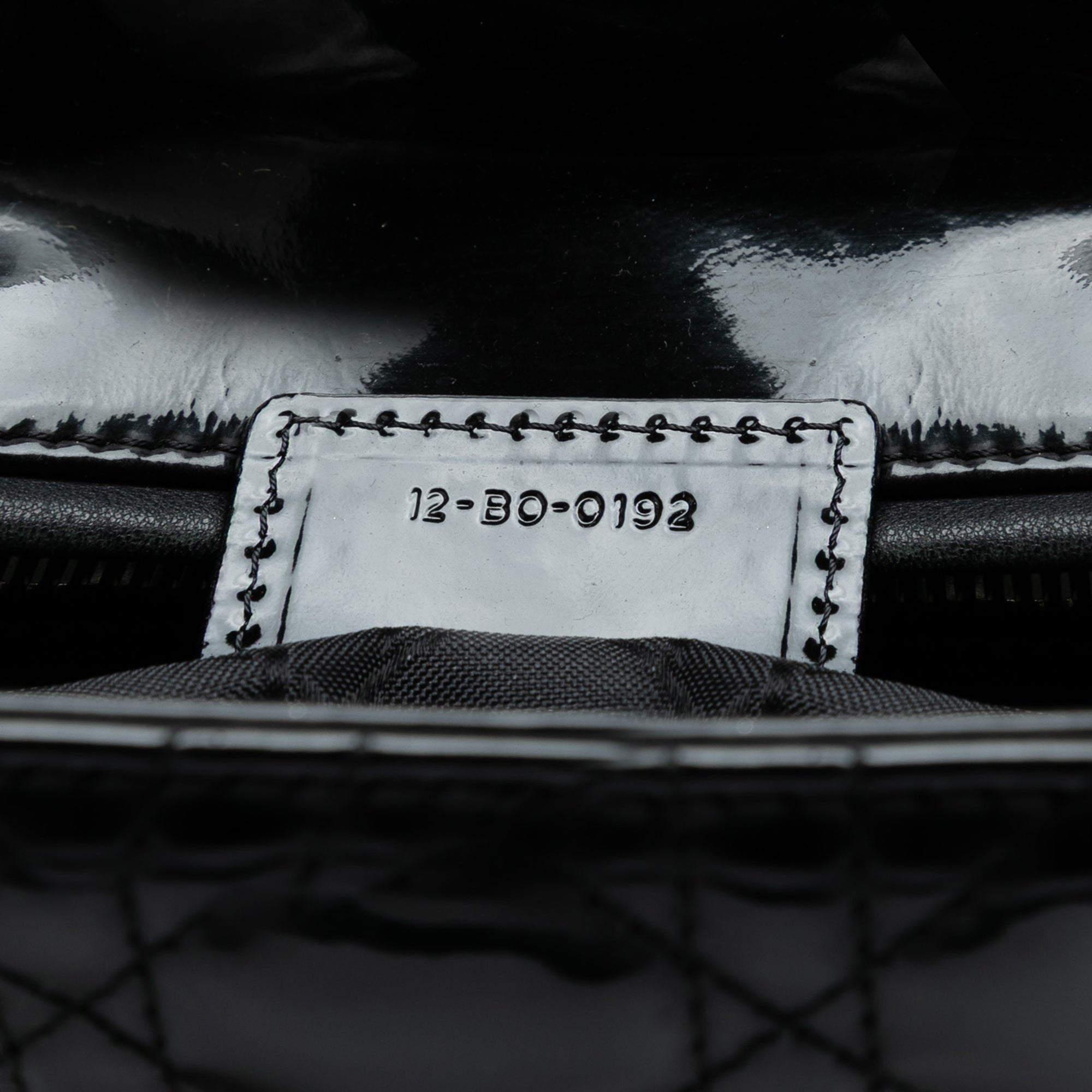 Product Details: Black Dior Large Patent Cannage Lady Dior Satchel. The Lady Dior features a quilted patent leather body, flat leather top handles, a detachable flat strap, a top zip closure, and an interior zip pocket. 9.6" L x 12.6" W x 4.7" D, 3.9" drop. Serial number 12-BO-0192.