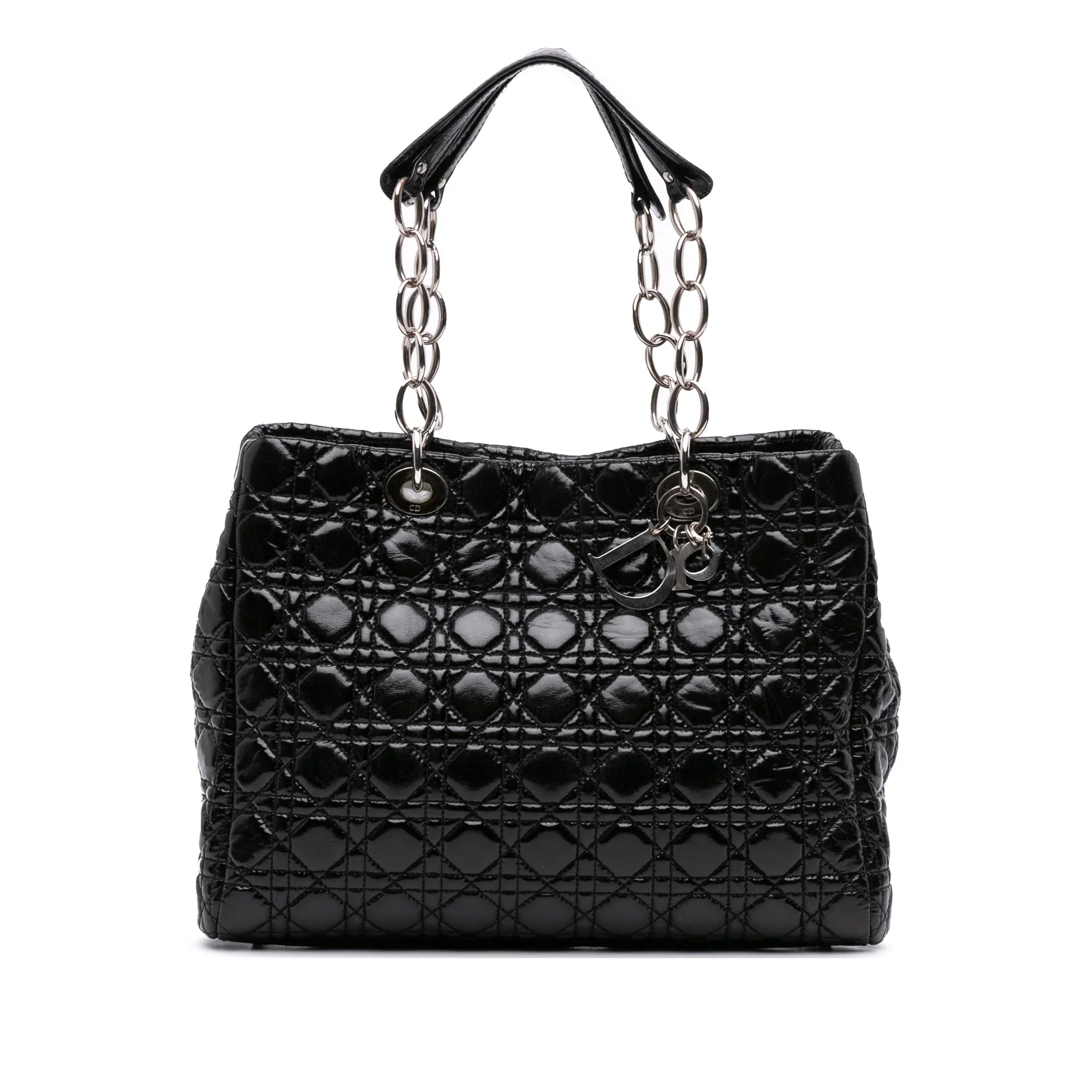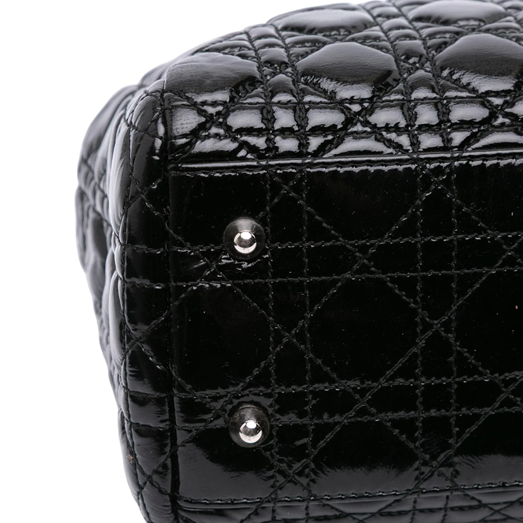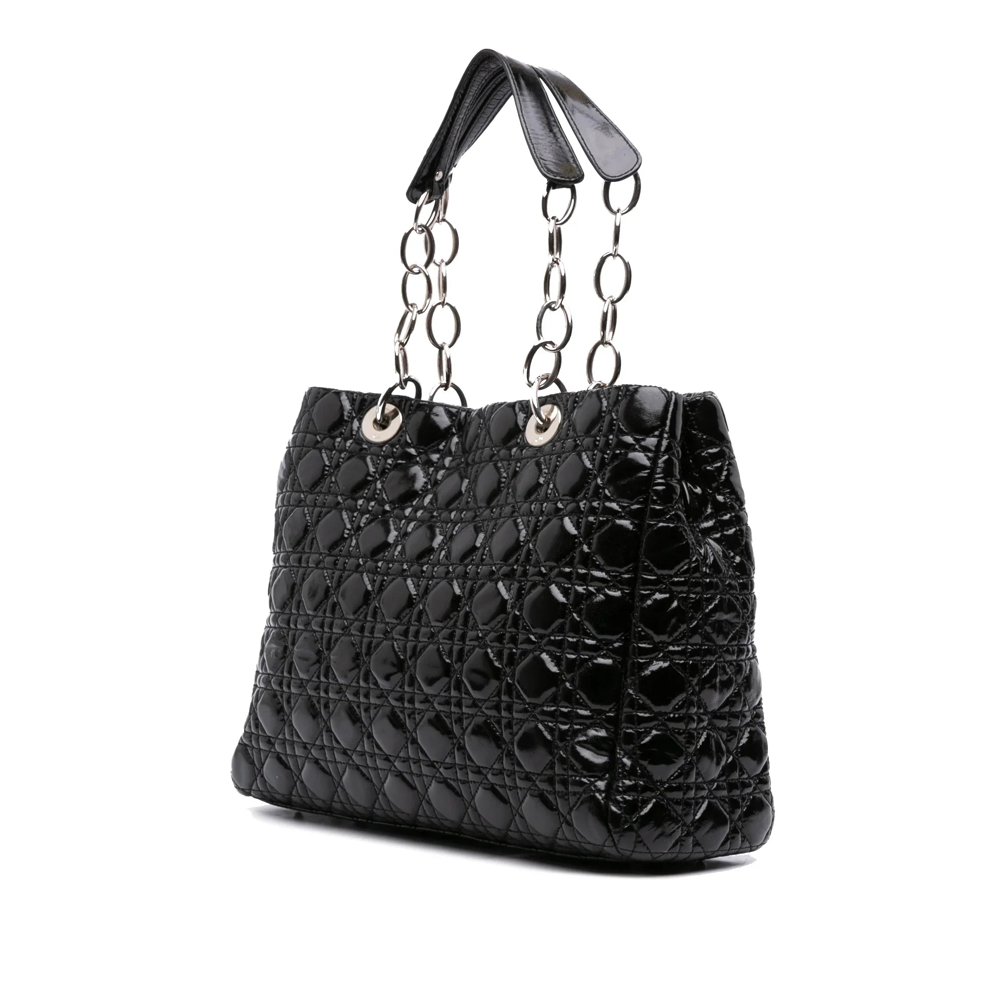 Product Details: Black Dior Large Patent Cannage Lady Dior Soft Shopping Tote. This tote features a quilted patent leather body, silver-tone chain link shoulder straps with leather guard, an open top with magnetic snap closure, and interior zip and slip pockets and zip compartment. 11.4" L x 14.2" W x 3.9" D, 7.1" drop. Serial number 04-RU-0191.