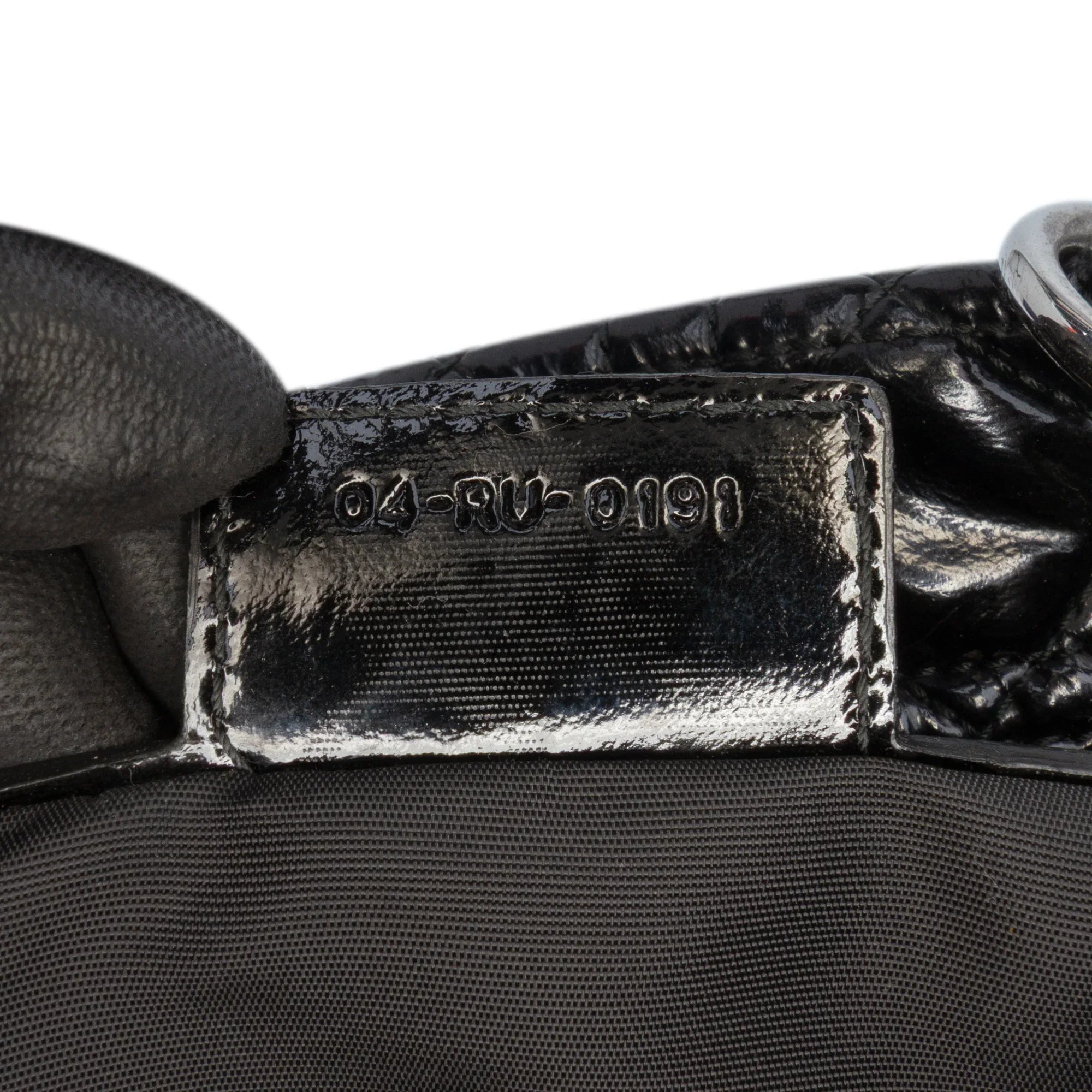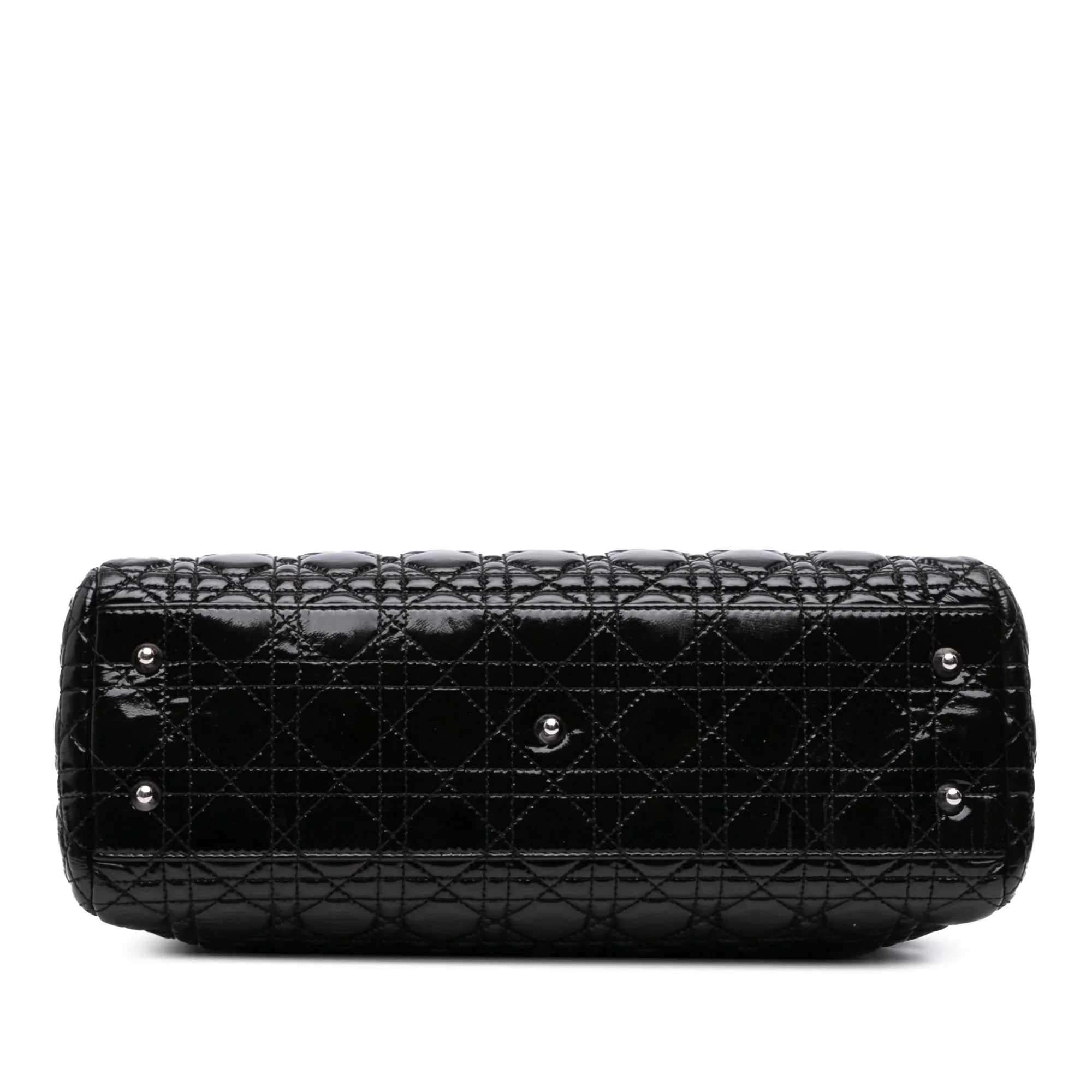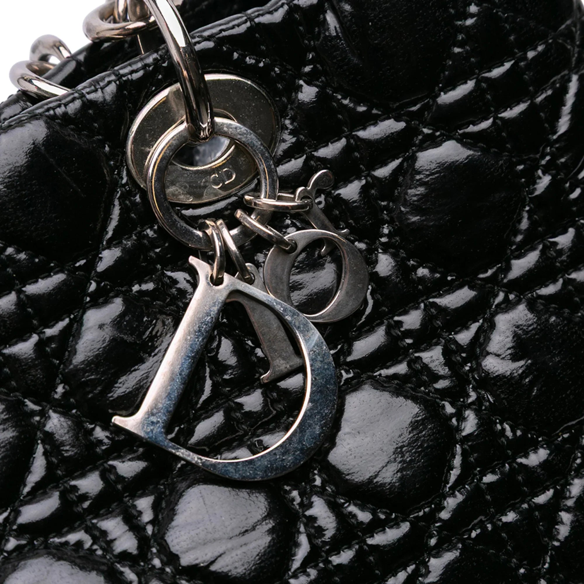 Product Details: Black Dior Large Patent Cannage Lady Dior Soft Shopping Tote. This tote features a quilted patent leather body, silver-tone chain link shoulder straps with leather guard, an open top with magnetic snap closure, and interior zip and slip pockets and zip compartment. 11.4" L x 14.2" W x 3.9" D, 7.1" drop. Serial number 04-RU-0191.