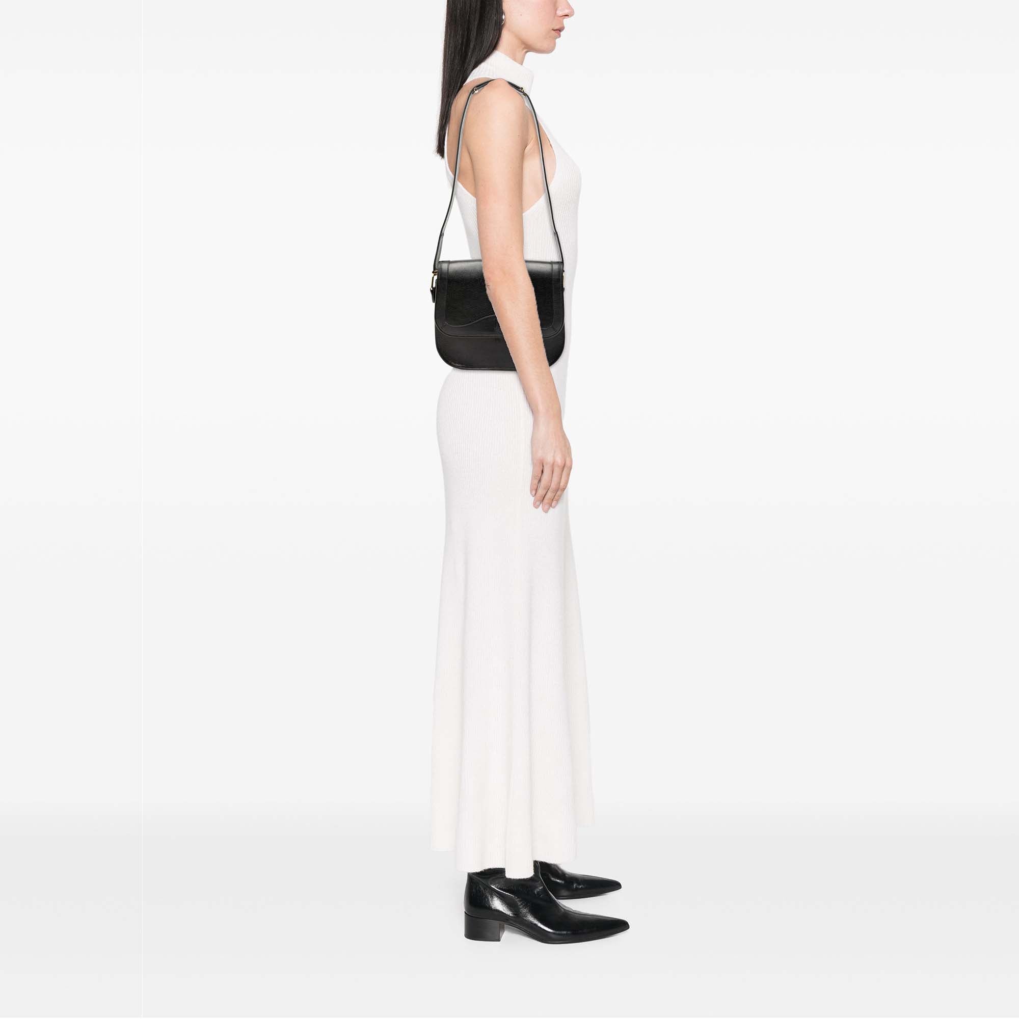 Product Details: Black Dior Leather Flap Shoulder Bag. This shoulder bag features a leather body, an adjustable flat leather strap, and a front flap with magnetic snap closure. 7.9" L x 9.1" W x 2.6" D.