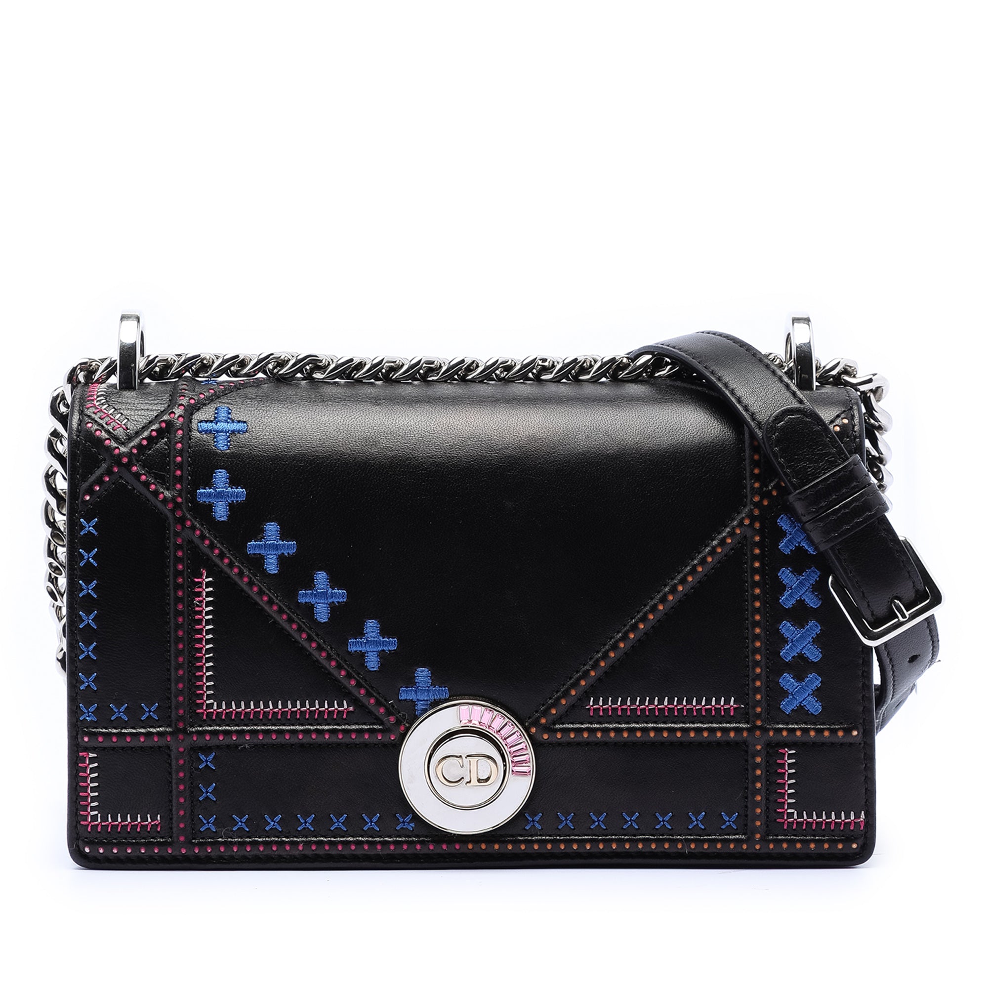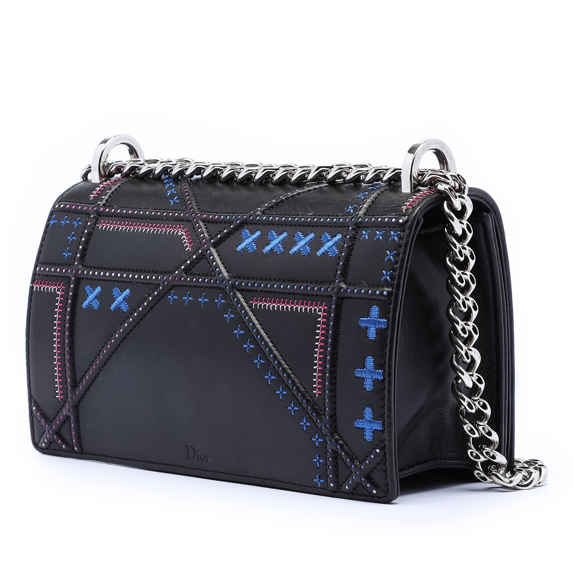 Product Details: Black Dior Medium Calfskin Stitch Diorama Flap Crossbody Bag. The Diorama features a leather body, a chain link shoulder strap with leather guard, a front flap with a push lock closure, and interior zip and slip pockets. 5.1" L x 8.7" W x 2.4" D. Serial number 13-BO-1126.