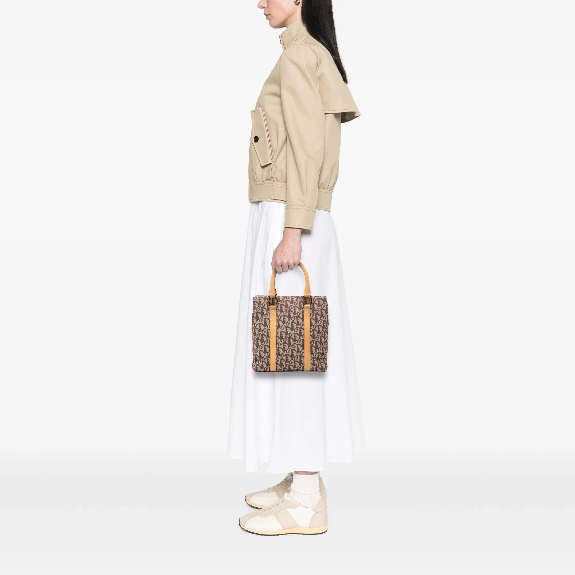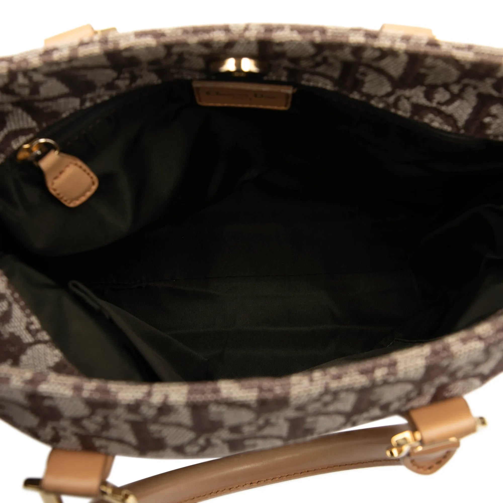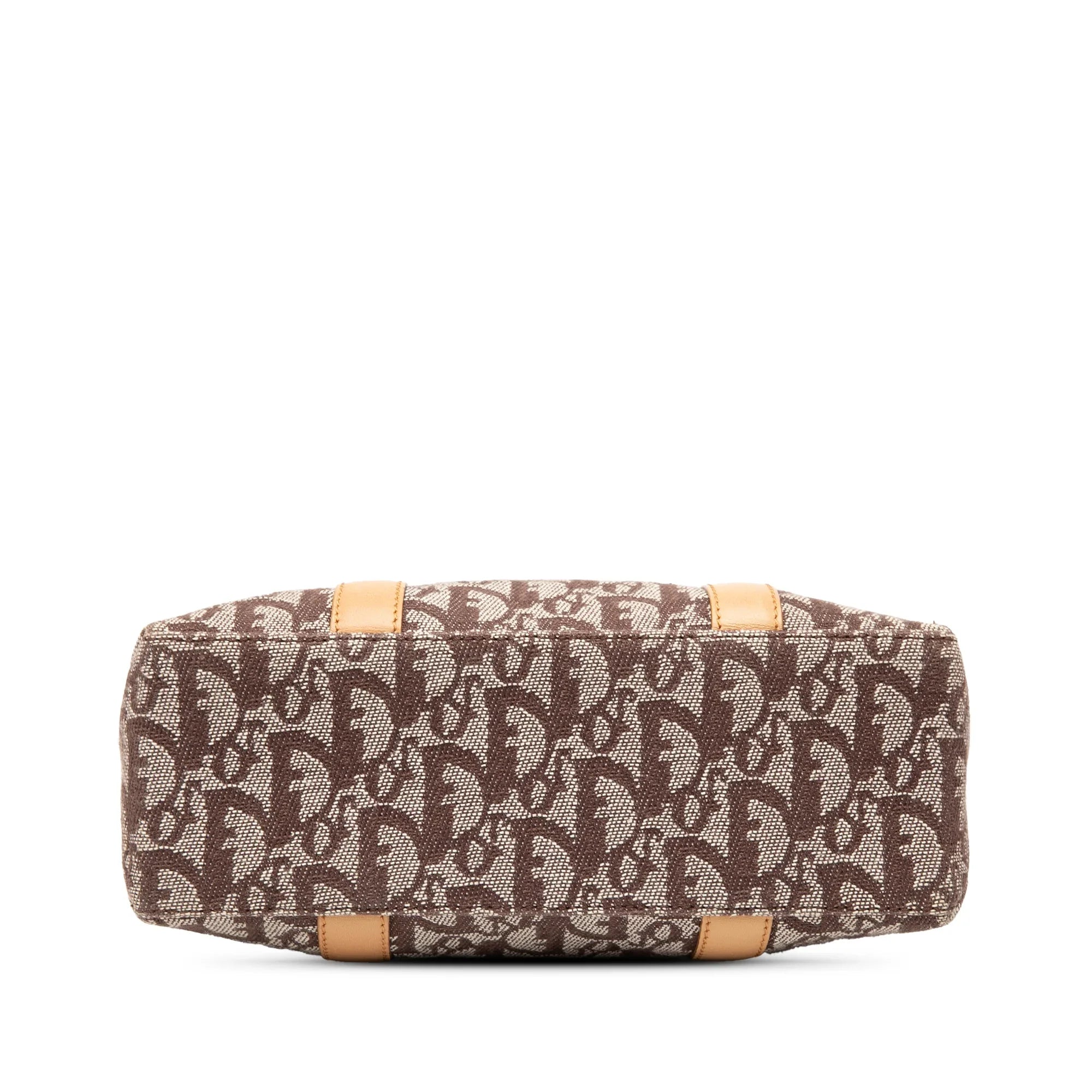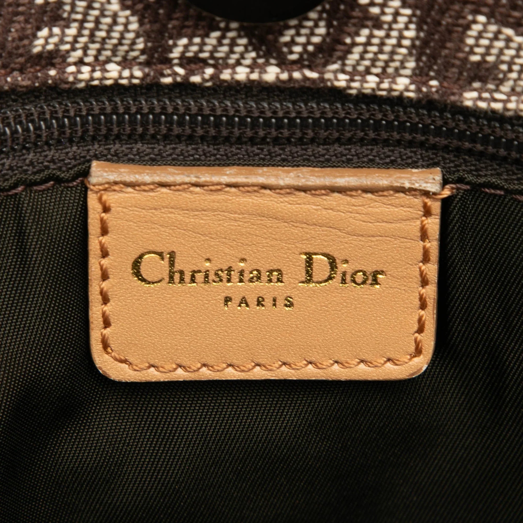 Product Details: Brown Dior Diorissimo Trotter Canvas Tote. This tote bag features a canvas body with leather trim, rolled leather handles, an open top with magnetic snap closure, and interior zip and slip pockets. 9.4" L x 9.1" W x 3.1" D, 4.3" drop. Serial number BOC0111.