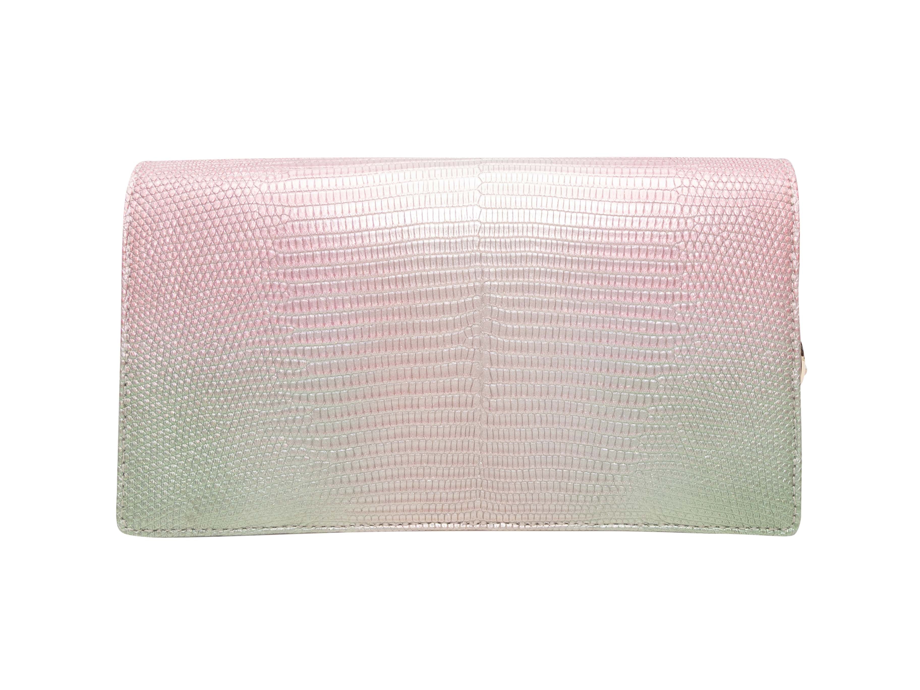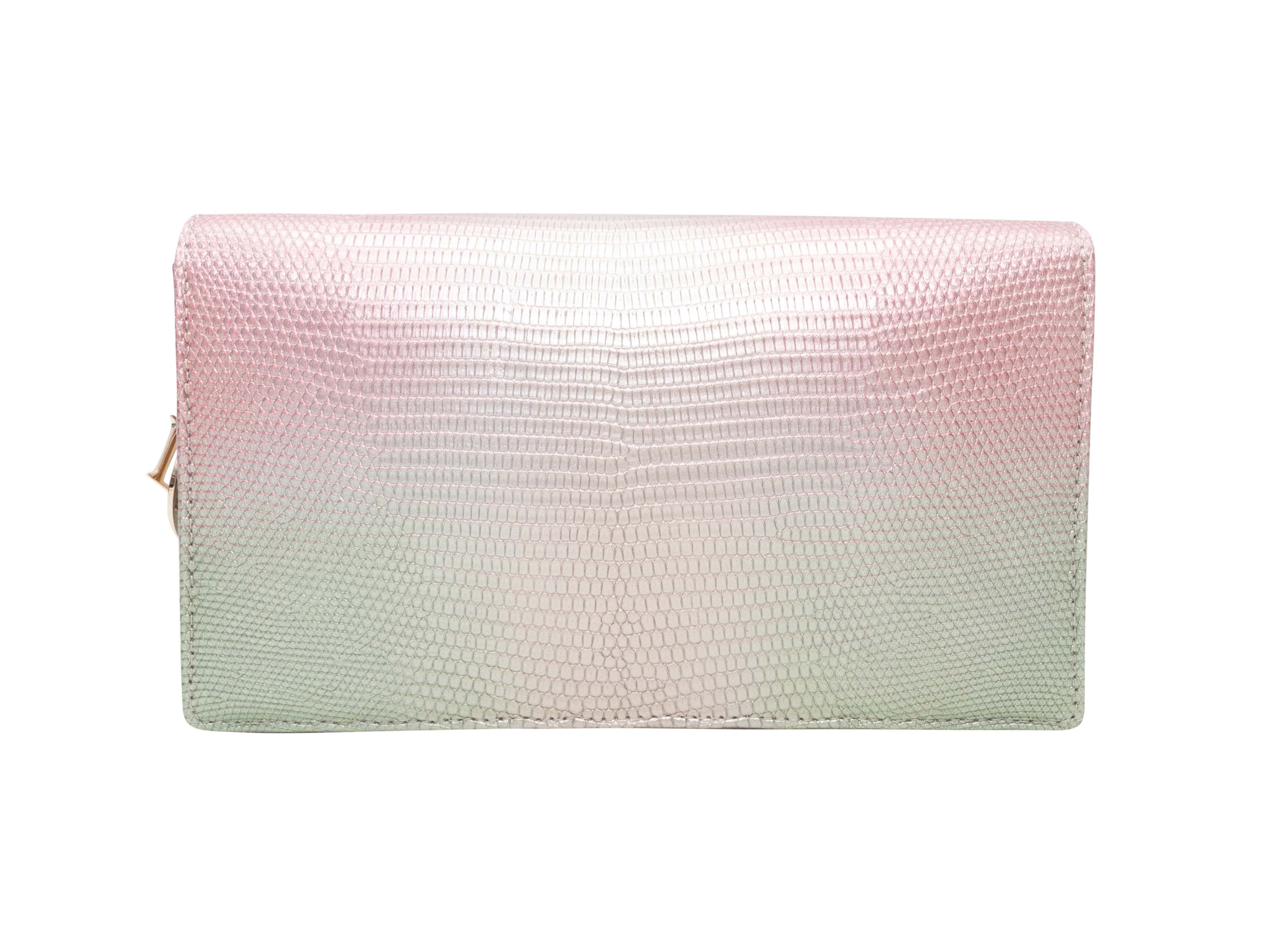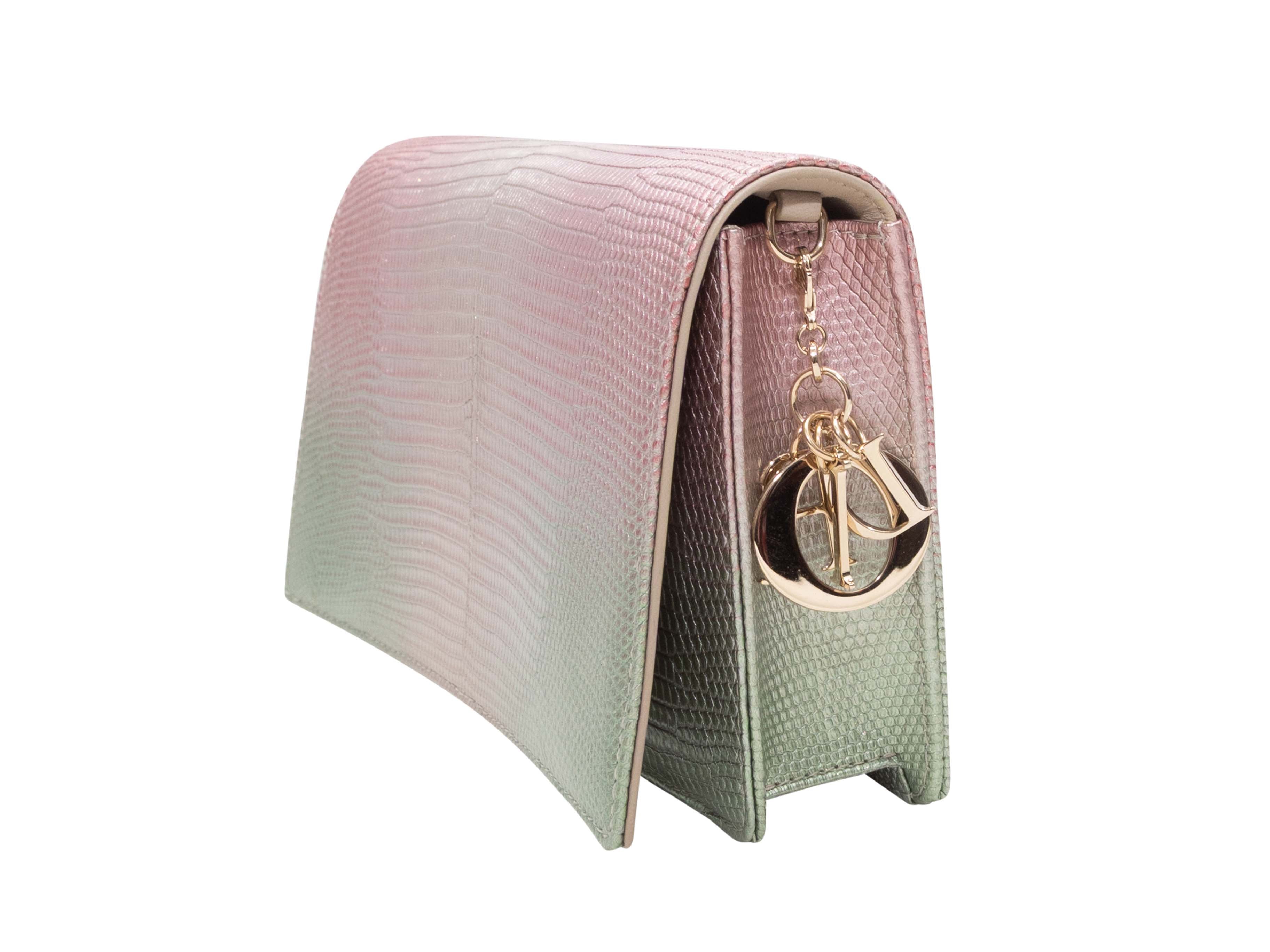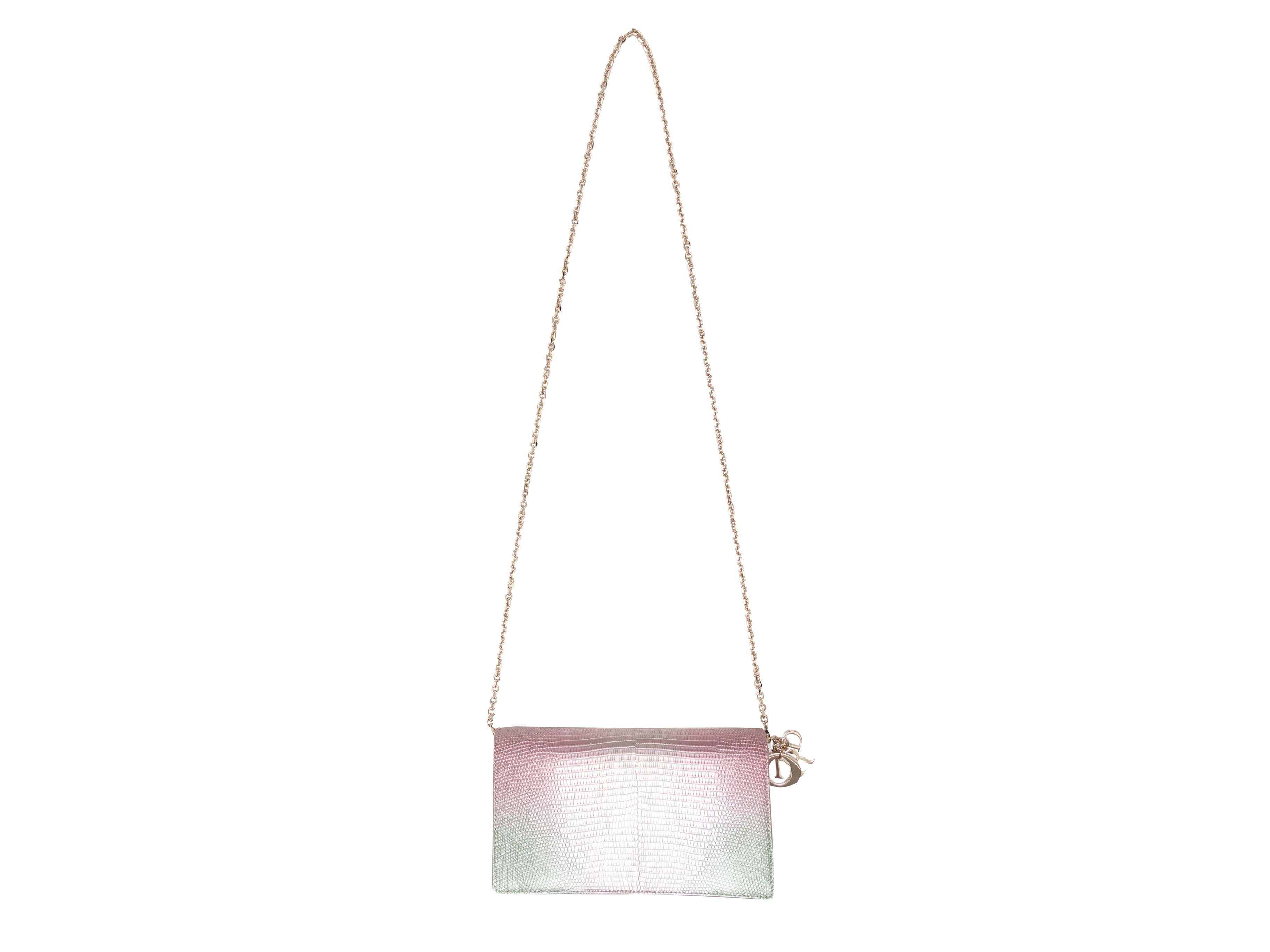 Product Details: Light Pink & Green Christian Dior 2022 Ombre Lizard Clutch-On-Chain. This clutch features an ombre lizard body, gold-tone hardware, a single chain-link strap, and a front flap closure. 8.5" L x 5" H x 2.5" D, 22.5" shoulder strap drop.