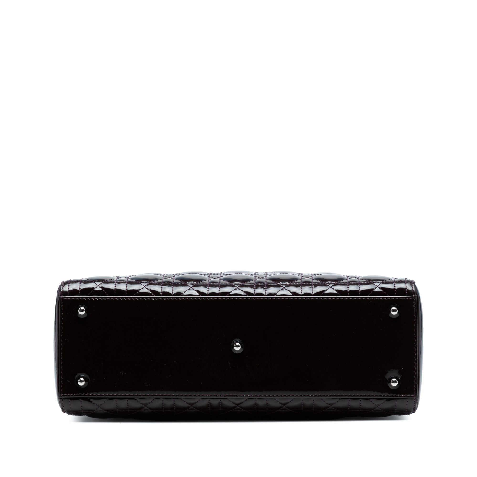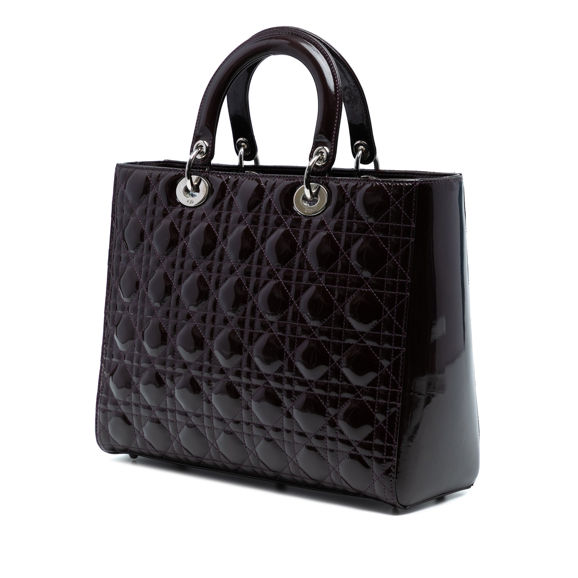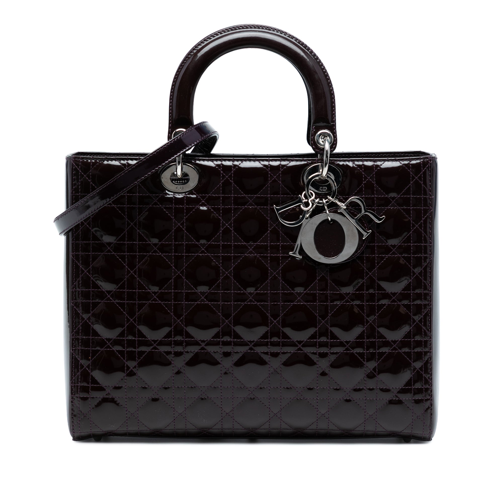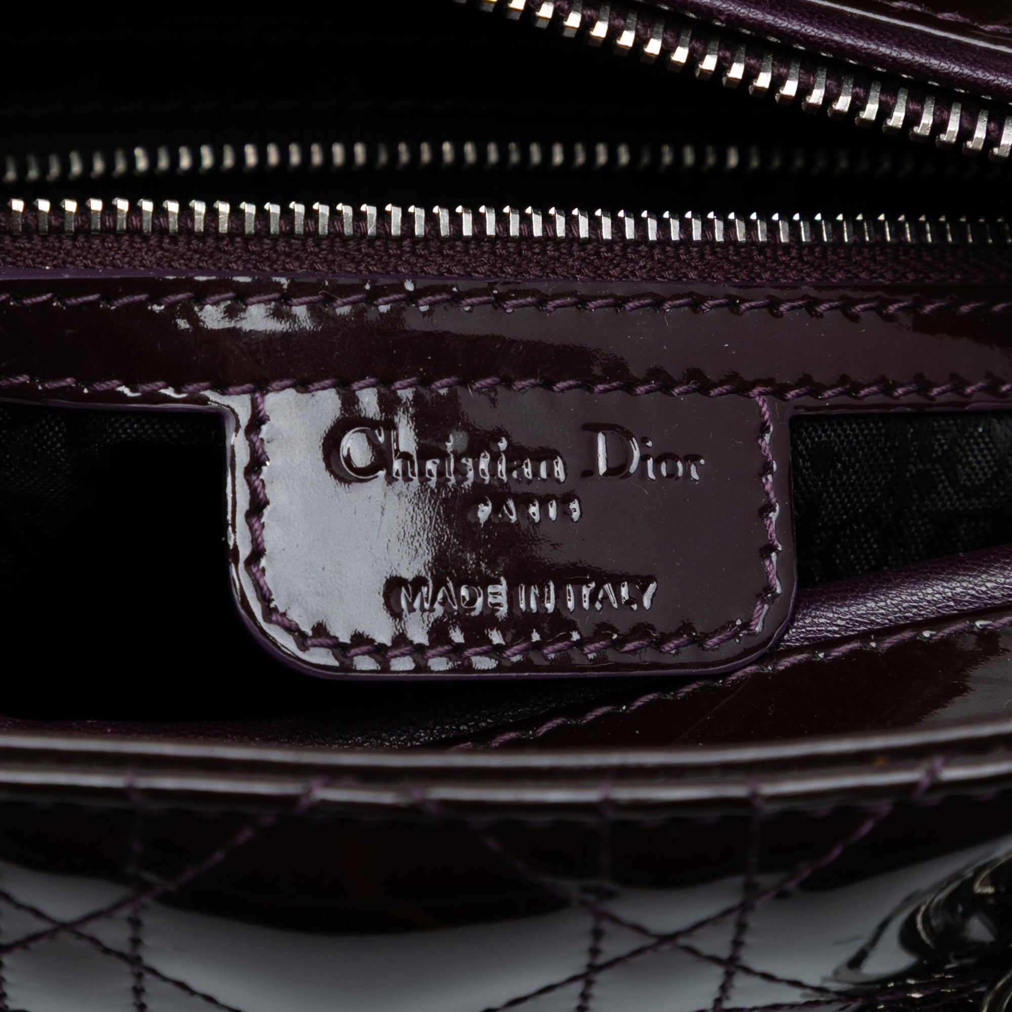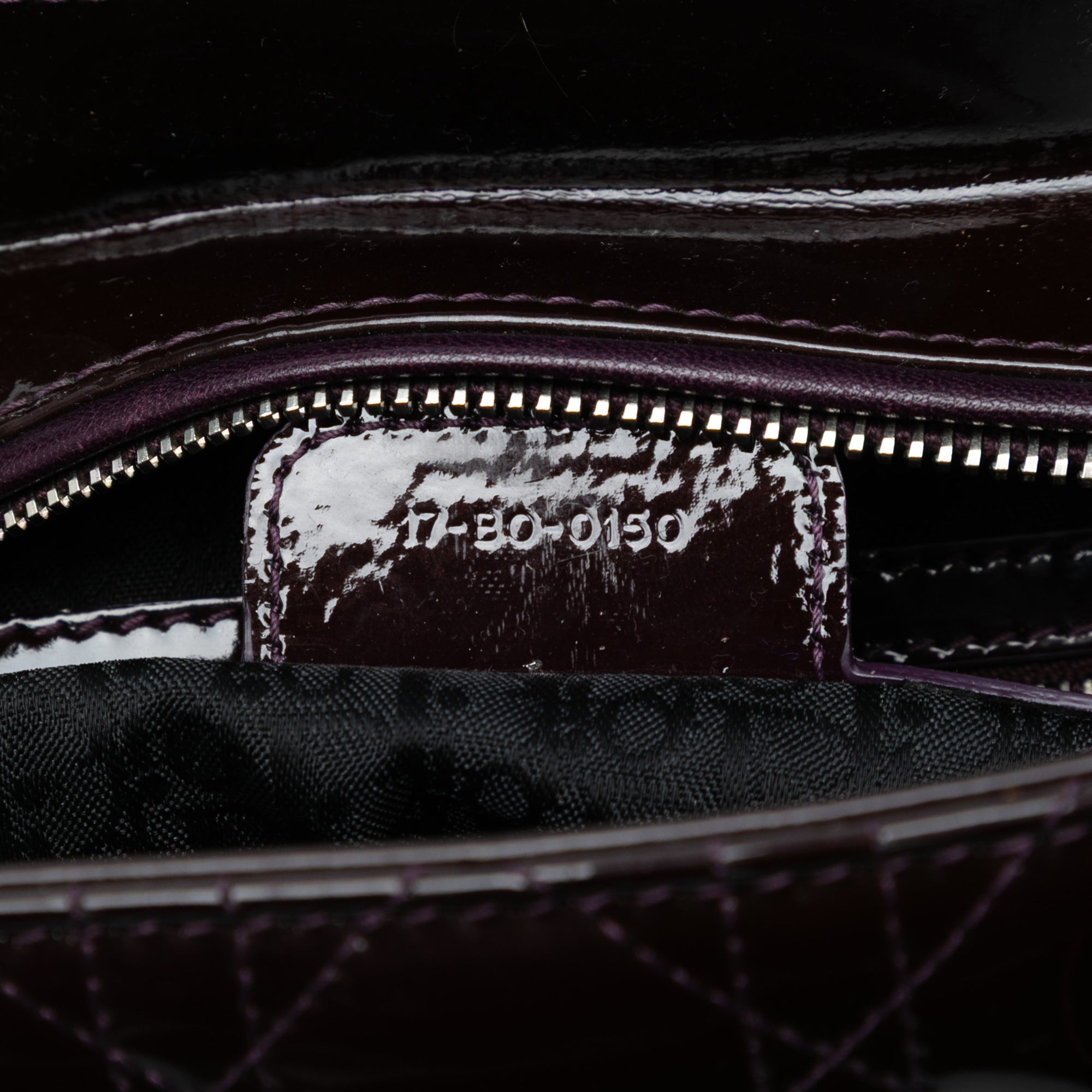 Product Details: Purple Dior Large Patent Cannage Lady Dior Satchel. The Lady Dior features a quilted patent leather body, rolled top handles, a detachable flat leather strap, a top zip closure, and an interior zip pocket. 10.2" L x 12.6" W x 3.5" D, 3.9" drop. Serial number 17-BO-0150.