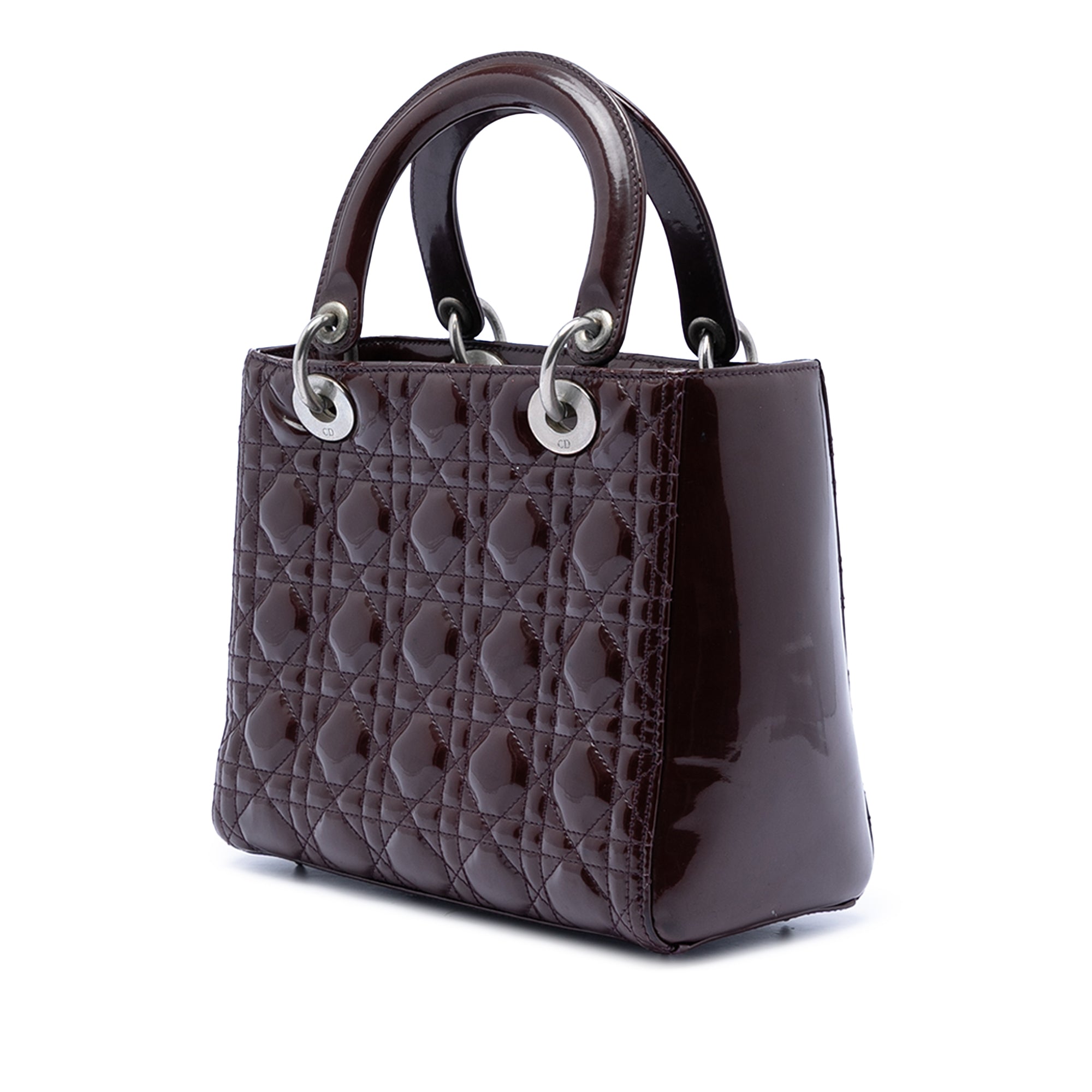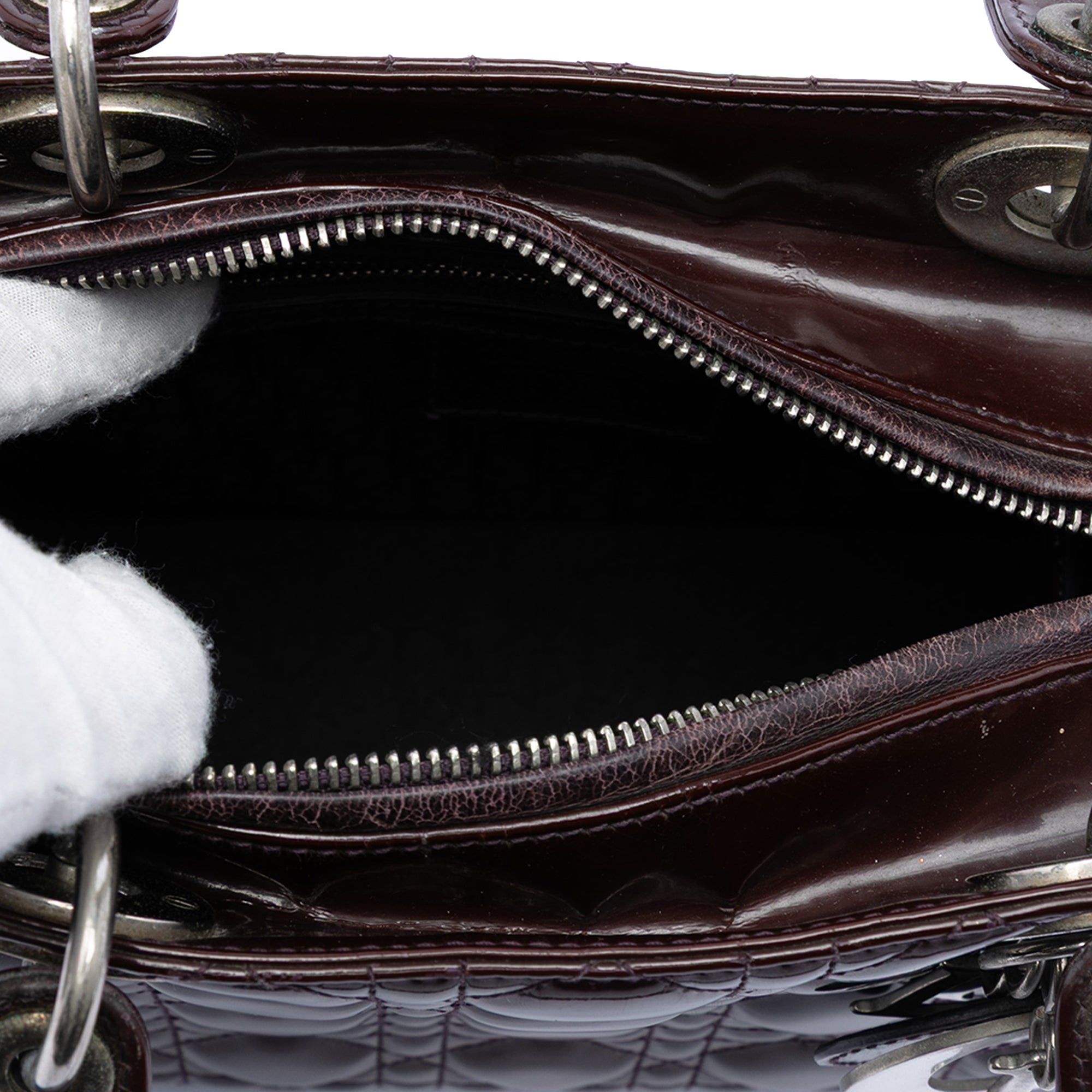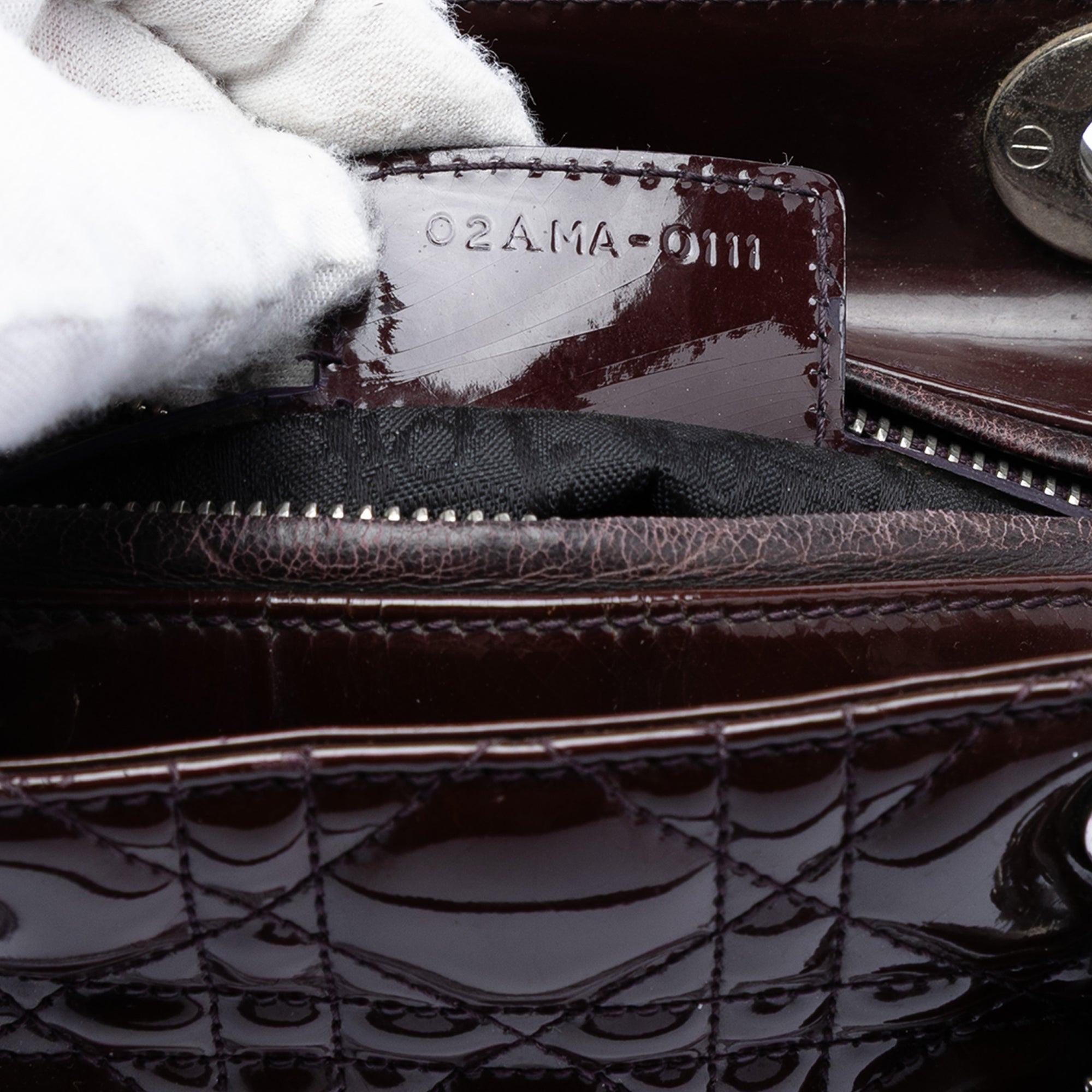Product Details: Purple Dior Medium Patent Cannage Lady Dior Satchel. The Lady Dior features a quilted patent leather body, flat leather top handles, a top zip closure, and an interior zip pocket. 7.5" L x 9.1" W x 3.5" D. Serial number 02AMA-0111.