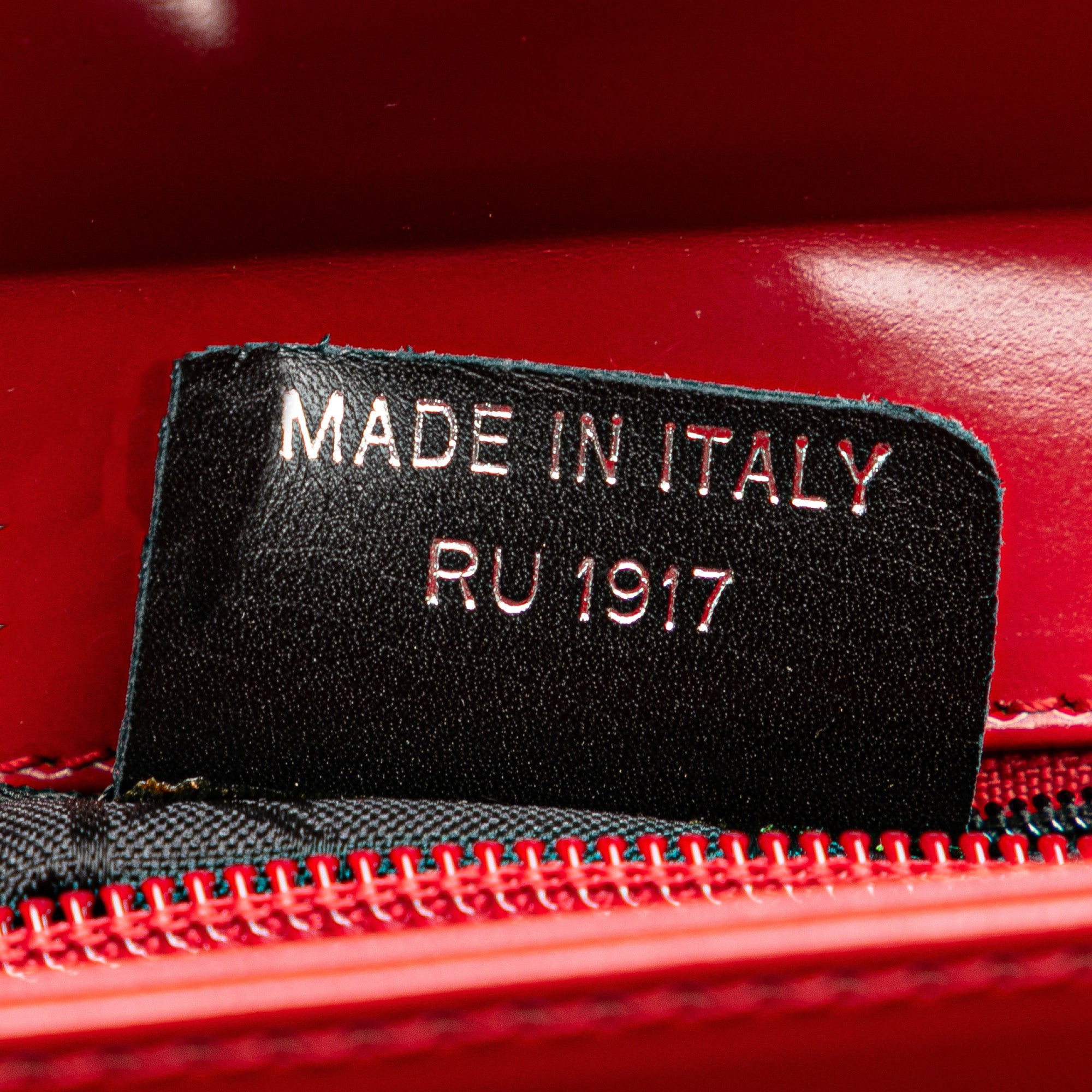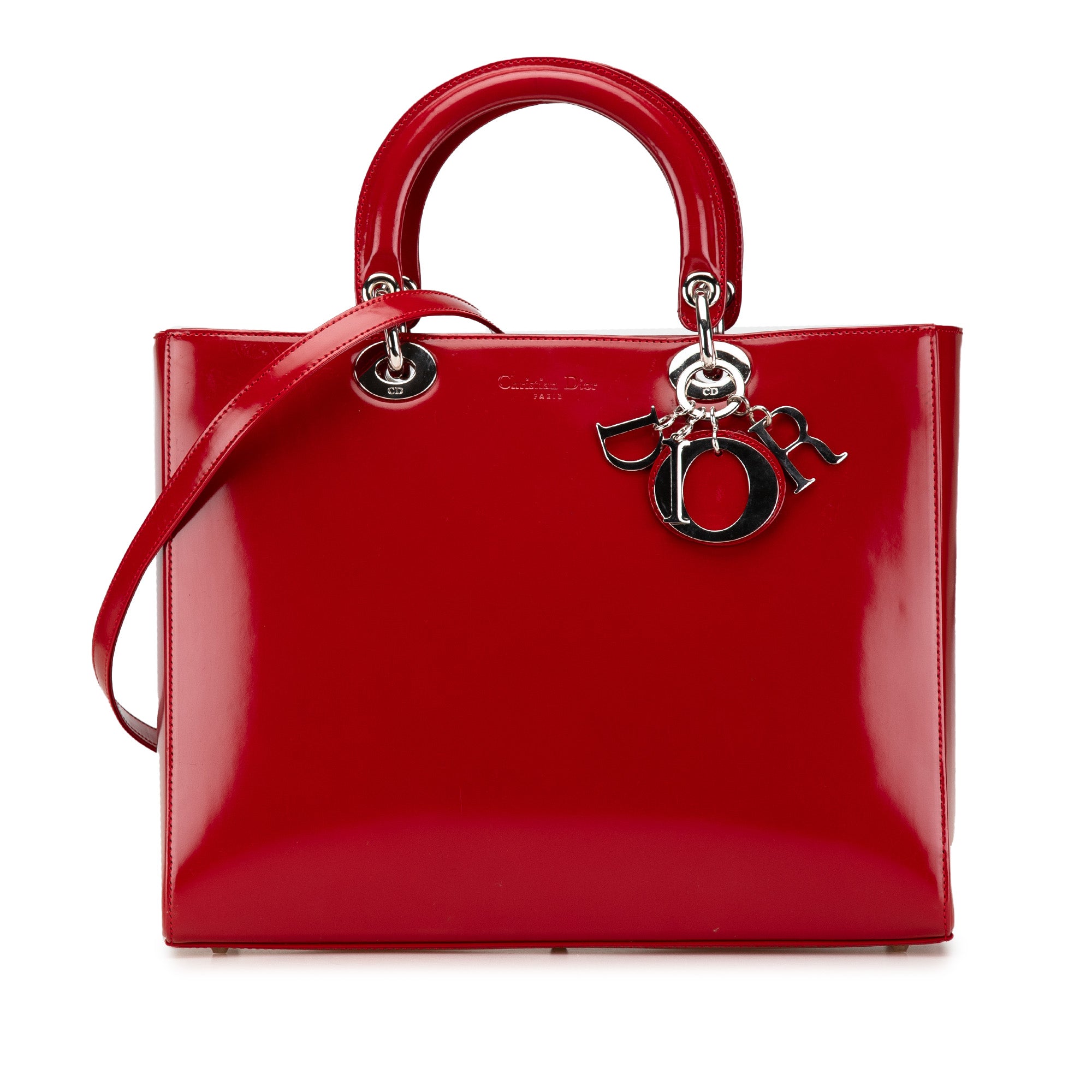 Product Details: Red Dior Large Patent Lady Dior Satchel. The Lady Dior satchel features a leather body, flat handles, a detachable flat leather strap, a top zip closure, and an interior zip pocket. 10.2" L x 12.4" W x 4.3" D, 3.7" drop. Serial number RU1917.