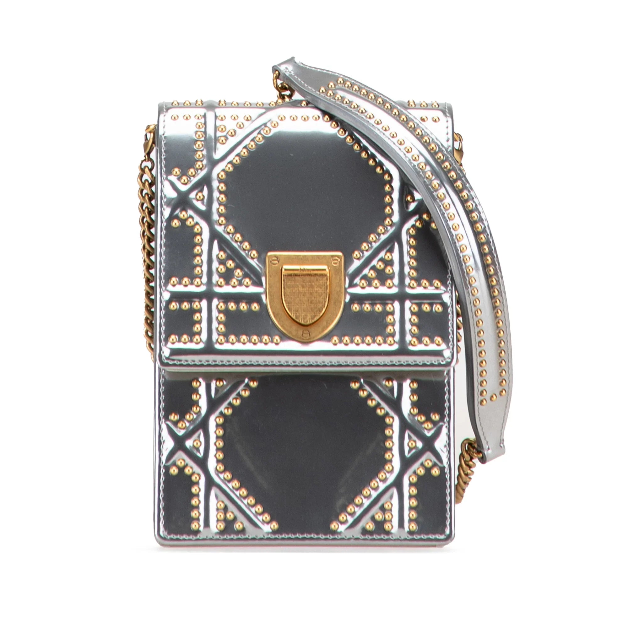 Product Details: Silver Dior Metallic Studded Calfskin Vertical Diorama Crossbody Bag. The Diorama features a studded leather body, a chain link strap with leather guard, a front flap with a metal push lock closure, and an interior slip pocket 6.7" L x 4.3" W x 3.5" D. Serial number 08-BO-0118.