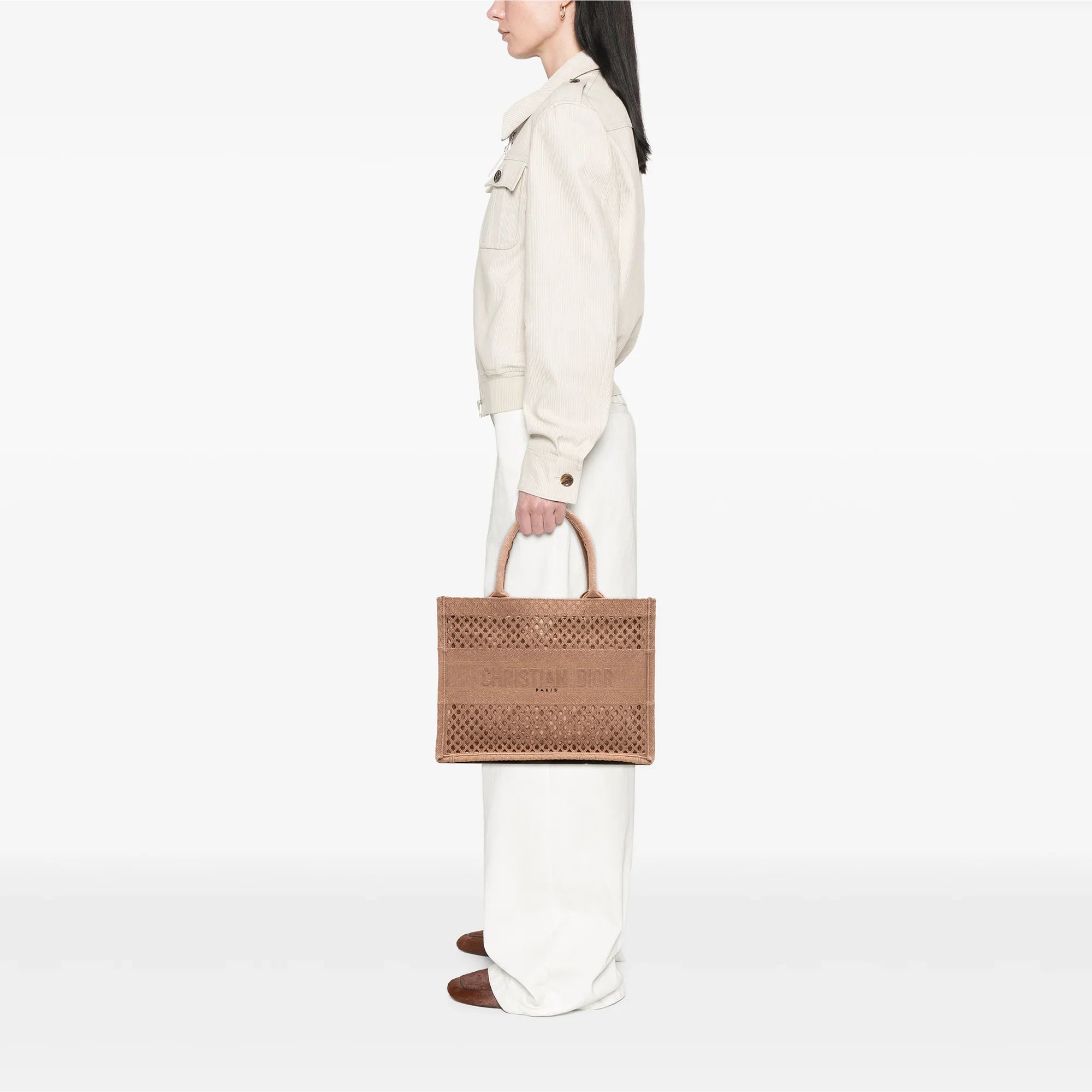 Product Details: Brown Dior Medium Embroidered Mesh Book Tote. This tote bag features a mesh canvas body, rolled handles, an open top, and interior zip and slip pockets. 11" L x 14.2" W x 6.9" D, 6.3" drop. Serial number 50-MA-0280.
