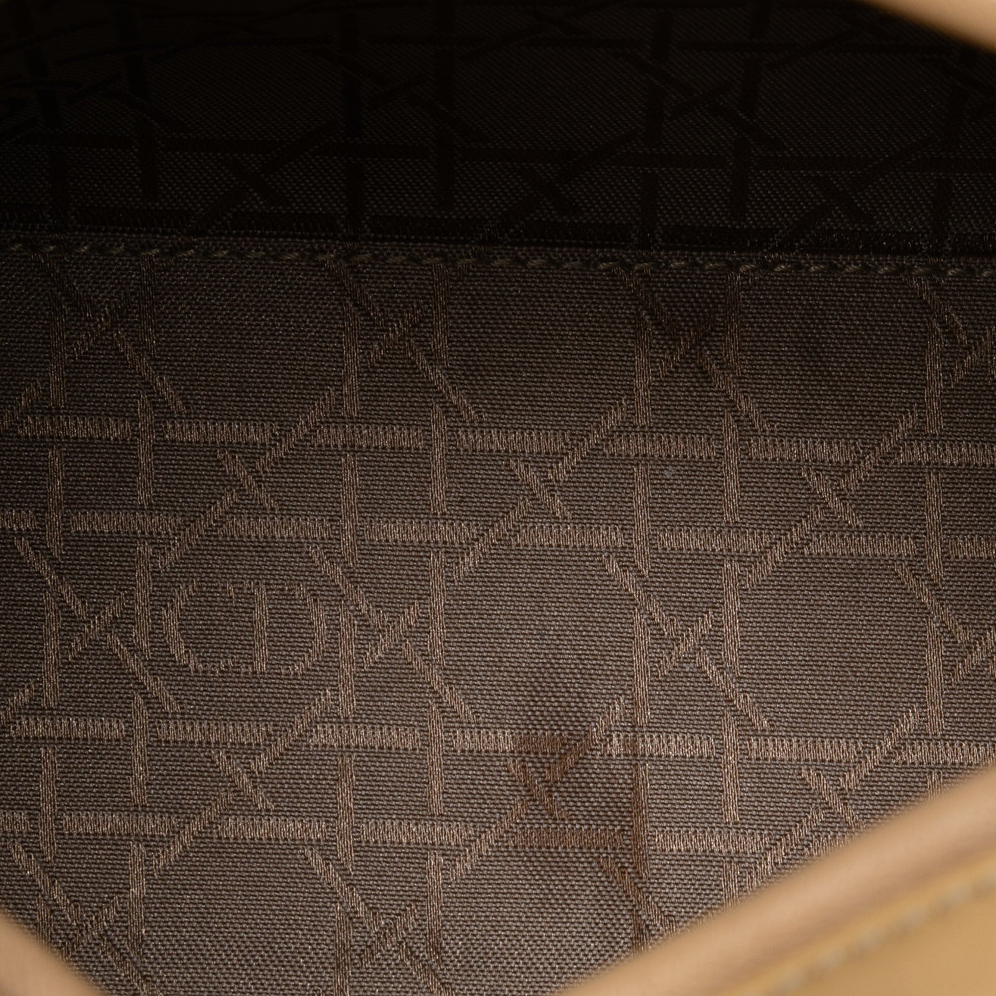 Product Details: Tan Dior Medium Patent Cannage Lady Dior Satchel. The Lady Dior features a quilted patent leather body, flat leather top handles, a detachable flat leather shoulder strap, a top zip closure, and an interior zip pocket. 8.1" L x 9.3" W x 4.7" D, 3.9" drop. Serial number 16-BO-0134.