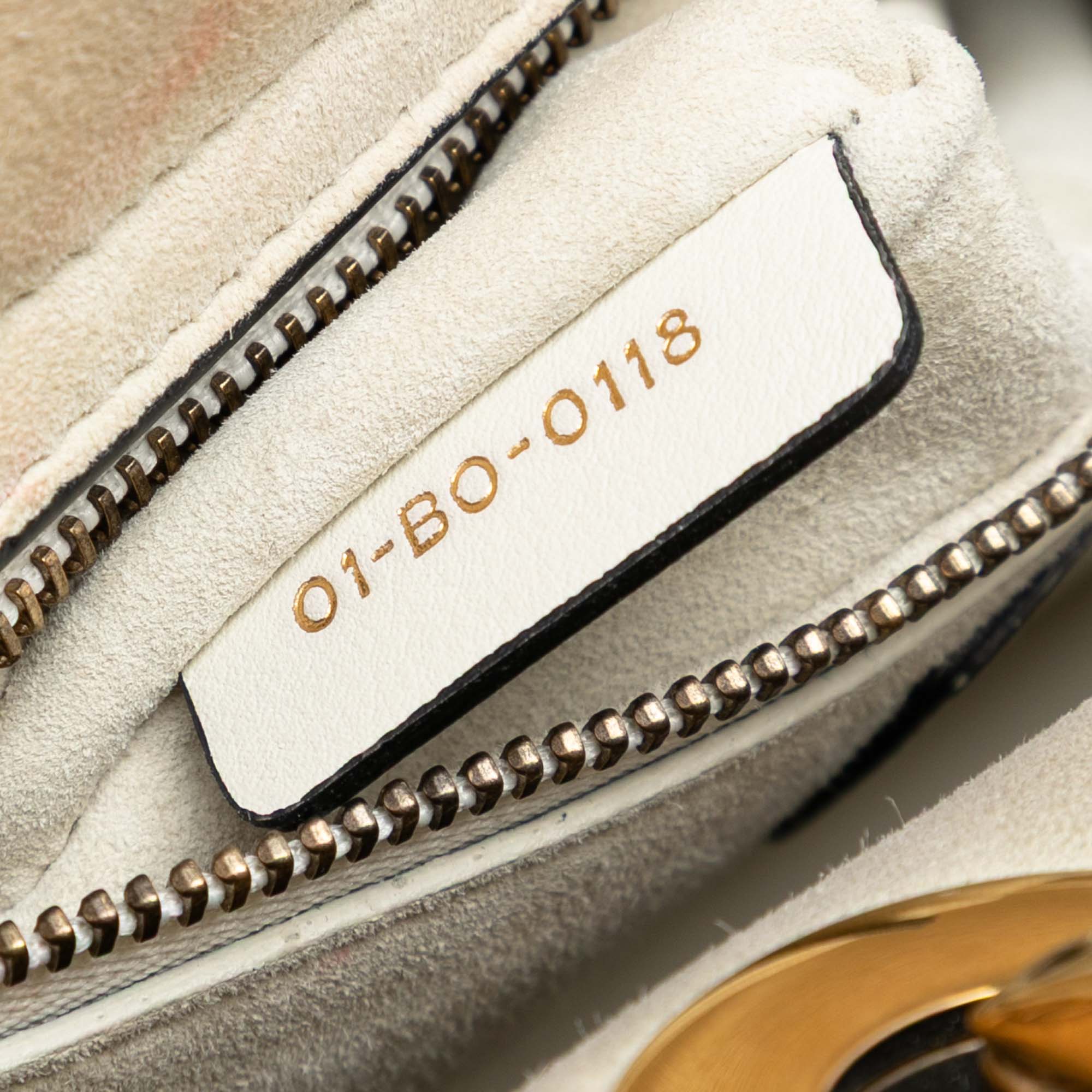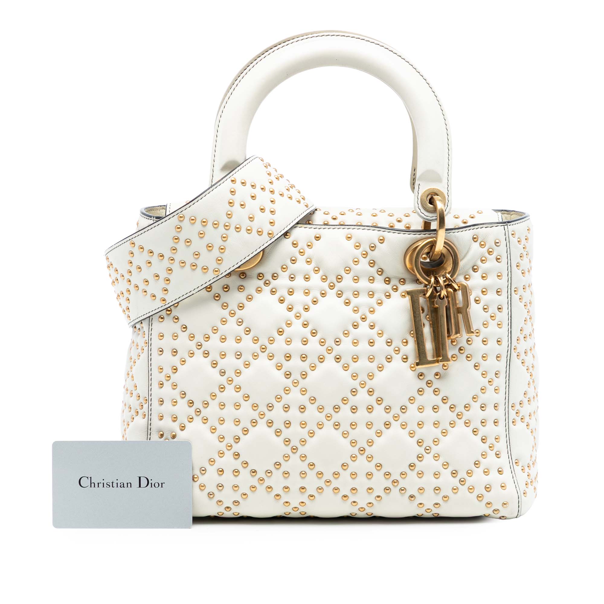 Product Details: White Dior Medium Lambskin Cannage Studded Supple Lady Dior Satchel. This satchel features a studded leather body, flat handles, a detachable flat strap, a fold in flap closure, and an interior zip pocket. 7.7" L x 9.3" W x 4.9" D, 4.1" drop. Serial number 01-BO-0118.