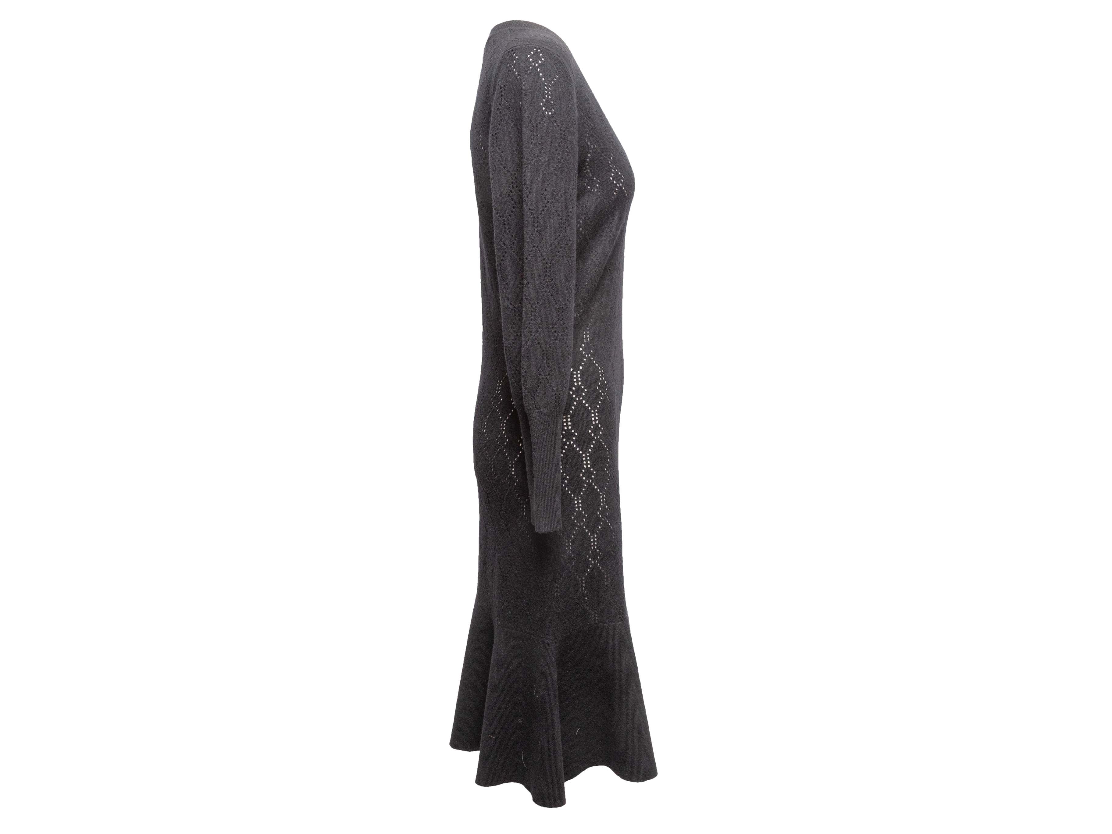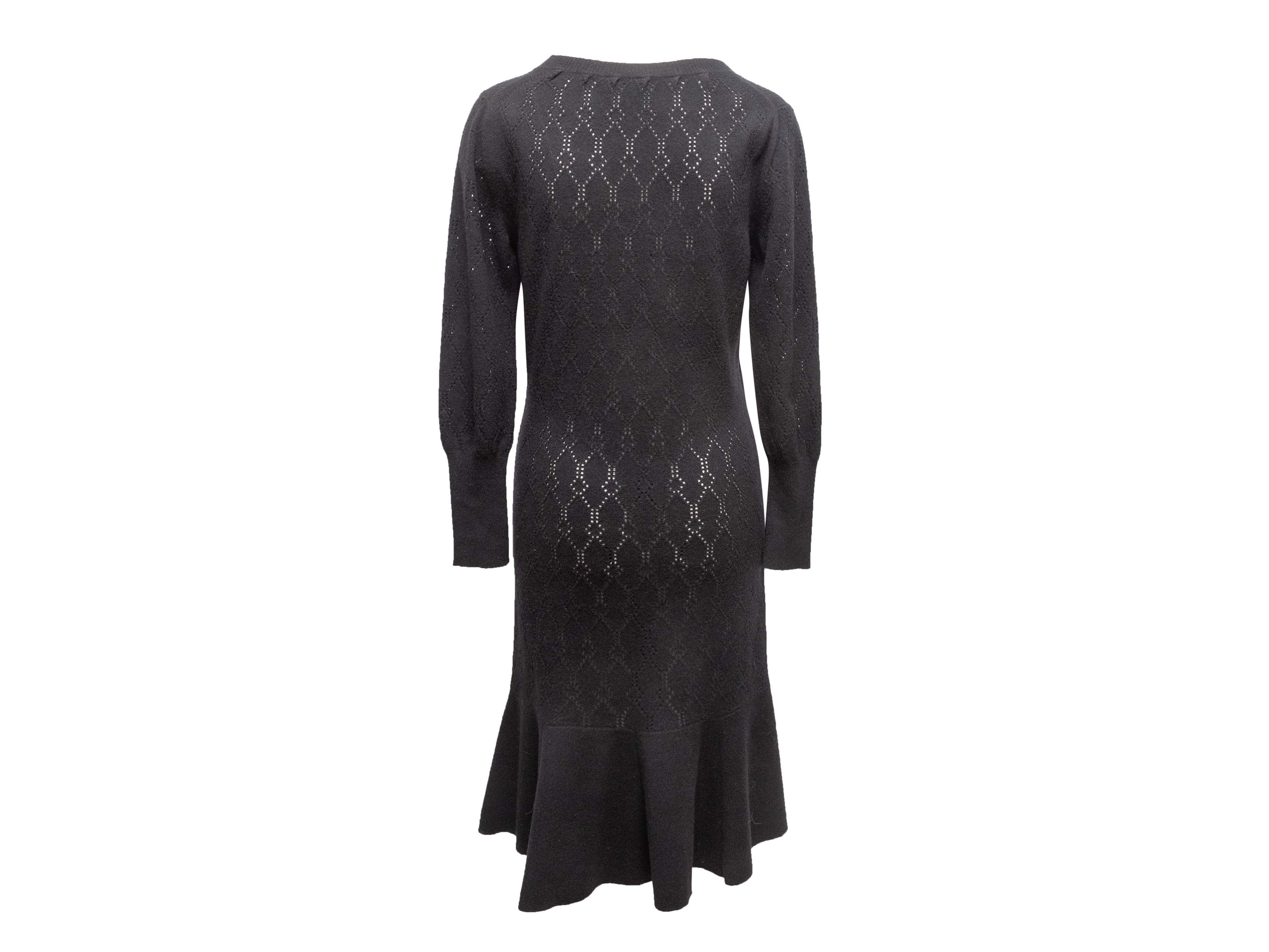 Product Details: Black open knit long sleeve dress by Louis Vuitton. V-neck. Flounce hem. 36" bust, 32.5" waist, 40.5" length, 16.5" shoulder width.