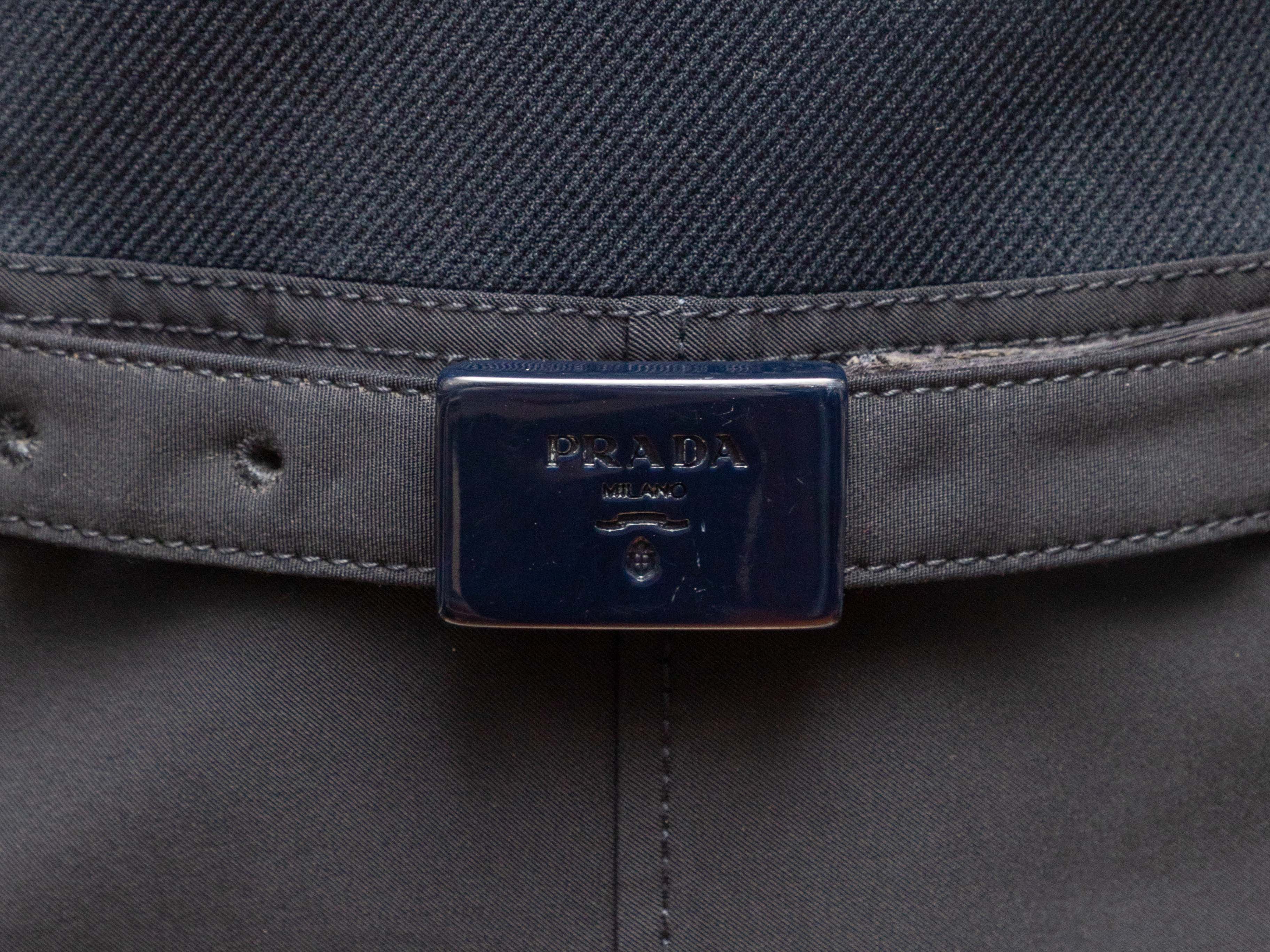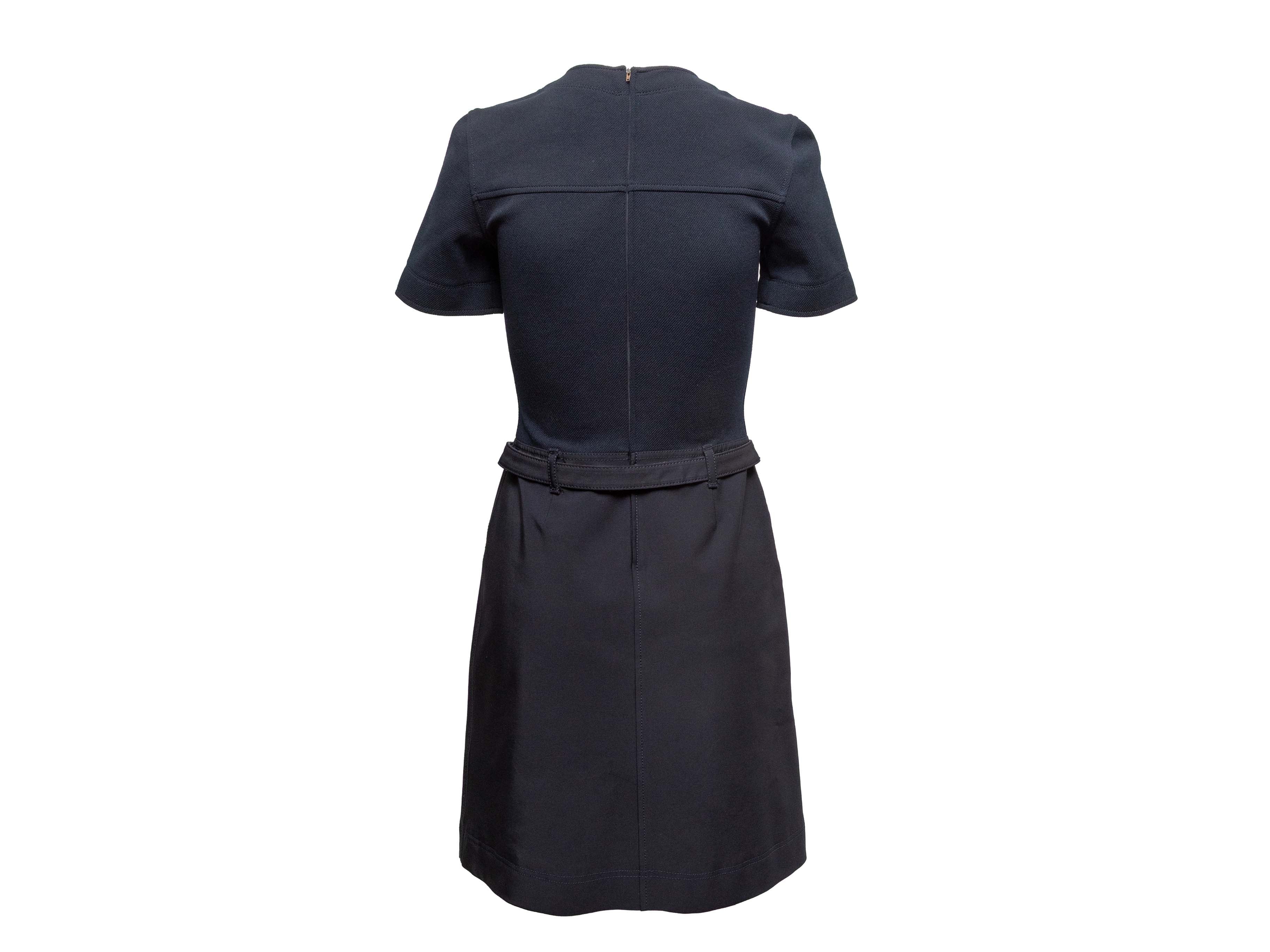 Product Details: Navy short sleeve belted dress by Prada. Crew neck. Logo belt at waist. Zip closure at back. 29.5" bust, 24.5" waist, 34.25" length, 14.5" shoulder width.