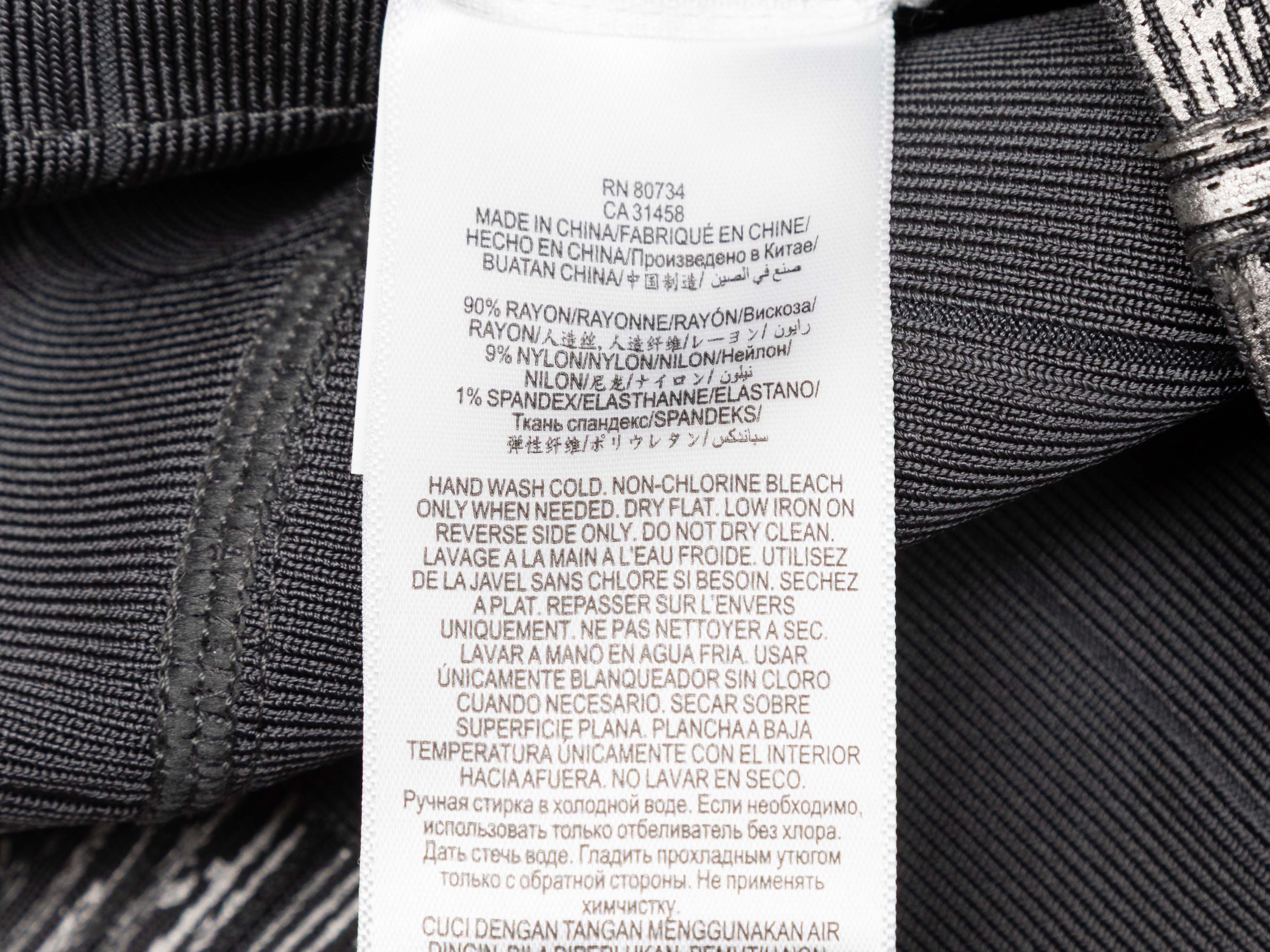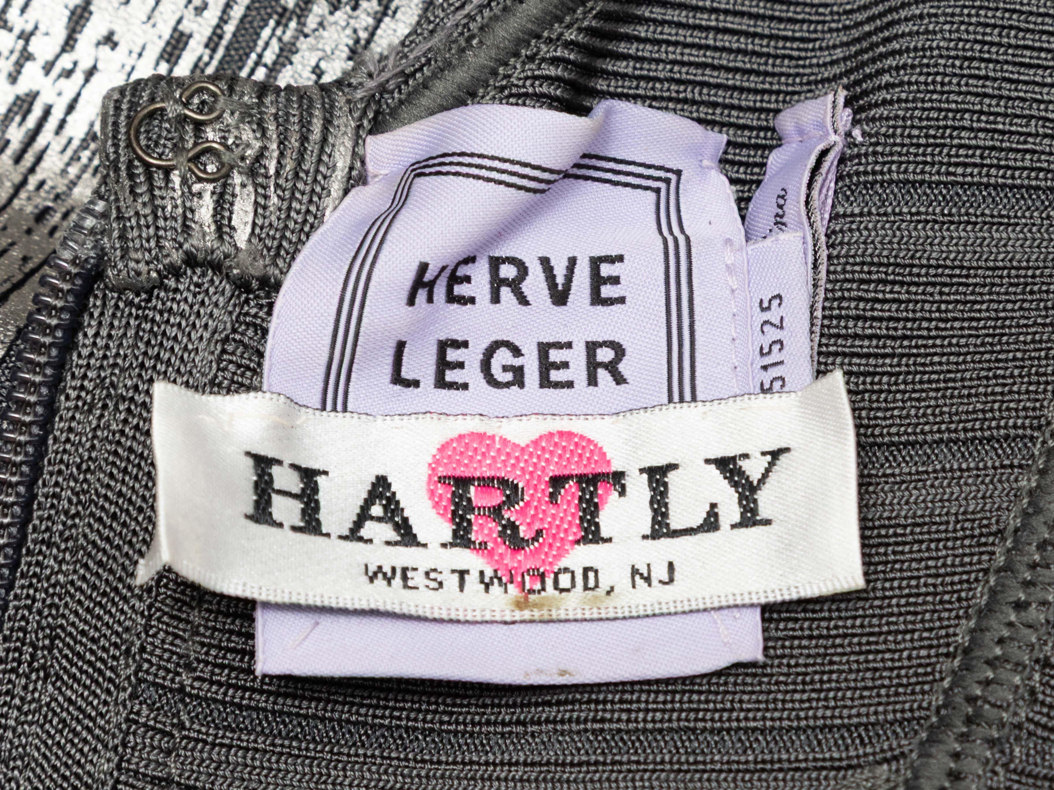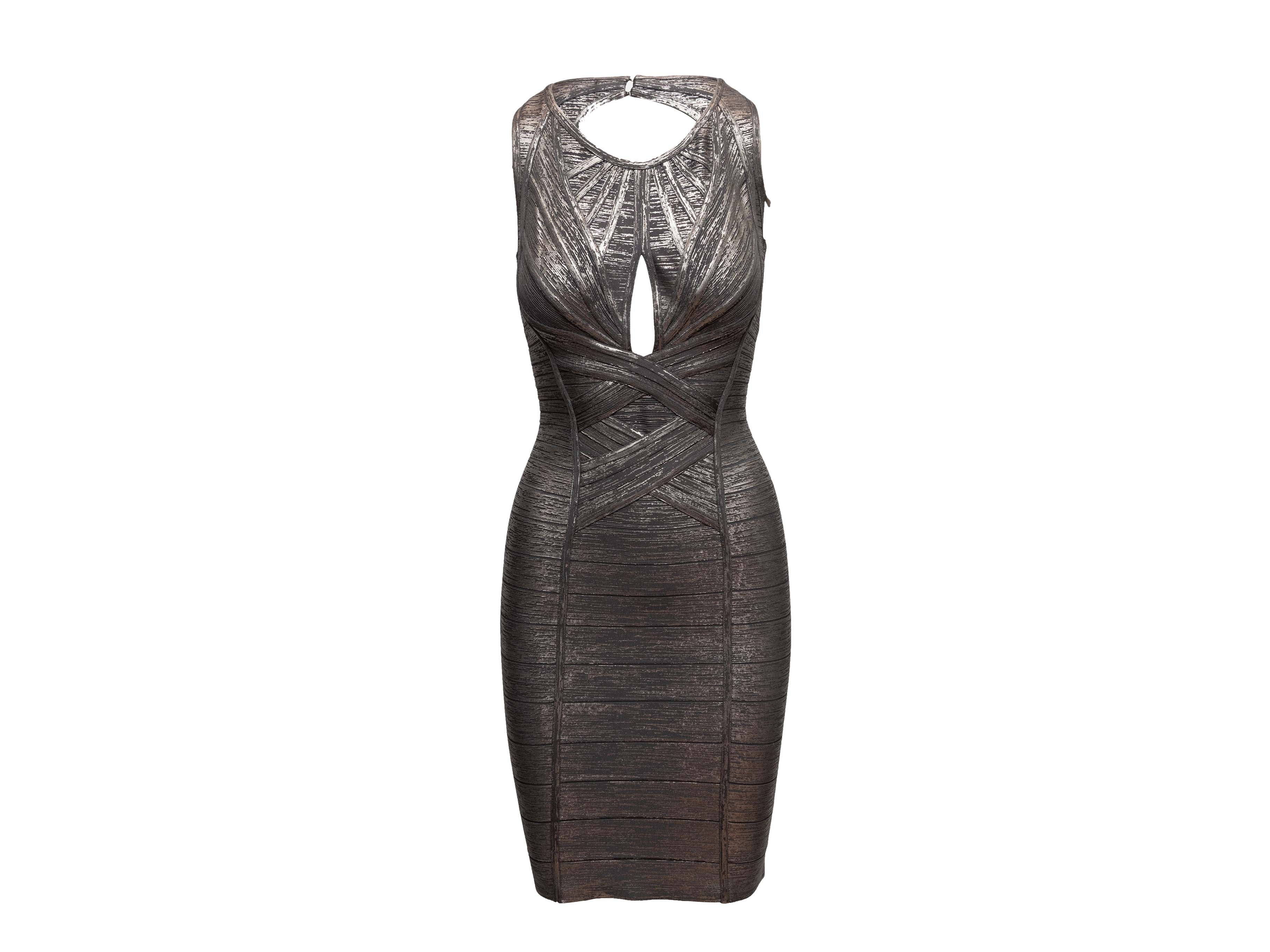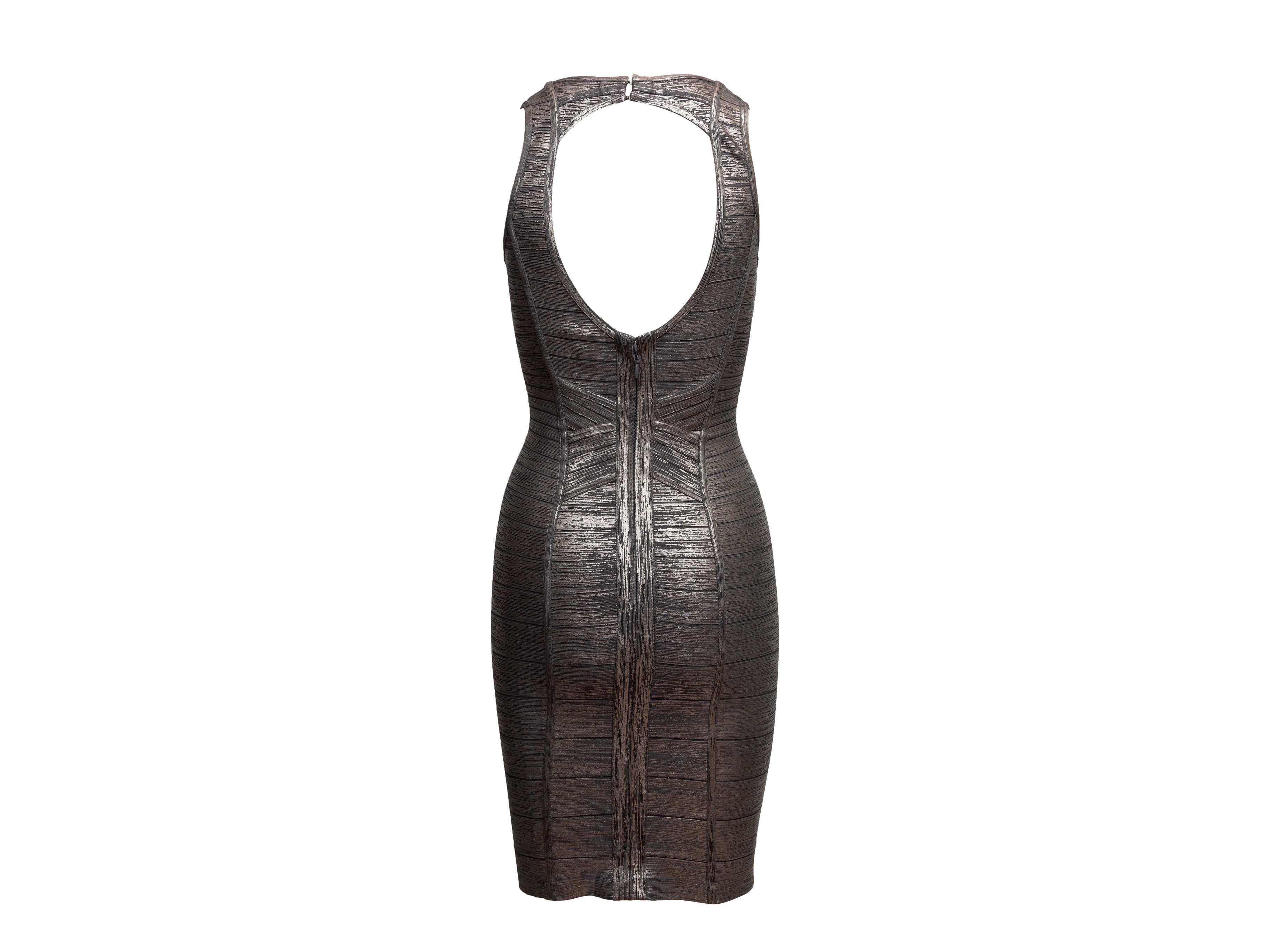 Product Details: Silver metallic sleeveless bandage dress by Herve Leger. Crew neck. Cutout at bust. Open back featuring zip and hook-and-eye closures. 28" bust, 23" waist, 36" length, 10.5" shoulder width.