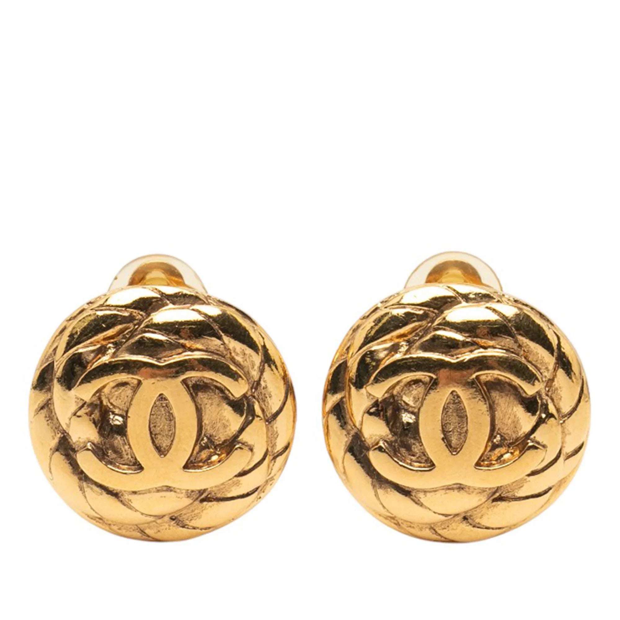 Product Details: Gold Chanel CC Gold Plated Clip On Earrings. These earrings feature a gold plated metal body and clip on closure. 0.8" L x 0.8" W x 0" D. Serial number 97P.