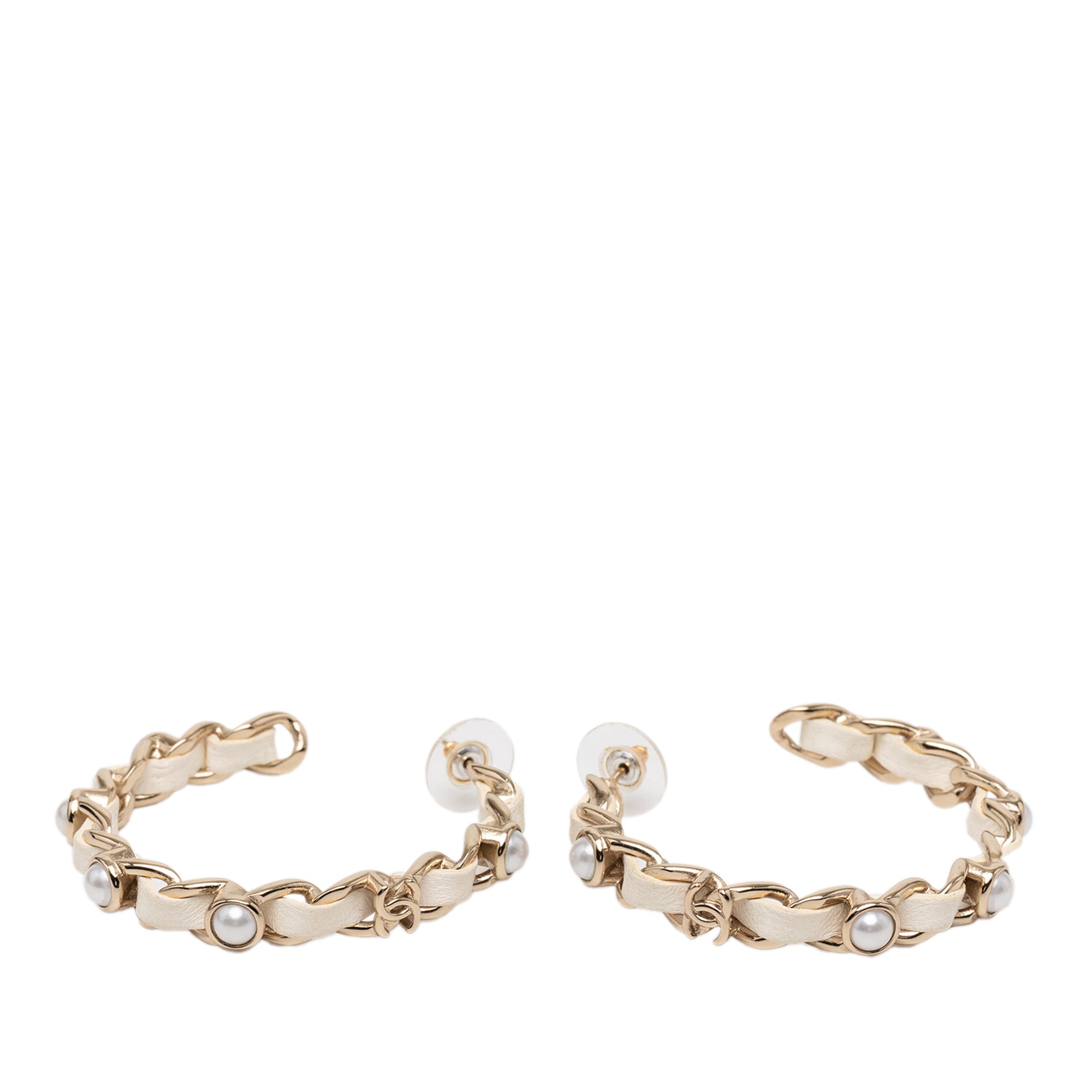 Gold Chanel CC Leather Woven Gold Plated Chain Faux Pearl Hoop Push Back Earrings