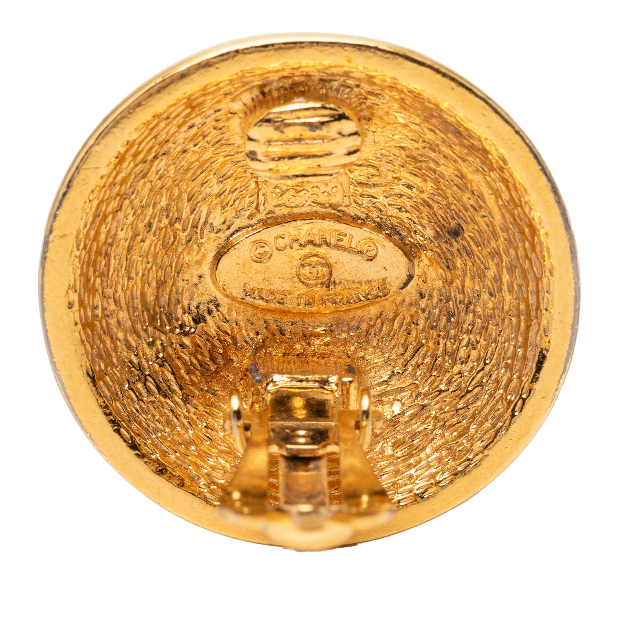 Product Details: Gold Chanel Gold Plated CC Quilted Round Clip On Earrings. These earrings feature a gold tone metal body and clip on closures. 1.2" L x 1.2" W x 0" D.