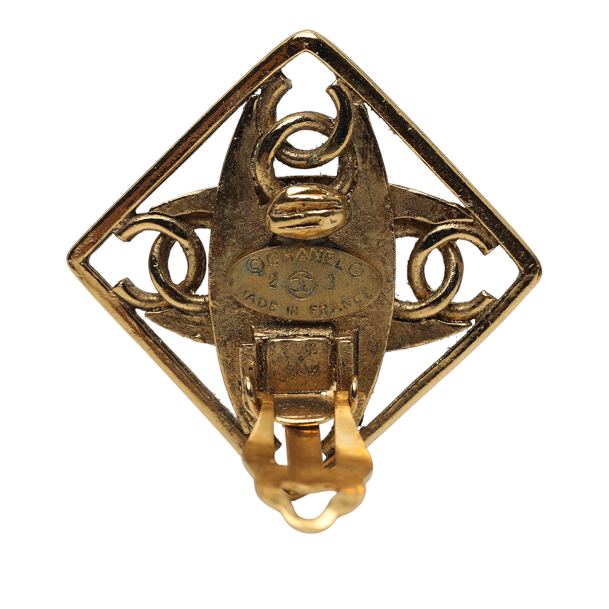 Product Details: Gold Chanel Gold Plated Faux Pearl CC Diamond Shaped Clip On Earrings. These earrings features a gold-plated metal body with faux pearls and clip-on closures. 1.5" L x 1.5" W x 0" D.