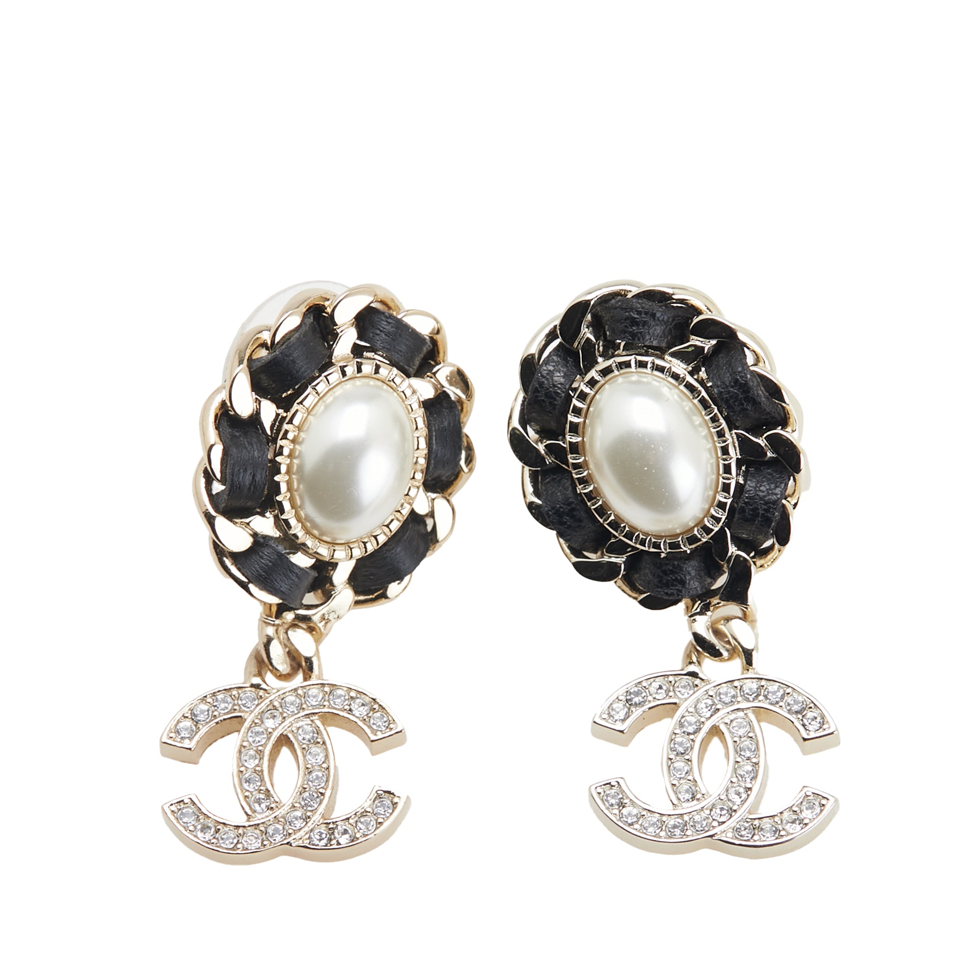 Gold Chanel Gold Plated Leather Woven Faux Pearl CC Crystal Drop Earrings - Designer Revival Gold Chanel Gold Plated Leather Woven Faux Pearl CC Crystal Drop Earrings - Designer Revival