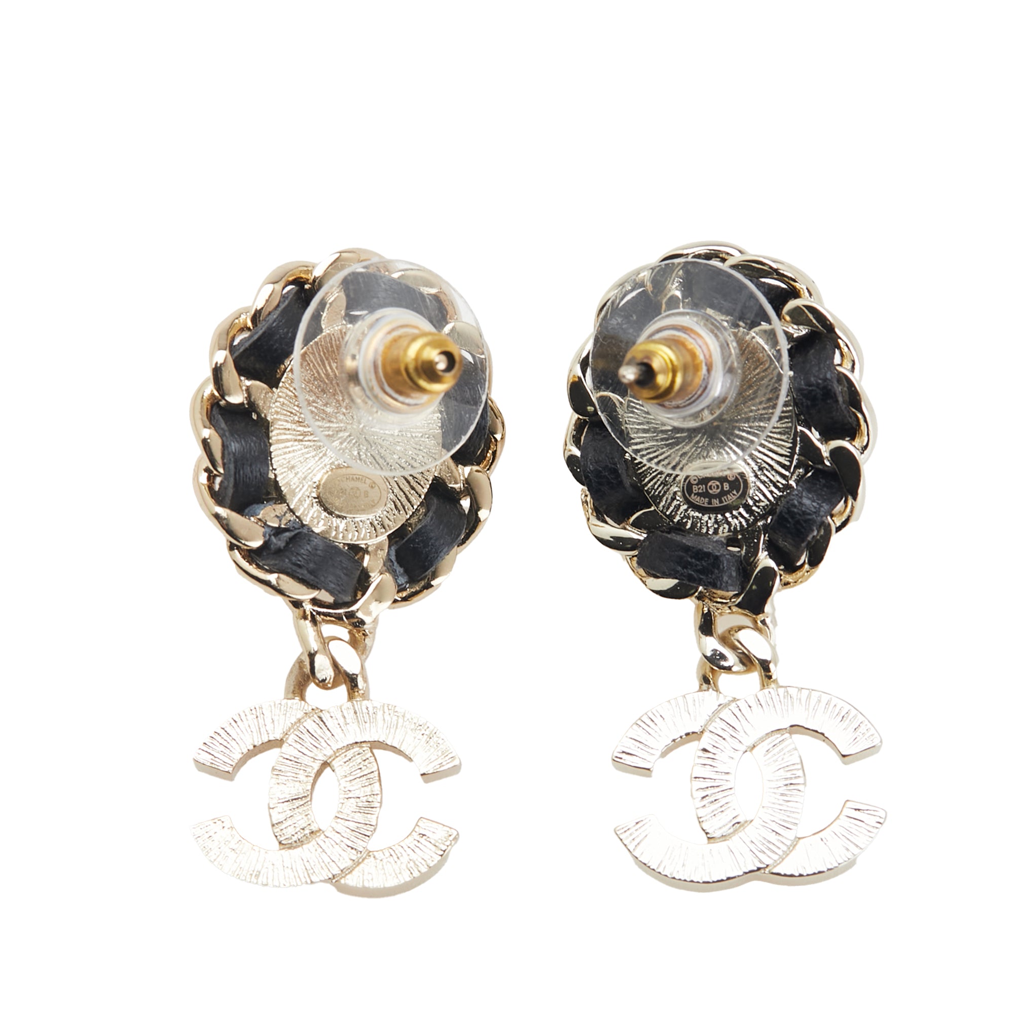 Product Details: Gold Chanel Gold Plated Leather Woven Faux Pearl CC Crystal Drop Earrings. These earrings feature a gold-plated body with leather-woven and faux pearl details, a rhinestone-embellished CC charm, and push back closure. 1.5" L x 0.7" W x 0" D.